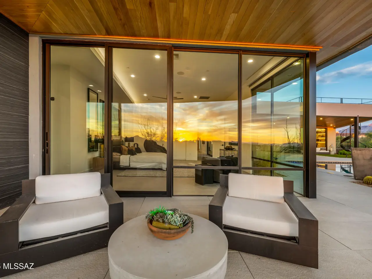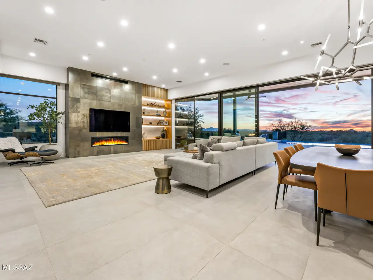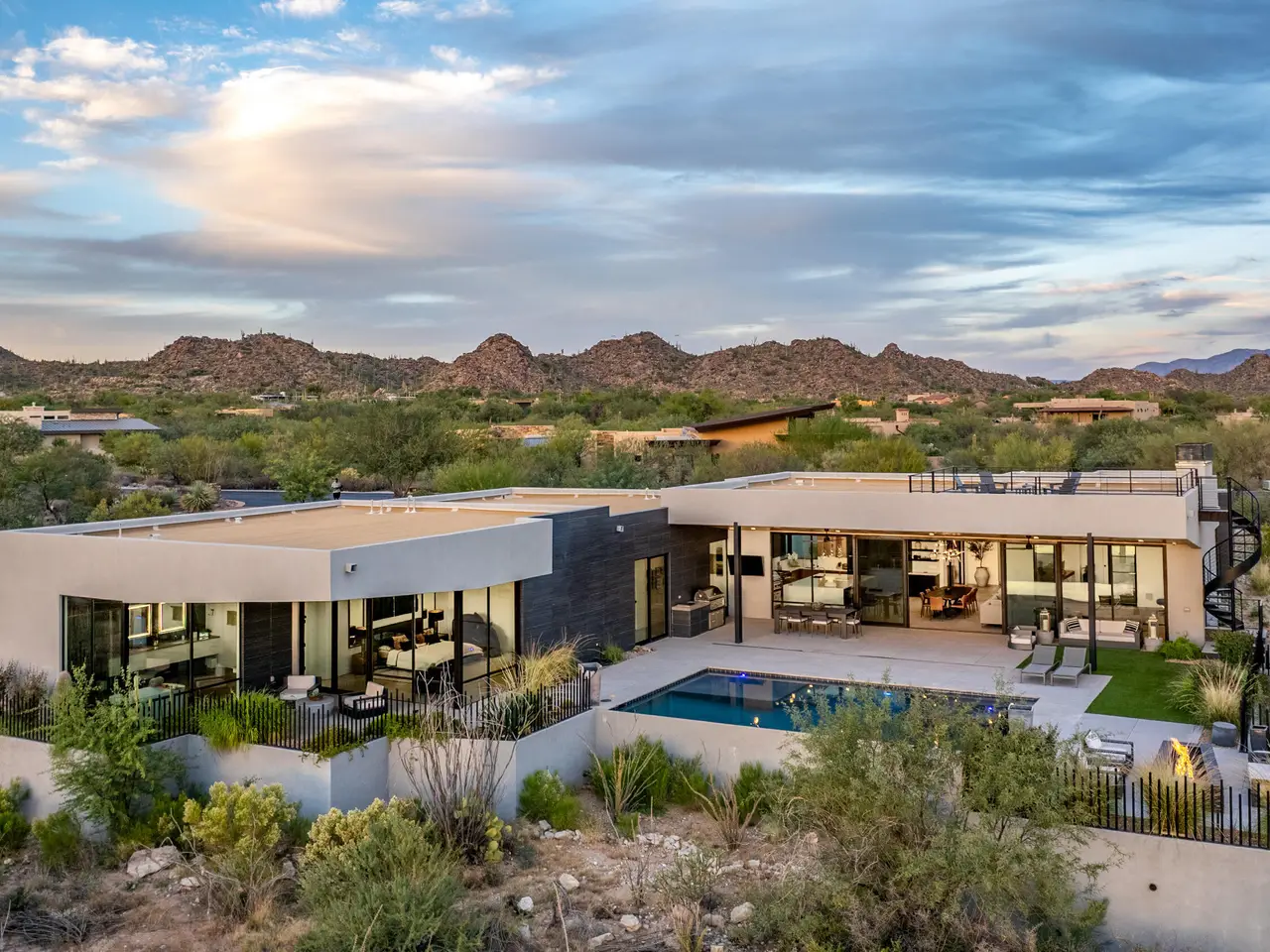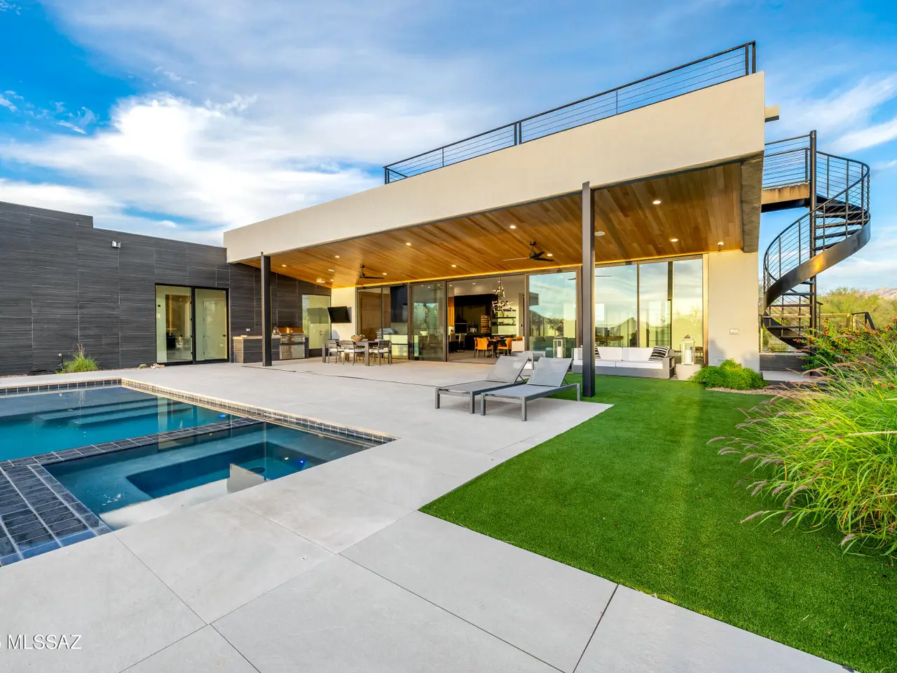 Modern luxury and integrated technology define this newly completed residence, designed by renowned architect Marc Soloway with interiors by Designs by Priya. Located in Stone Canyon's premier guard-gated community, the property offers mountain views, unobstructed sunsets, and backs to preserved desert for privacy. A pivot front door opens to a streamlined floor plan with tall ceilings, 24x48 Italian tile, and a full glass wall overlooking the resort-style backyard. Western multi-slide doors create a true indoor-outdoor layout. The kitchen features a quartz waterfall island, Sub-Zero, Wolf, and Dacor appliances, a built-in Wolf coffee maker, dual sinks, a hidden walk-in pantry, white-oak accents, and a Sub-Zero wine column. The primary suite includes floor-to-ceiling glass, a spa-inspired bath with black lavastone shower tile, floating vanities with LED mirrors, and a California Closets wardrobe. Secondary baths continue the same elevated detailing with floating vanities and full-height tile. The home is fully automated with a Control4 system managing audio, cameras, automatic shades, the cinema room, lighting, and more. Hallway lighting is upgraded to gallery-style fixtures. The cinema room includes built-in surround sound, an automatic projector, blackout shades, and a dedicated IT closet. Outdoor features include a saltwater pool and spa, view fencing, bar seating, and a Lynx Sedona grill. A custom metal spiral staircase leads to the rooftop deck for star-gazing, city light views, and sunset watching. A modern, well-built home with high-level finishes and a prime Stone Canyon setting