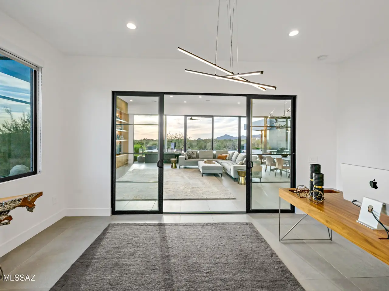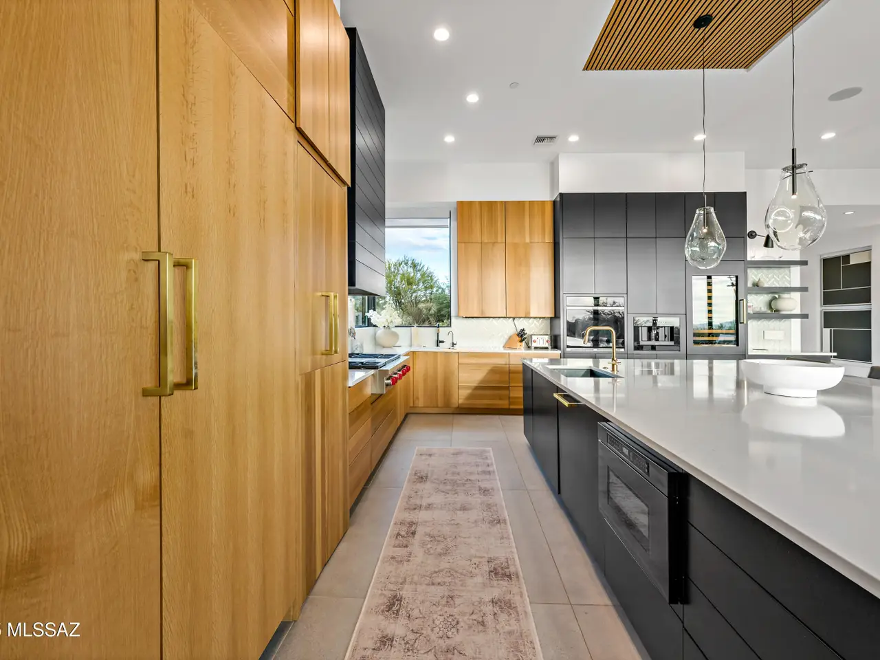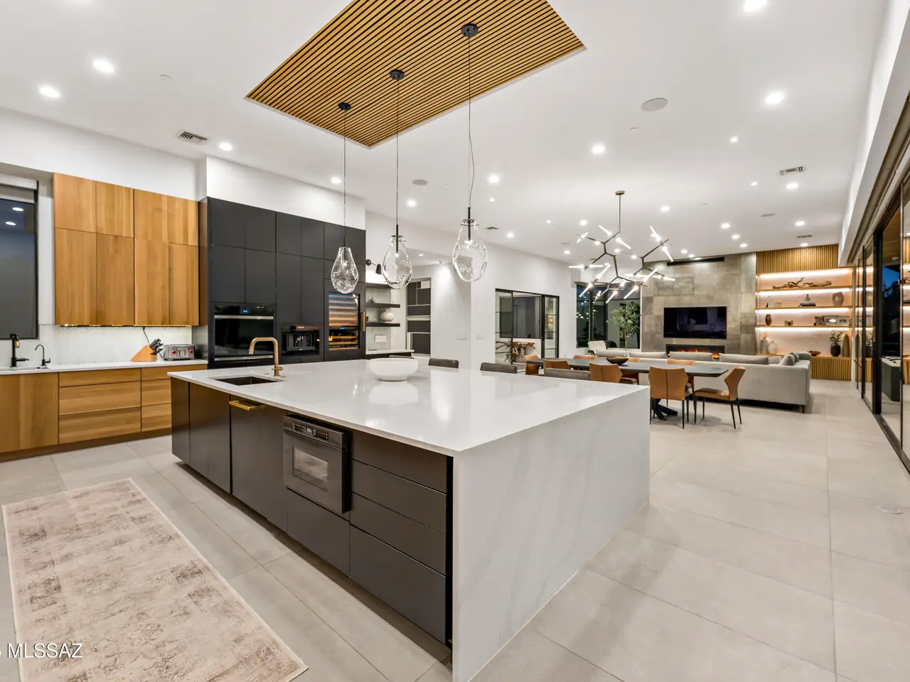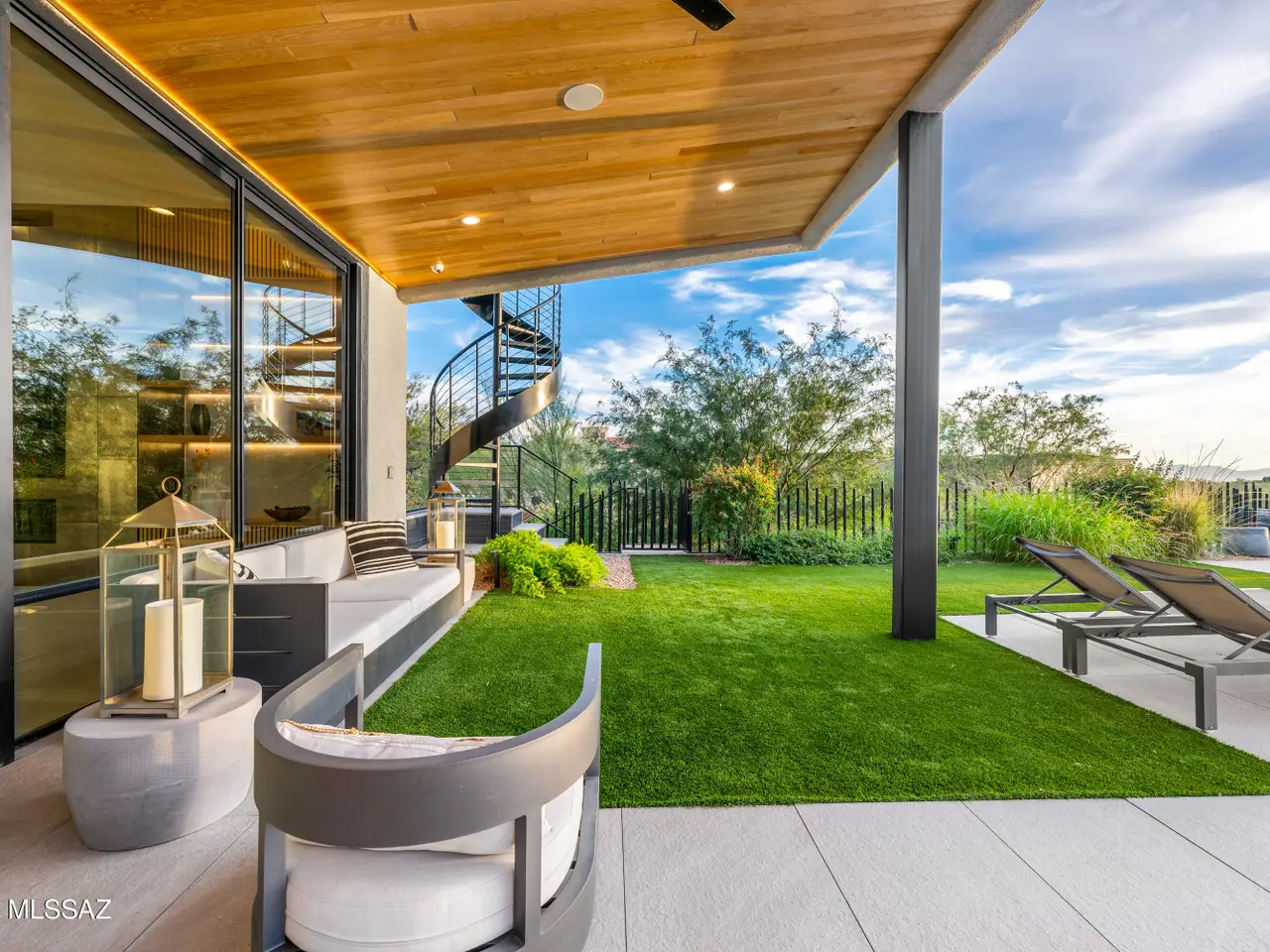 Modern luxury and integrated technology define this newly completed residence, designed by renowned architect Marc Soloway with interiors by Designs by Priya. Located in Stone Canyon's premier guard-gated community, the property offers mountain views, unobstructed sunsets, and backs to preserved desert for privacy. A pivot front door opens to a streamlined floor plan with tall ceilings, 24x48 Italian tile, and a full glass wall overlooking the resort-style backyard. Western multi-slide doors create a true indoor-outdoor layout. The kitchen features a quartz waterfall island, Sub-Zero, Wolf, and Dacor appliances, a built-in Wolf coffee maker, dual sinks, a hidden walk-in pantry, white-oak accents, and a Sub-Zero wine column. The primary suite includes floor-to-ceiling glass, a spa-inspired bath with black lavastone shower tile, floating vanities with LED mirrors, and a California Closets wardrobe. Secondary baths continue the same elevated detailing with floating vanities and full-height tile. The home is fully automated with a Control4 system managing audio, cameras, automatic shades, the cinema room, lighting, and more. Hallway lighting is upgraded to gallery-style fixtures. The cinema room includes built-in surround sound, an automatic projector, blackout shades, and a dedicated IT closet. Outdoor features include a saltwater pool and spa, view fencing, bar seating, and a Lynx Sedona grill. A custom metal spiral staircase leads to the rooftop deck for star-gazing, city light views, and sunset watching. A modern, well-built home with high-level finishes and a prime Stone Canyon setting