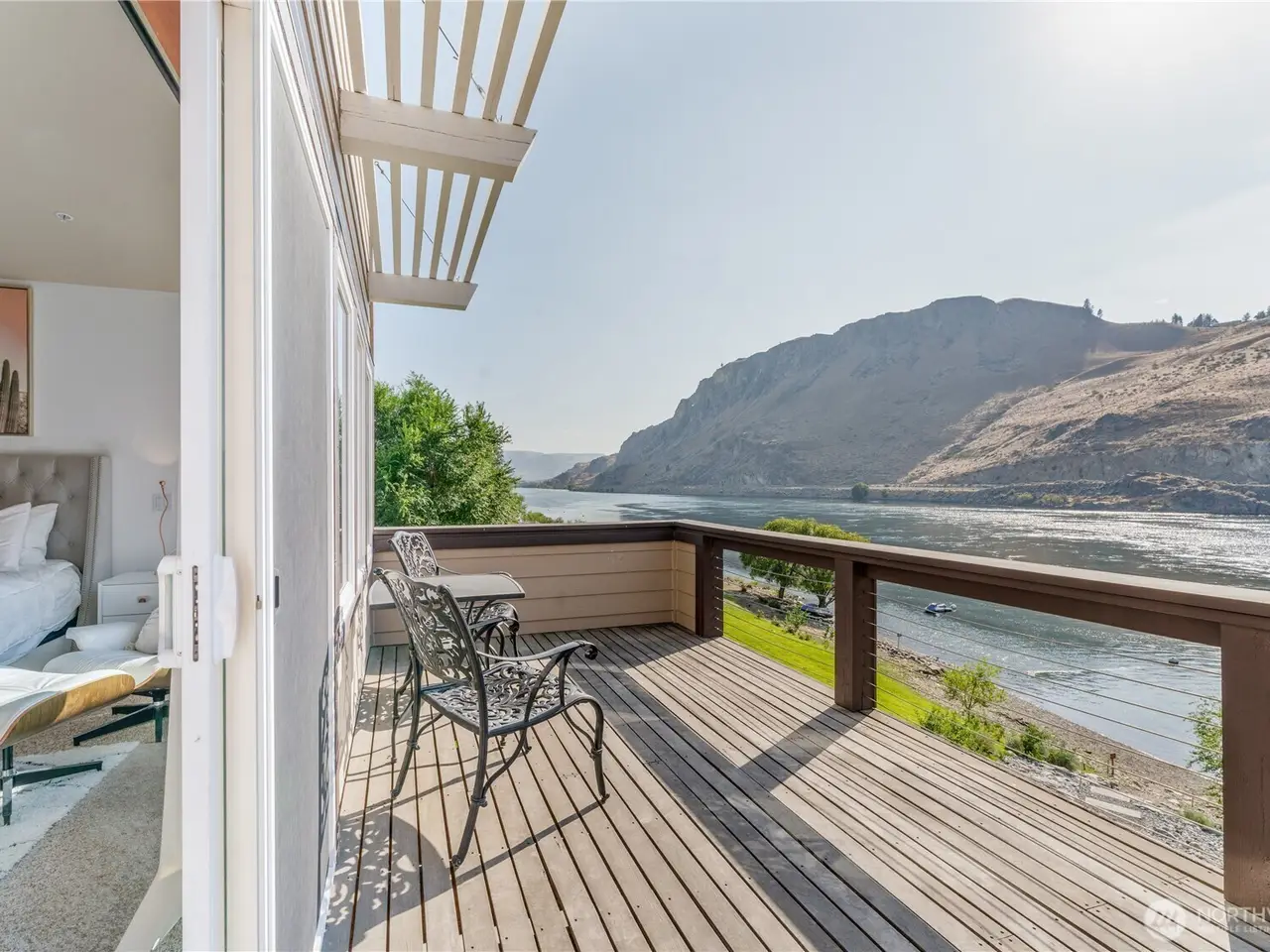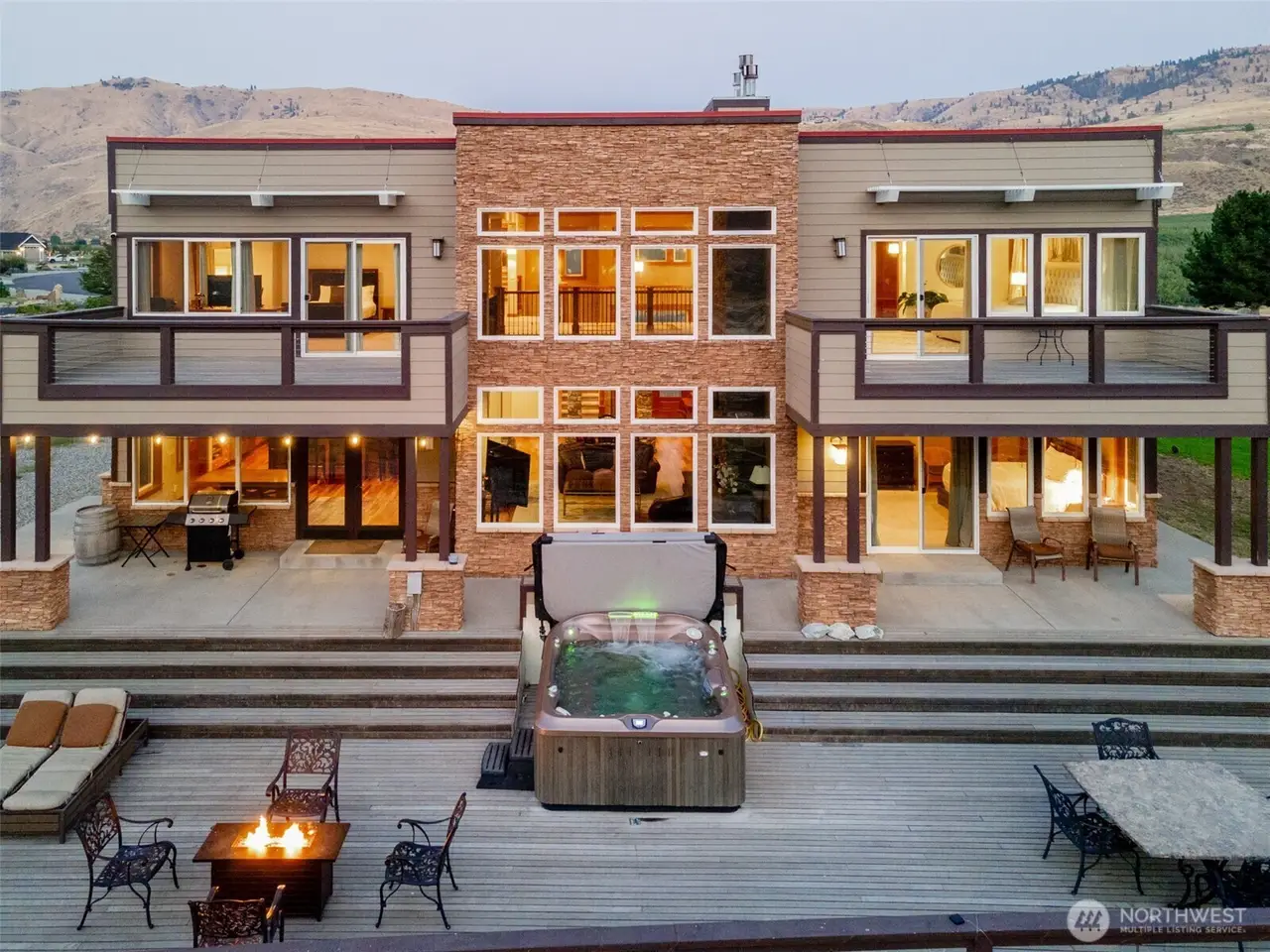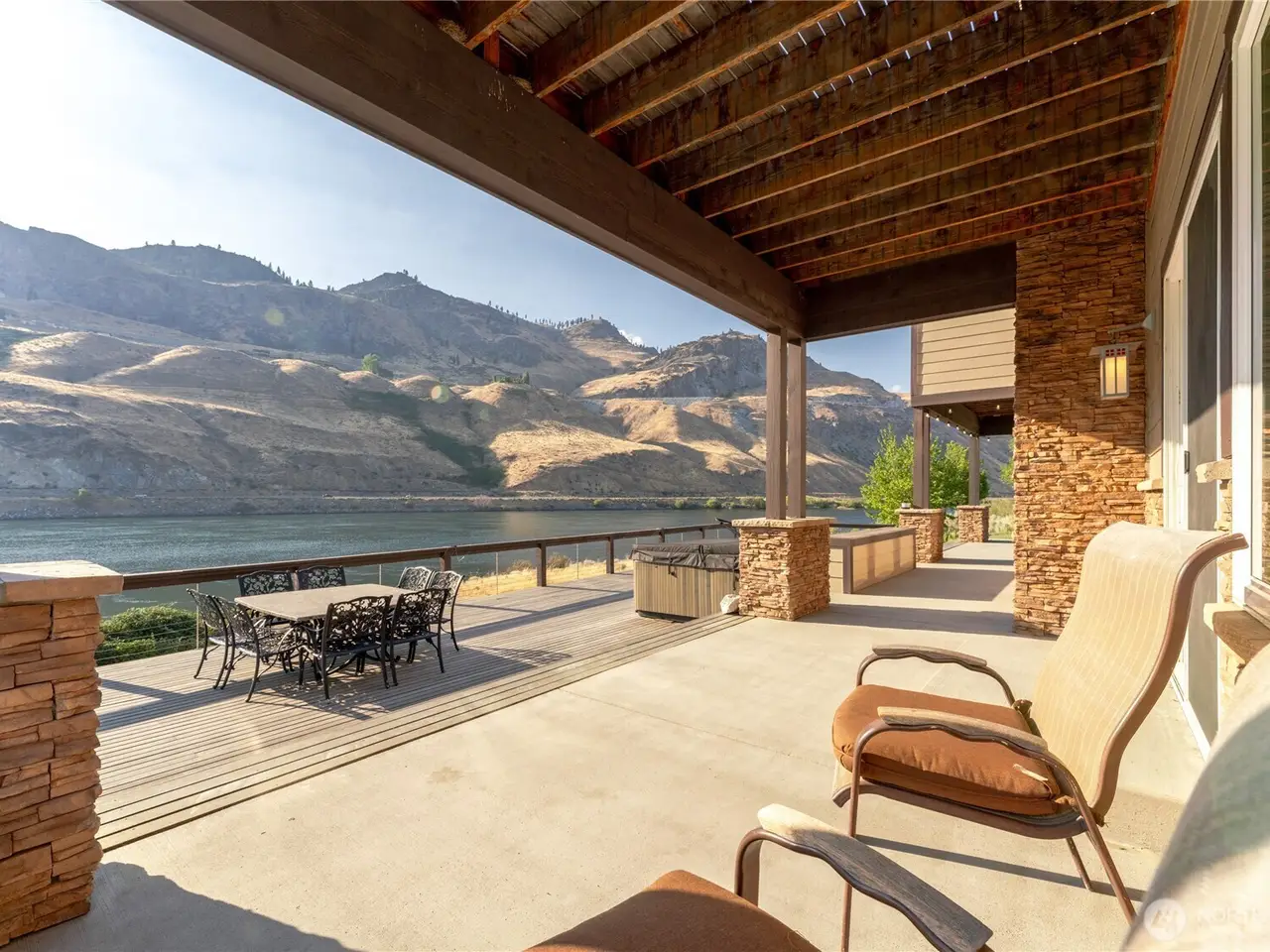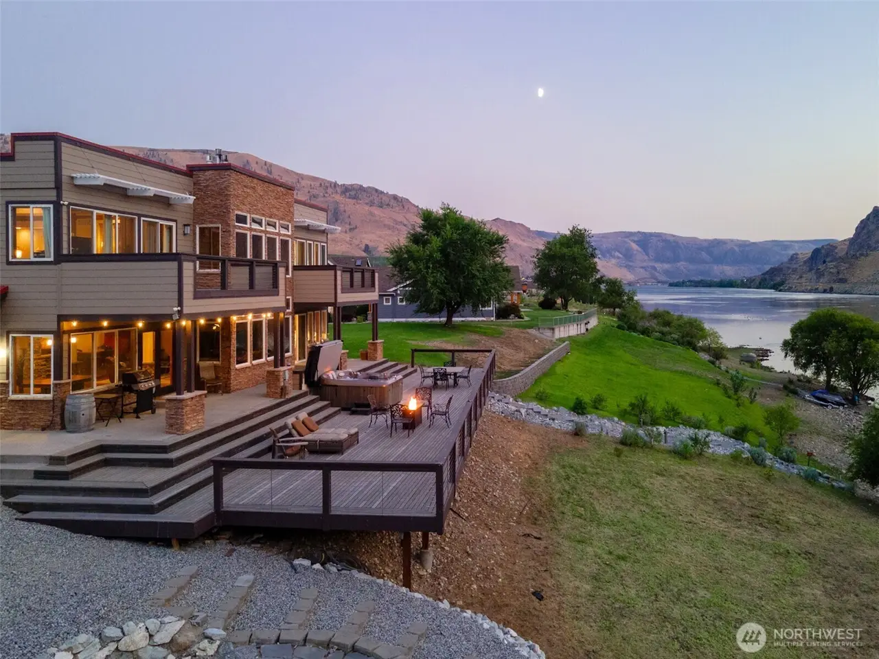 Stunning 6,884sf, 5bd/6.75bth low bank waterfront home w/ permitted buoy overlooking the Columbia River w/ unparalleled views, high-end luxury finishes & expansive outdoor living areas. The spacious home features high ceilings, hardwood floors, granite countertops, 2 primary bedroom suites w/ fireplaces, walk-in closets, baths w/ marble flooring & radiant heated floors. Great room w/ vaulted ceilings, sliding glass doors & gracious entertainer's kitchen w/ Viking appliances. 4 additional bedrooms, large media room w/ bunks & wet bar & attached garage w/ oversized doors that doubles as a yoga/exercise studio complete the home. Outdoor dining & lounge area w/ private spa. Fully furnished, turn-key Vacation Rental Home, 10 minutes from Chelan.