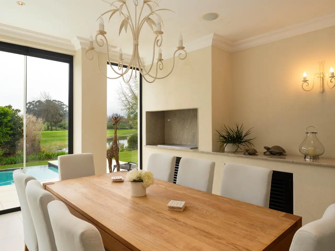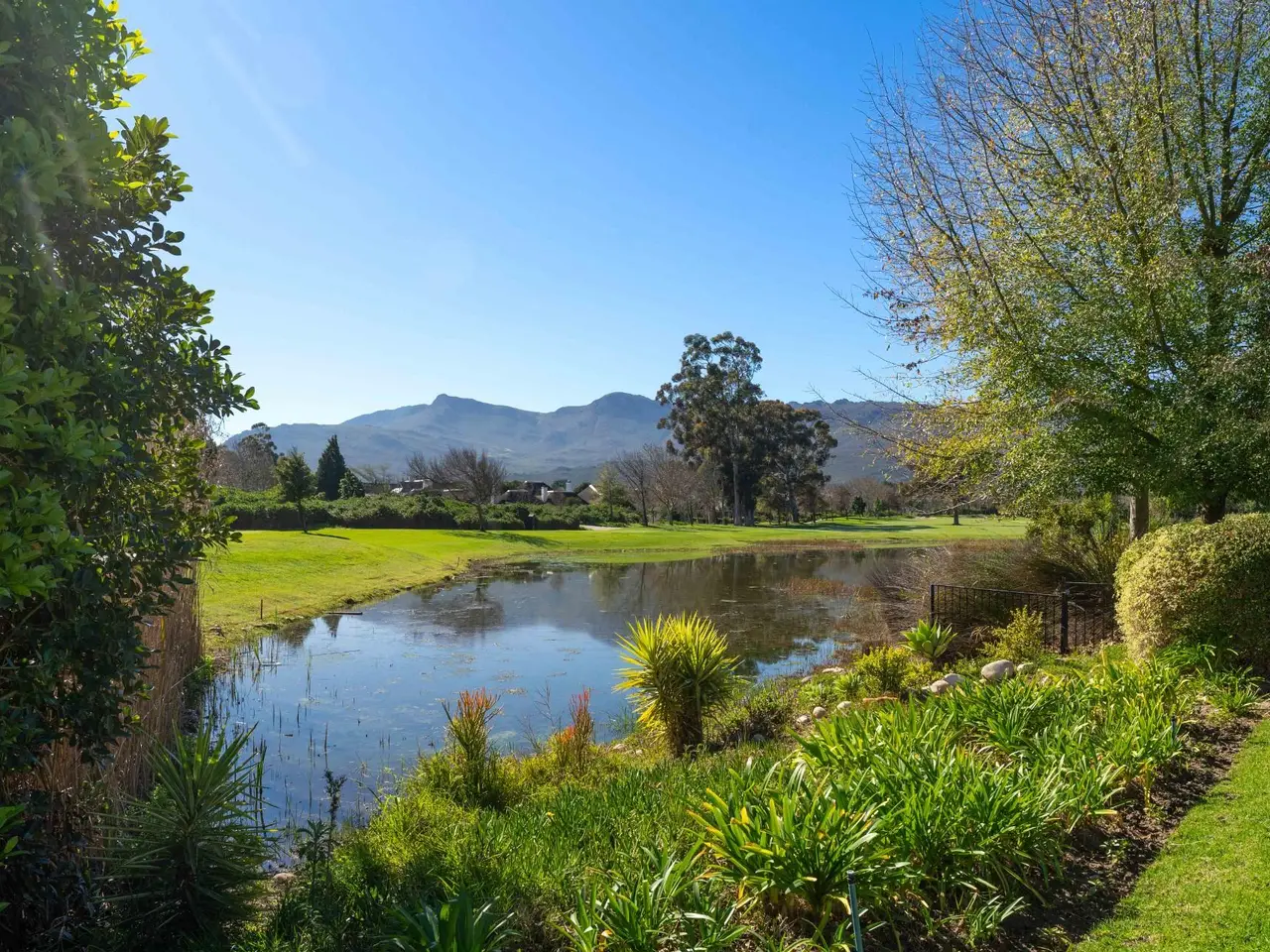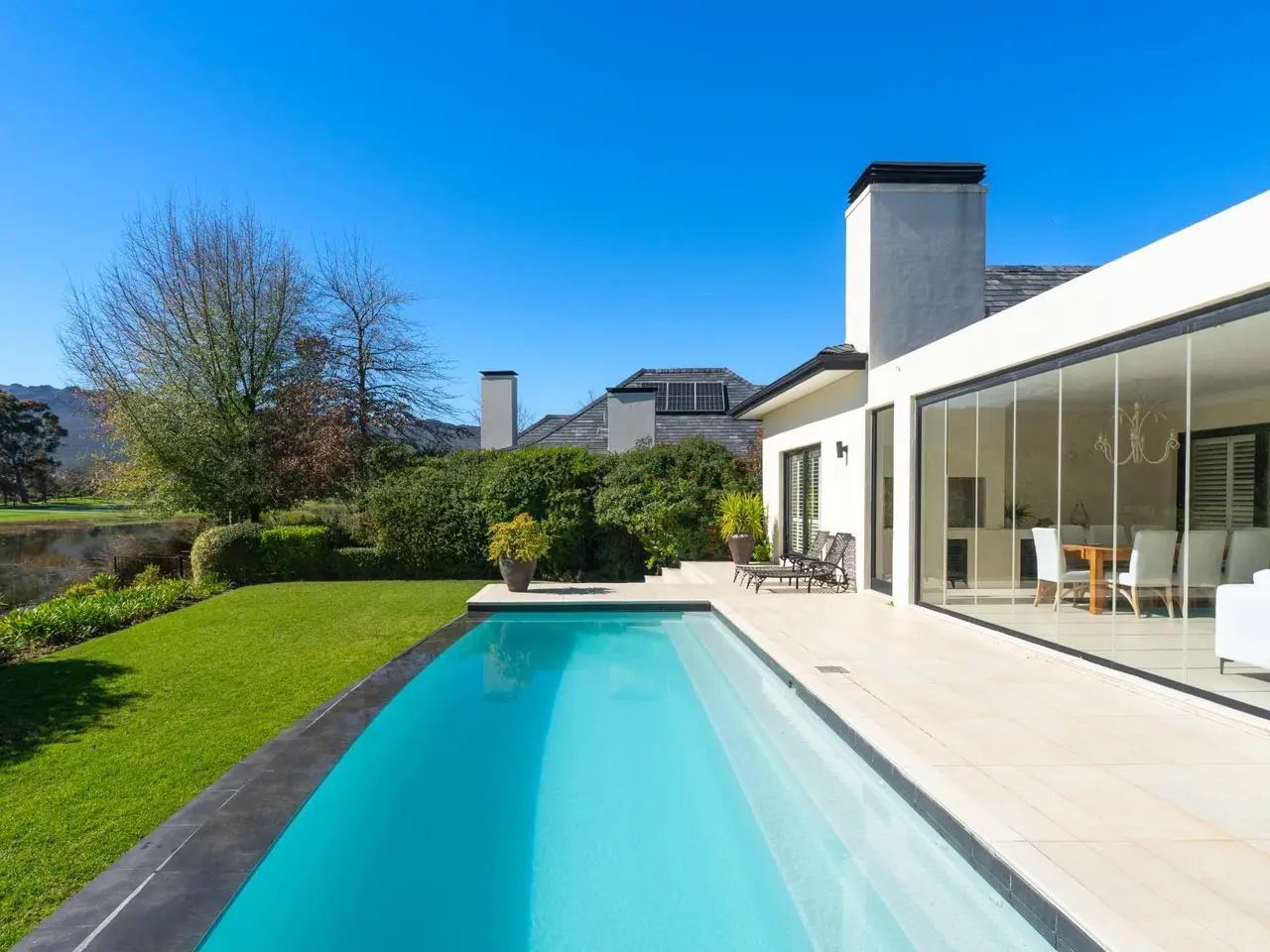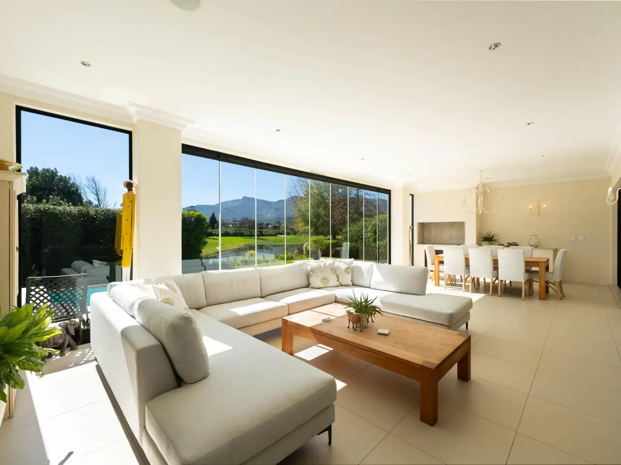 This beautifully appointed single-storey home offers uninterrupted views over a serene lake, manicured fairways, and the majestic Wemmershoek mountains. Designed with both comfort and elegance in mind, the home features four spacious en suite bedrooms and seamless open-plan living spaces, all flowing effortlessly onto a sunny patio enclosed with frameless glass doors, perfect for year-round enjoyment of the spectacular outlook. Thoughtful Design & Comfortable Living From the expansive living and dining areas to the cozy TV room and indoor braai room, every space is tailored for easy living and entertaining. The well-equipped kitchen includes a gas hob and a large central island, and flows directly into both the TV room and living roomGÇöeach fitted with a charming wood-burning fireplace. The indoor patio, featuring a large gas fireplace, opens up completely via glass sliding doors to the pool area, blurring the line between indoor and outdoor living. Bedrooms & Private Spaces The main bedroom is a retreat in itself, carefully designed to capture views of the lake and mountains directly from the bed, with direct access to the pool. It features ample built-in cupboards and a luxurious en suite bathroom complete with double basins, underfloor heating, heated towel rails, shower, bath, toilet, and bidet. The three additional en suite bedrooms are all generously sized, one with direct pool access. A well-positioned study provides a quiet space for working or reading. Modern Comfort & Extras • Central air conditioning system in all rooms • Ceiling fans and integrated speaker system • Scullery with ample storage and space for washer and dryer • Separate laundry courtyard and staff bathroom • Double garage plus dedicated golf cart garage • Inverter, batteries, and solar panels for energy efficiency This exceptional home offers the best of tranquil living, modern luxury, and thoughtful functionality in one of the region's most desirable settings.