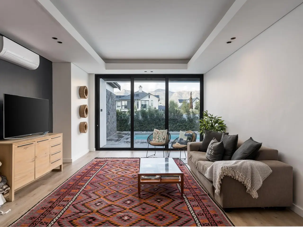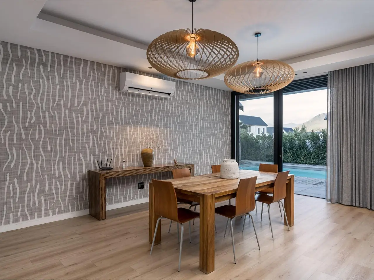 Nestled in the prestigious and secure Val de Vie Estate, this contemporary five bedroom single-story home offers the perfect blend of modern luxury and comfort, all while enjoying spectacular views all around. Located in the tranquil La Vue area, this property is within walking distance to nearby parks and play areas, making it an ideal setting for family living. The estate is renowned as one of the safest in Africa, providing peace of mind for you and your loved ones. Open-plan living with an elegant design that promotes seamless flow and natural light. Equipped with solar and battery back up for energy efficiency. A dedicated workspace for productivity or quiet reflection is next to the cozy pajama lounge to unwind and relax with family or friends. The modern kitchen features top-of-the-line appliances and ample counter space, overlooking the indoor braai area, making it perfect for hosting gatherings or enjoying intimate meals. Dive into luxury with a pristine pool that offers a serene spot to cool off or enjoy outdoor entertainment. Whether you're enjoying the beautiful surroundings, hosting friends, or retreating for a quiet evening, this home is designed for a lifestyle of comfort and ease.