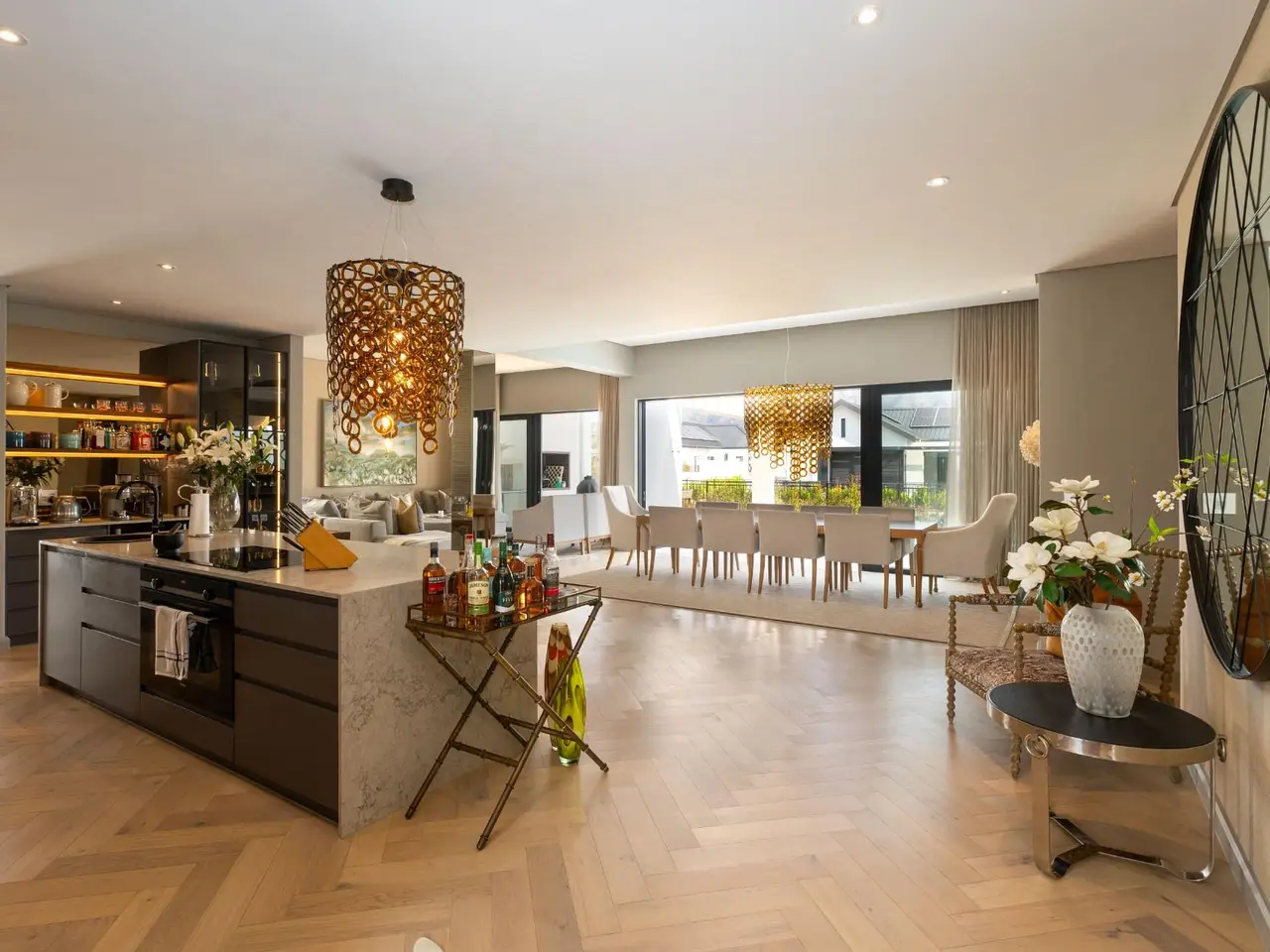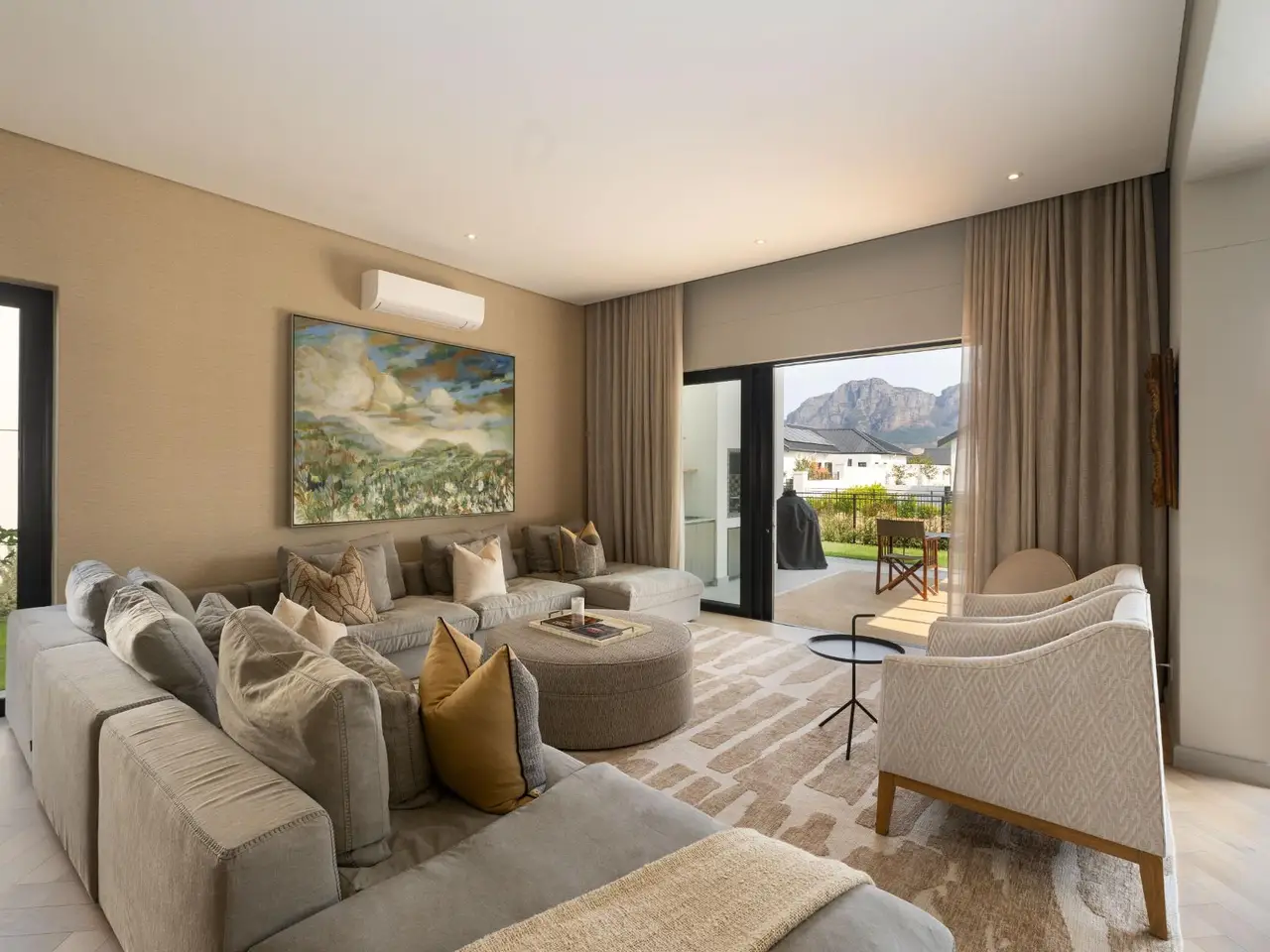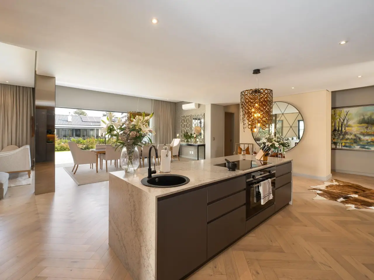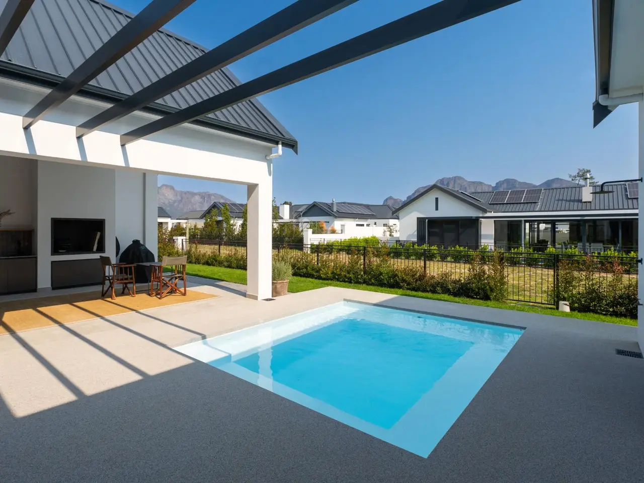 Exclusive Dual Mandate. Beneath the breathtaking Drakenstein and Simonsberg mountains, this brand-new home in The Acres at Pearl Valley Golf & Country Estate offers an exceptional lifestyle surrounded by picturesque scenery. Whether you're looking for a luxurious holiday retreat or the perfect family residence, this home is an outstanding choice. Upon entering, you are welcomed by a spacious entrance hall leading into an elegantly designed open-plan kitchen. The kitchen features a generous center island, an induction hob, and a built-in wine fridge. Just off the kitchen, the separate scullery provides easy access to the laundry courtyard and double garage, enhancing the home’s functionality. The kitchen flows into a bright and inviting lounge area, where stacking doors open completely to the landscaped garden and pool area. This seamless indoor-outdoor living space is perfect for entertaining. The undercover braai patio is equipped with a built-in wood braai, prep bowl, and sideboard, offering the ideal setting for evening sundowners or family gatherings. The main bedroom suite is complete with a walk-in dressing room, and a luxurious en-suite bathroom. Sliding doors lead directly from the suite to the pool and garden. Two additional en-suite bedrooms each feature built-in cupboards and sliding doors that open to the outside, providing comfortable and private accommodation for family or guests. A study nook just outside the bedrooms offers ample storage and a quiet place to work or study, all while maintaining privacy from the rest of the home. Additional features include a landscaped garden, a swimming pool, an outside shower, and a state-of-the-art inverter and battery system for uninterrupted living. This remarkable property blends elegant design with modern functionality, providing everything you need for a serene, secure, and fulfilling lifestyle in one of the Cape Winelands’ most prestigious estates.