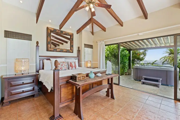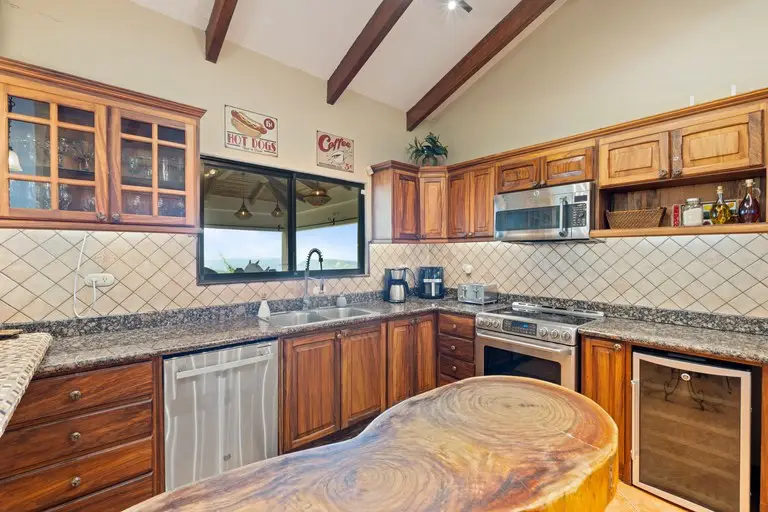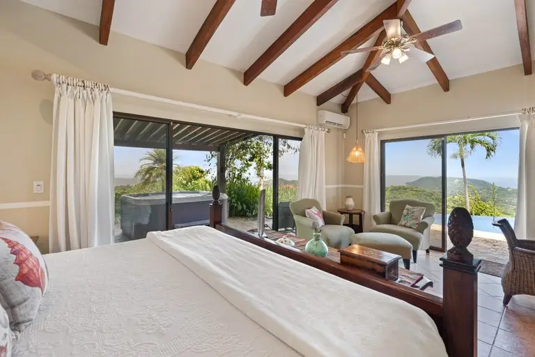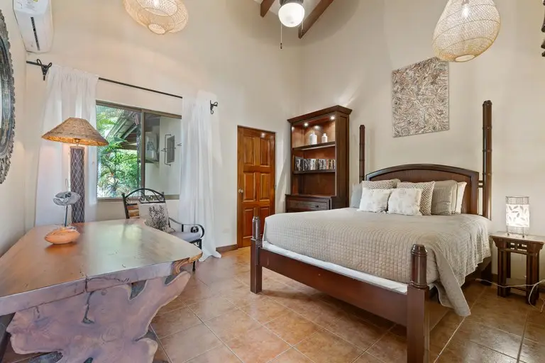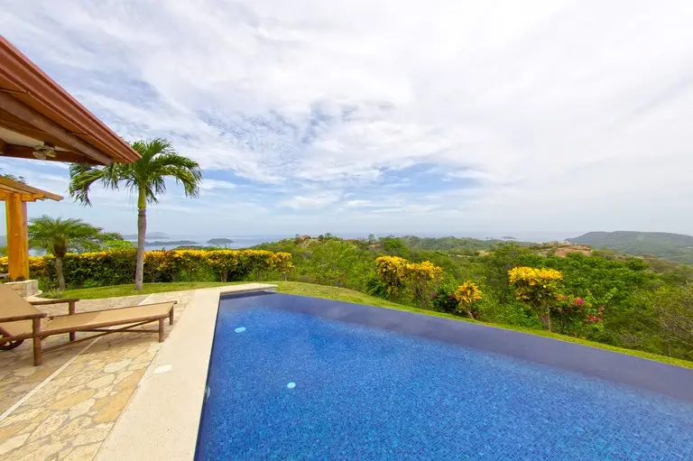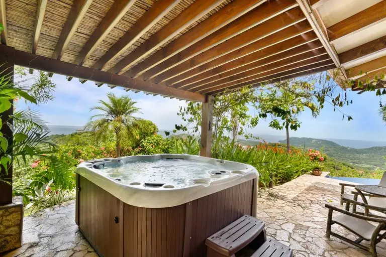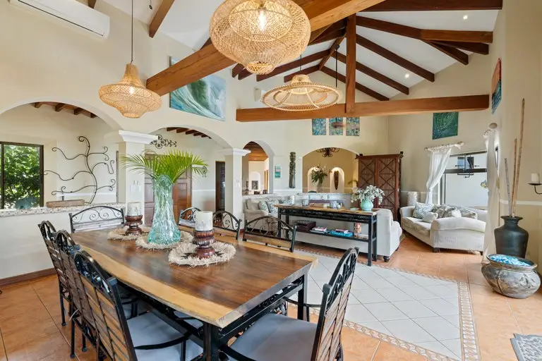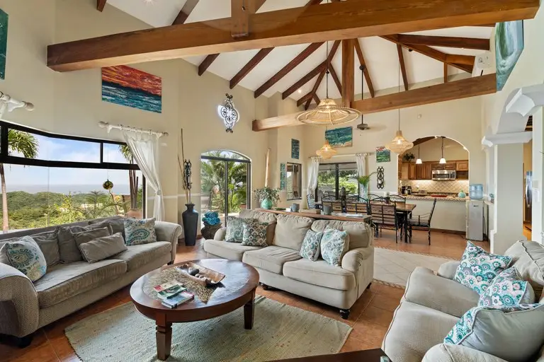 Welcome to Casa Miramar, a 4-bedroom, 4.5-bath Mediterranean-style villa located in the hills of Pacific Heights. The home's interior showcases soaring vaulted ceilings with exposed wood beams, expansive windows, and elegant finishes that highlight the stunning ocean views. The gourmet kitchen is fully equipped with high-end appliances, a breakfast bar for three, and opens to a formal dining area that seats six. The adjacent living room is spacious and inviting—ideal for entertaining or quiet evenings at home. Each of the four bedrooms features a king-size bed, en-suite bathroom, air conditioning, and generous closet space. The primary suite offers direct access to the pool terrace, a cozy seating area, and a private jacuzzi surrounded by lush greenery. Step outside to your private oasis. The infinity-edge pool overlooks the Pacific Ocean and is complemented by a fully equipped outdoor kitchen, bar, BBQ grill, and ample dining and lounging spaces—perfect for enjoying Costa Rica’s year-round tropical climate. Casa Miramar is just five minutes from some of Guanacaste’s most beautiful and secluded beaches, including Playa La Penca, Playa Prieta, and Playa Pan de Azúcar. Playa Potrero, known for its calm waters and family-friendly vibe, is also nearby. The town of Potrero offers a variety of restaurants, grocery stores, cafes, and essential services like medical clinics and pharmacies. Whether you’re looking for a serene retreat or a luxurious base for beach adventures, Casa Miramar blends elegance, comfort, and location in one unforgettable property.