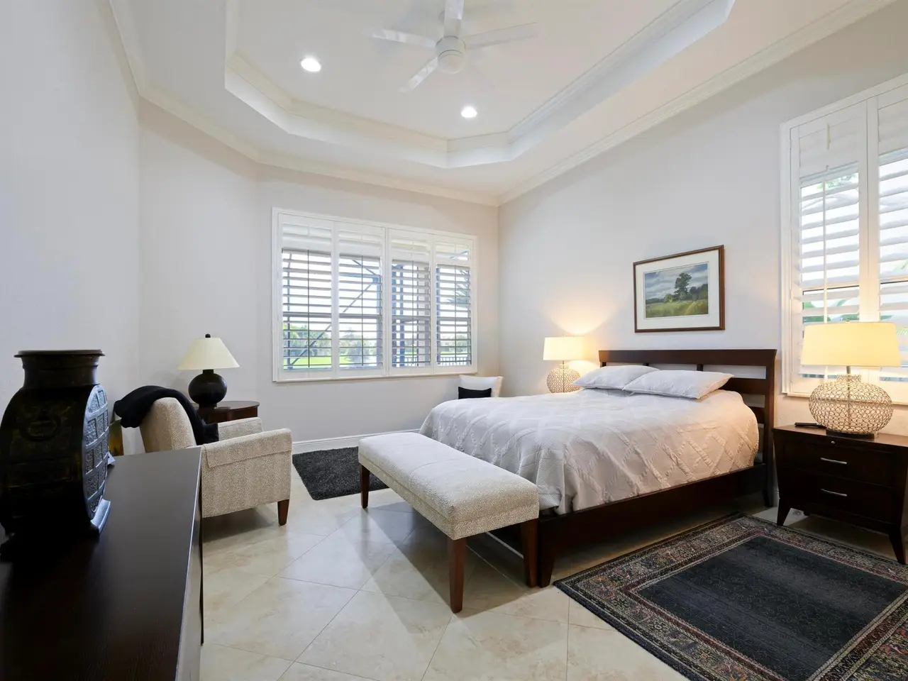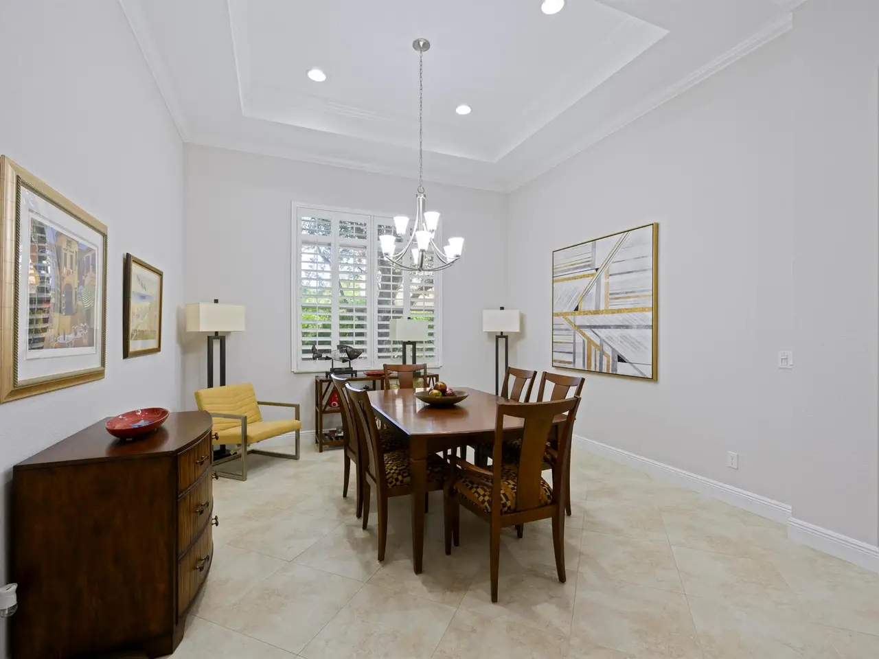 Welcome to Paloma, one of Palm Beach Gardens' most sought-after gated communities. This beautifully maintained single-family residence offers 3 bedrooms, 2.5 baths, a versatile den, and a 2-car garage, all thoughtfully designed with a split floor plan for comfort and privacy. Step inside the grand foyer, accented by chandelier lighting, crown molding, and custom baseboards, and you'll immediately notice the timeless details throughout -- including plantation shutters, recessed lighting, and tile flooring in every room. The formal dining room features elegant lighting and seamlessly connects to the double-door den, perfect for a home office or library.