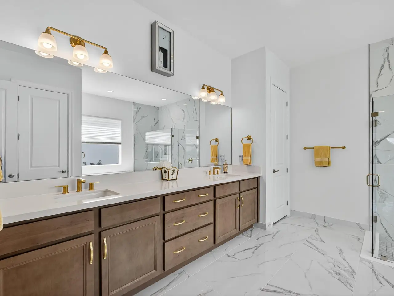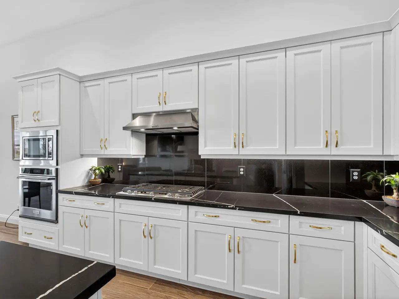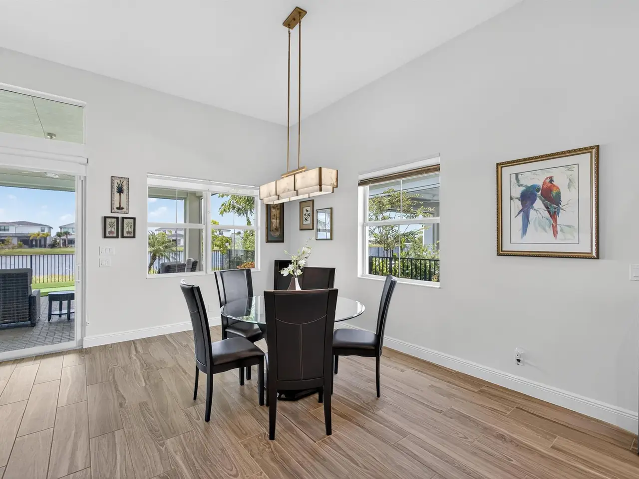 This beautifully appointed 3-bedroom plus office, 3-bath home offers an open and airy floor plan with a bright coastal feel and stunning wide water lake views. Western exposure provides magnificent sunsets that can be enjoyed from the extended lanai patio, creating the perfect setting for entertaining or relaxing by the water. The home features a Tropical-inspired backyard complete with astro turf, a golf putting area, and remote-controlled hurricane patio screens for year-round comfort. Inside, every detail has been thoughtfully upgraded, whole house, Generac Generator, oversized 8-blade ceiling fans with lights in the living areas, bedrooms, and patio, custom blinds on all windows, upgraded light fixtures, and an oversized jetted tub in the primary suite and comfort height toilets.
