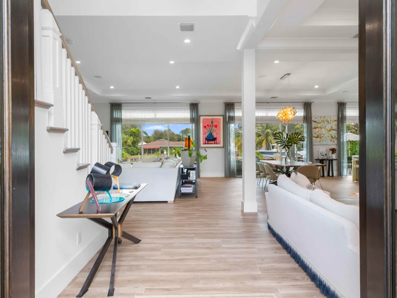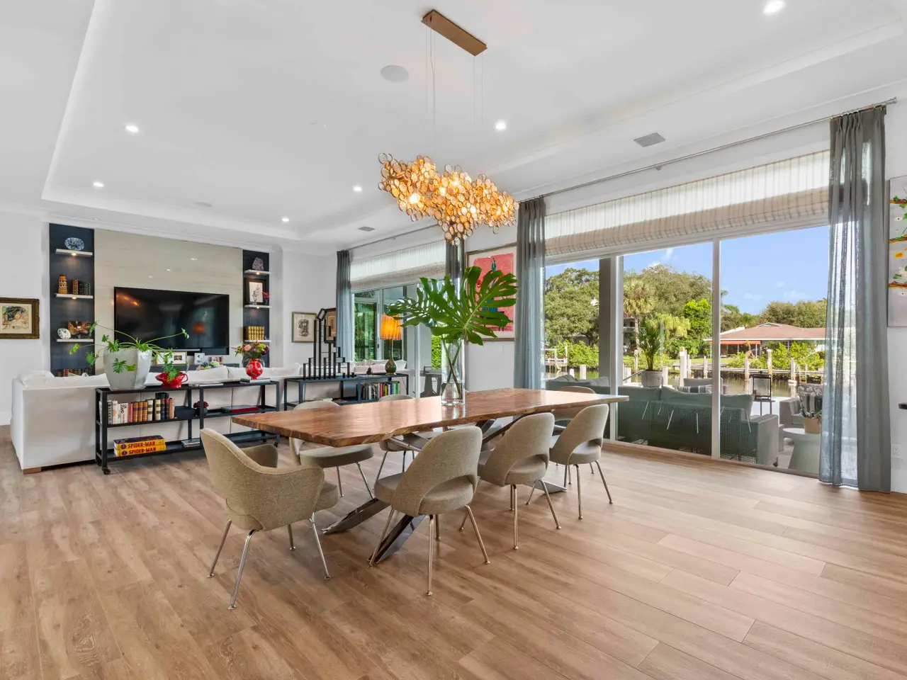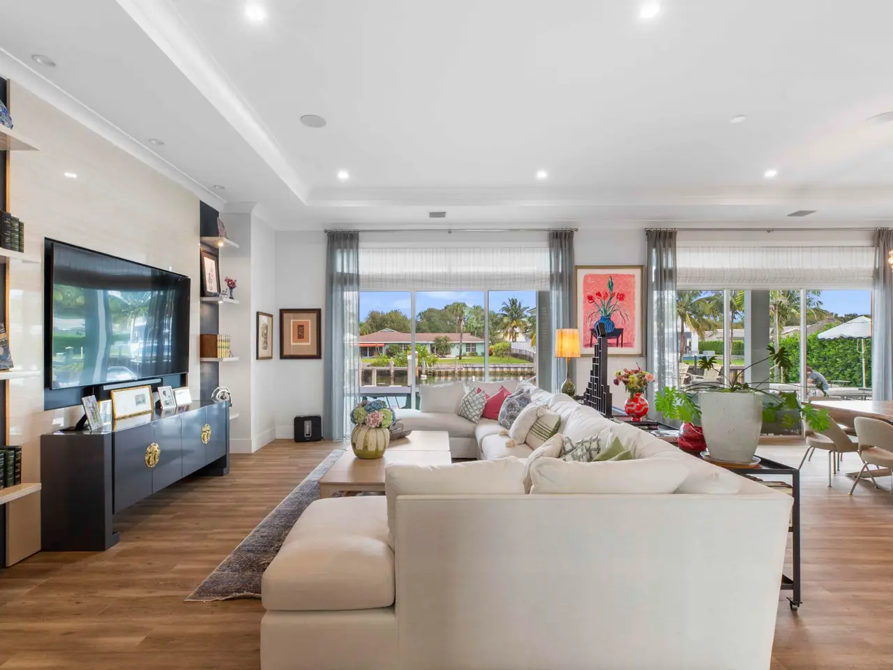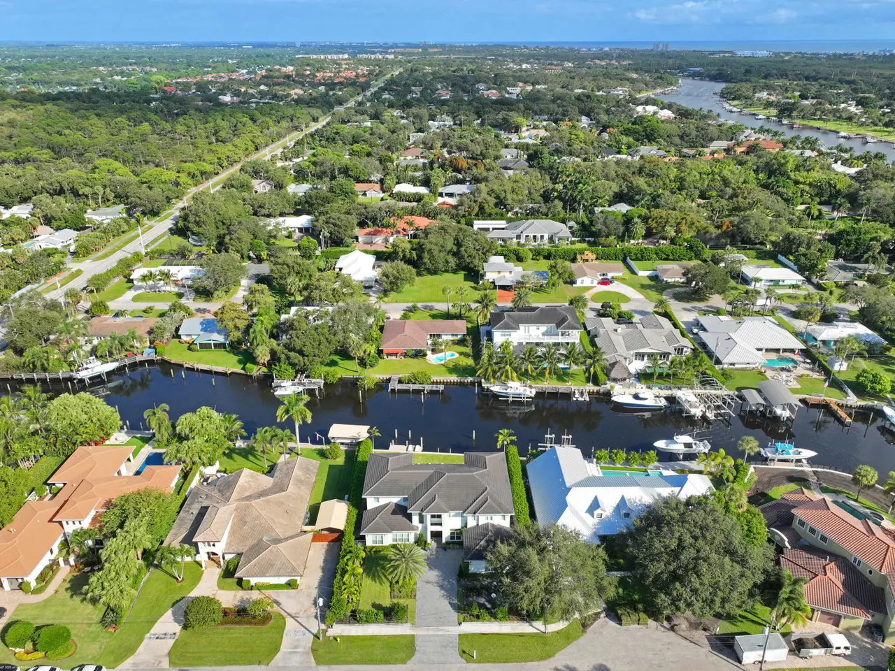 Built new in 2020, this fabulous Palm Beach Gardens Modern Island Smart Home boasts 5 bedrooms and 5.5 baths and over 7900 total sq ft! The open floor plan includes a Gourmet Chef's kitchen with 2 large islands and a huge pantry! A wall of French Doors all open to a massive covered and screened patio with a summer kitchen and a beautiful, heated infinity pool/spa and 100' of waterfront including a boat dock! The primary suite is stunning with a massive bath and huge closets. All the bedrooms upstairs have access to a large open balcony to capture the water views or to watch a sunrise or sunset. The home has high ceilings with recessed lighting, Plantation Shutters, an elevator and a whole house generator. It's a boater's paradise yet just minutes away from everything.