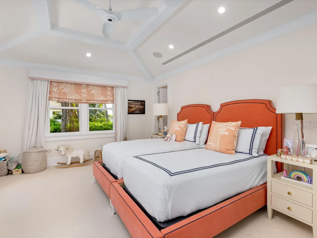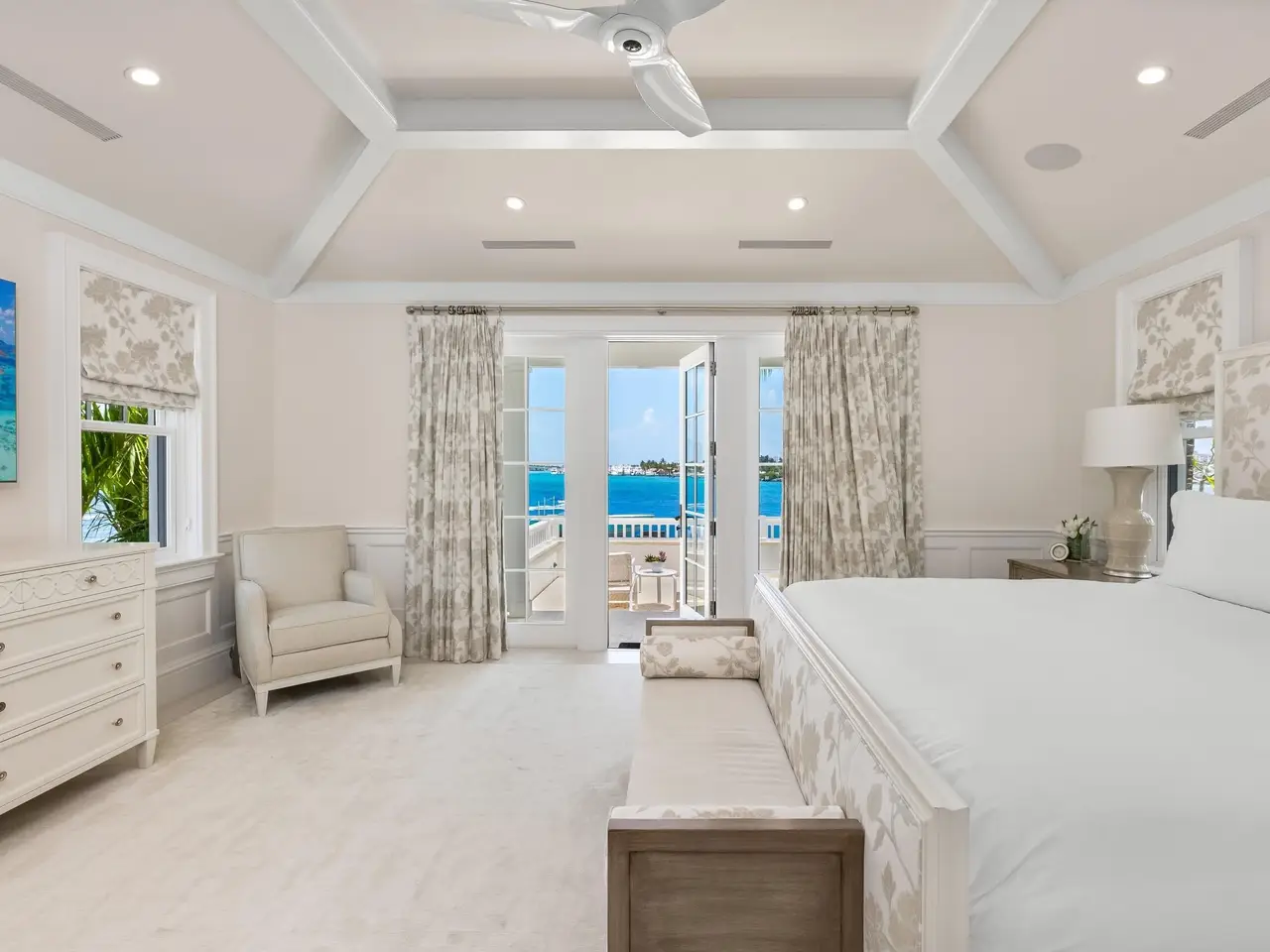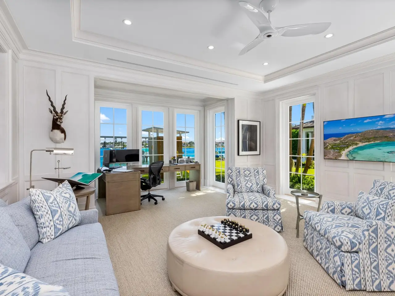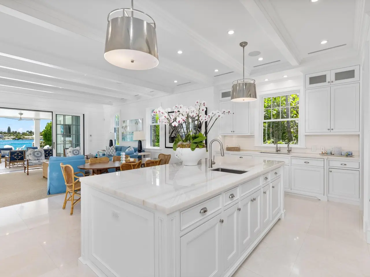 Welcome to 1610 N Ocean Blvd, a rare opportunity to own a spectacular 6-bedroom, 7.2-bathroom waterfront residence, masterfully built in 2018. With breathtaking views from all principal rooms, this elegant estate offers the perfect blend of British West indies elegance and contemporary refinement. A long private, gated driveway leads to a grand, beautifully landscaped courtyard entrance - providing the feeling of entering a lush tropical compound. The iconic entryway leads into an expansive formal living room with a stately fireplace, with Bahamian blue water colors conveniently positioned as the perfect backdrop. The gourmet chef's kitchen is a culinary dream, featuring a large center island and seamlessly flowing into the spacious family room, ideal for relaxed entertaining.