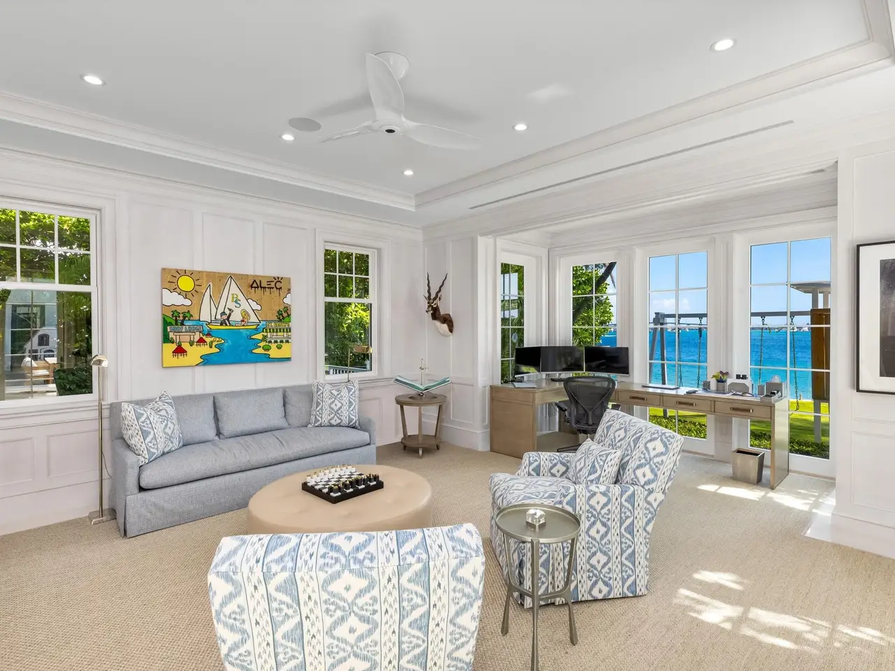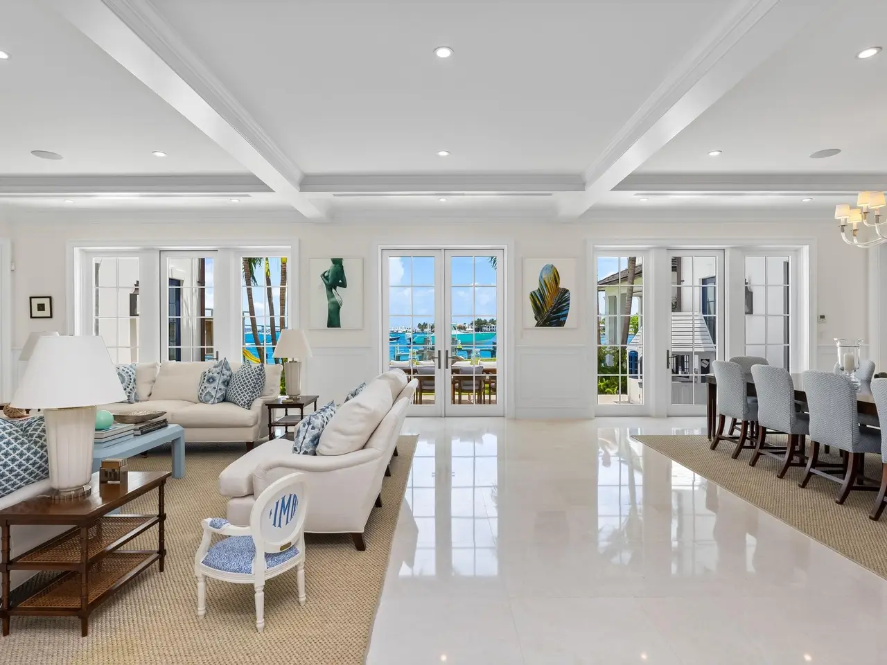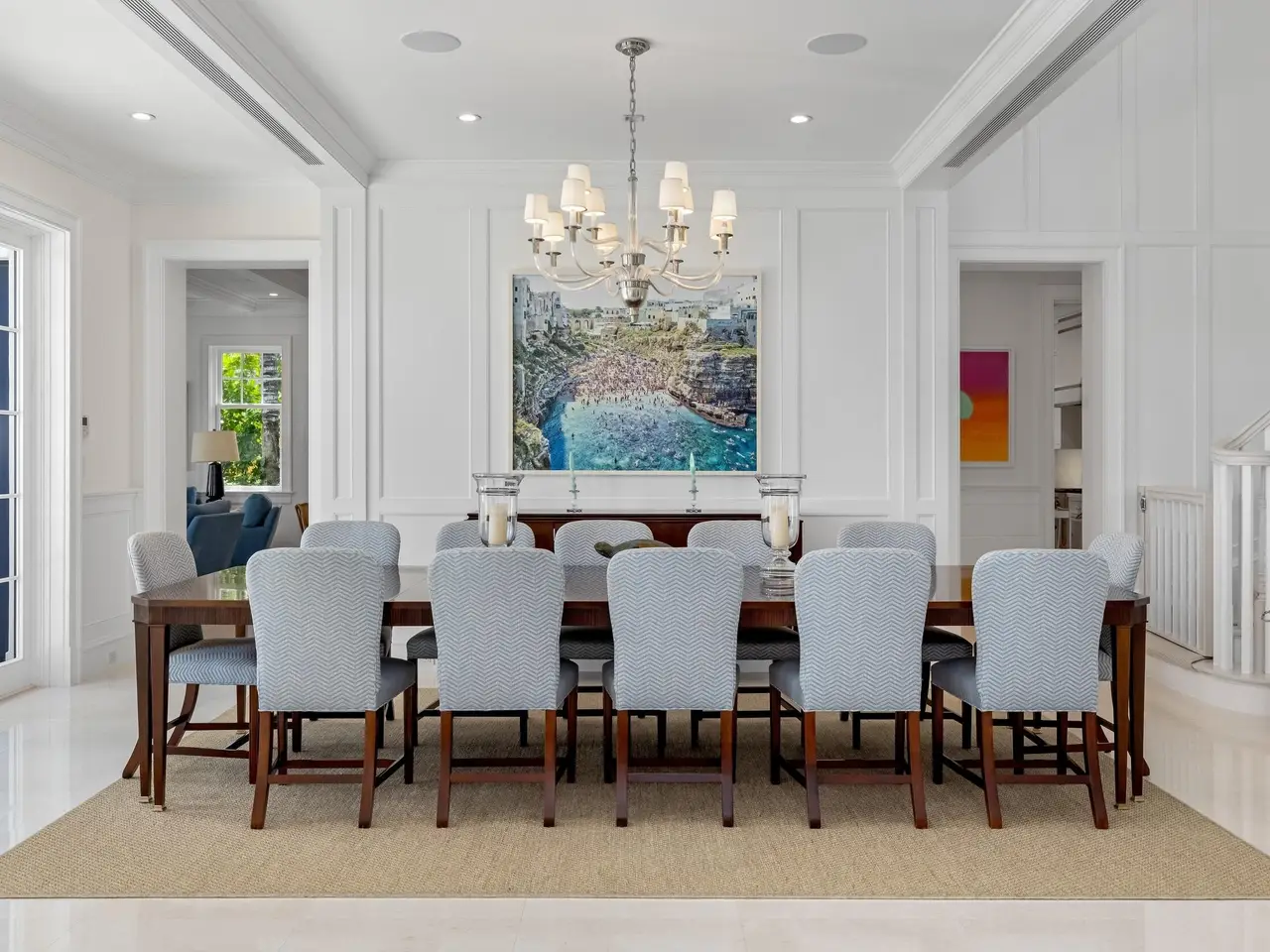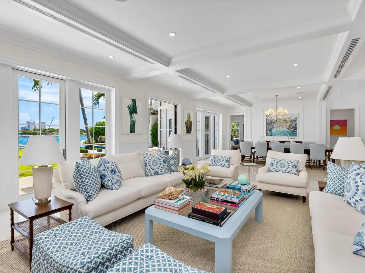 Stately fireplace with Bahamian blue water colors