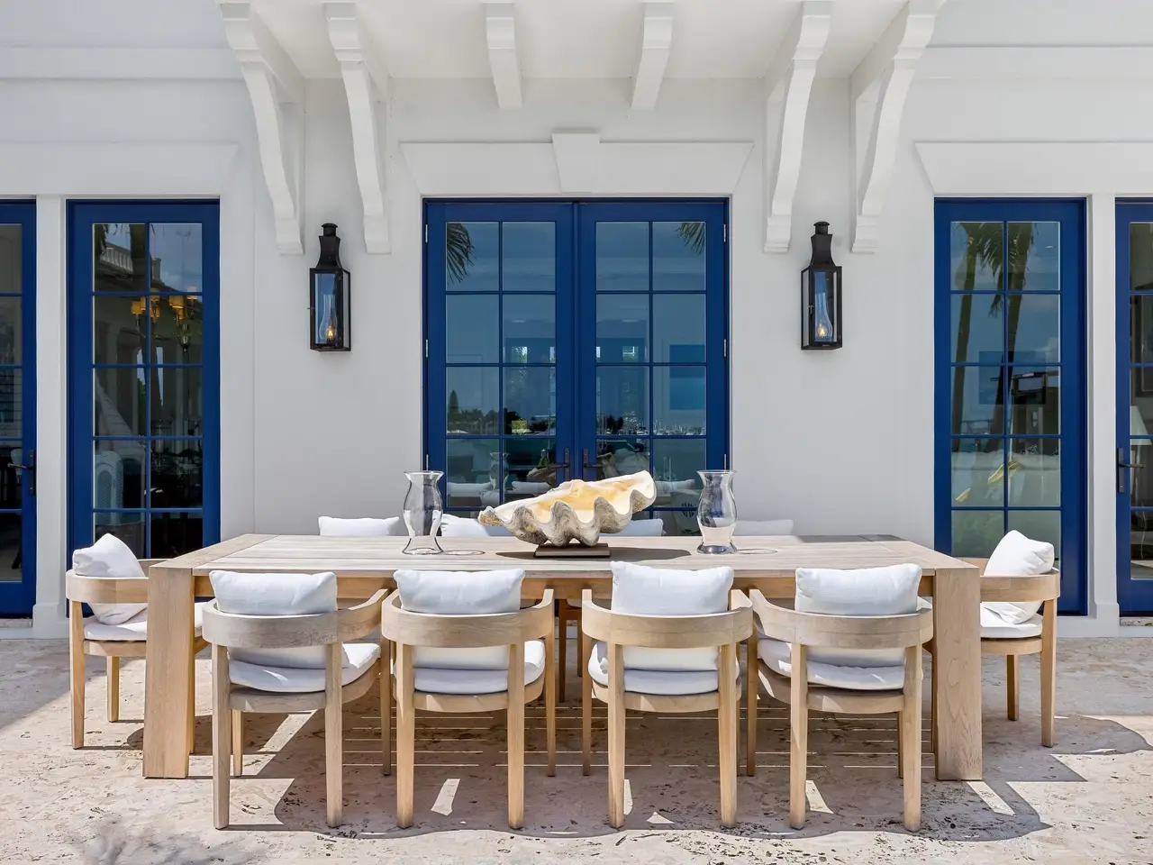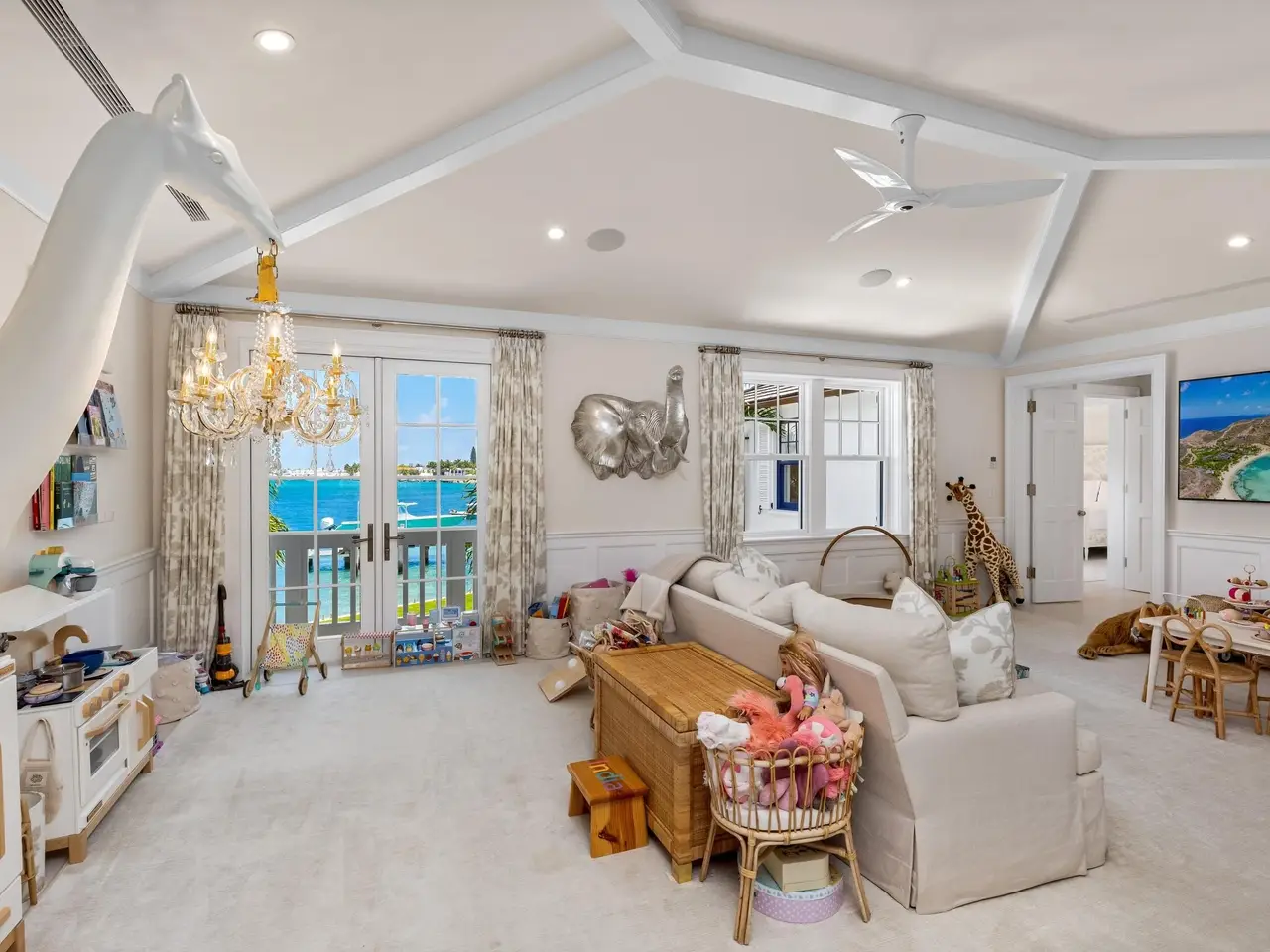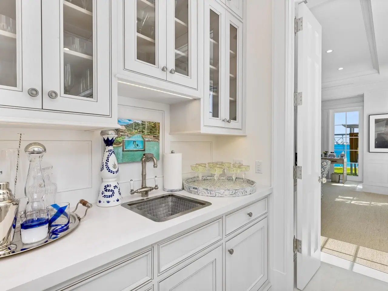 Stately fireplace with Bahamian blue water colors