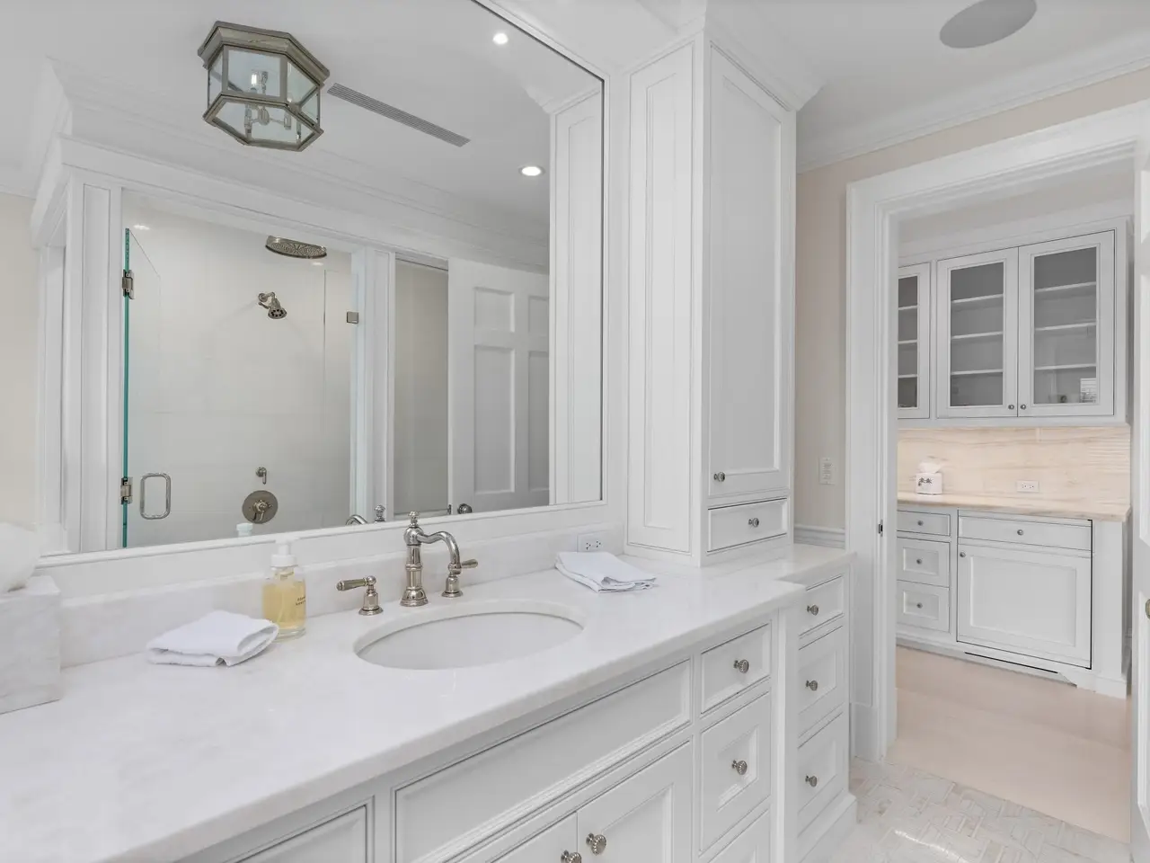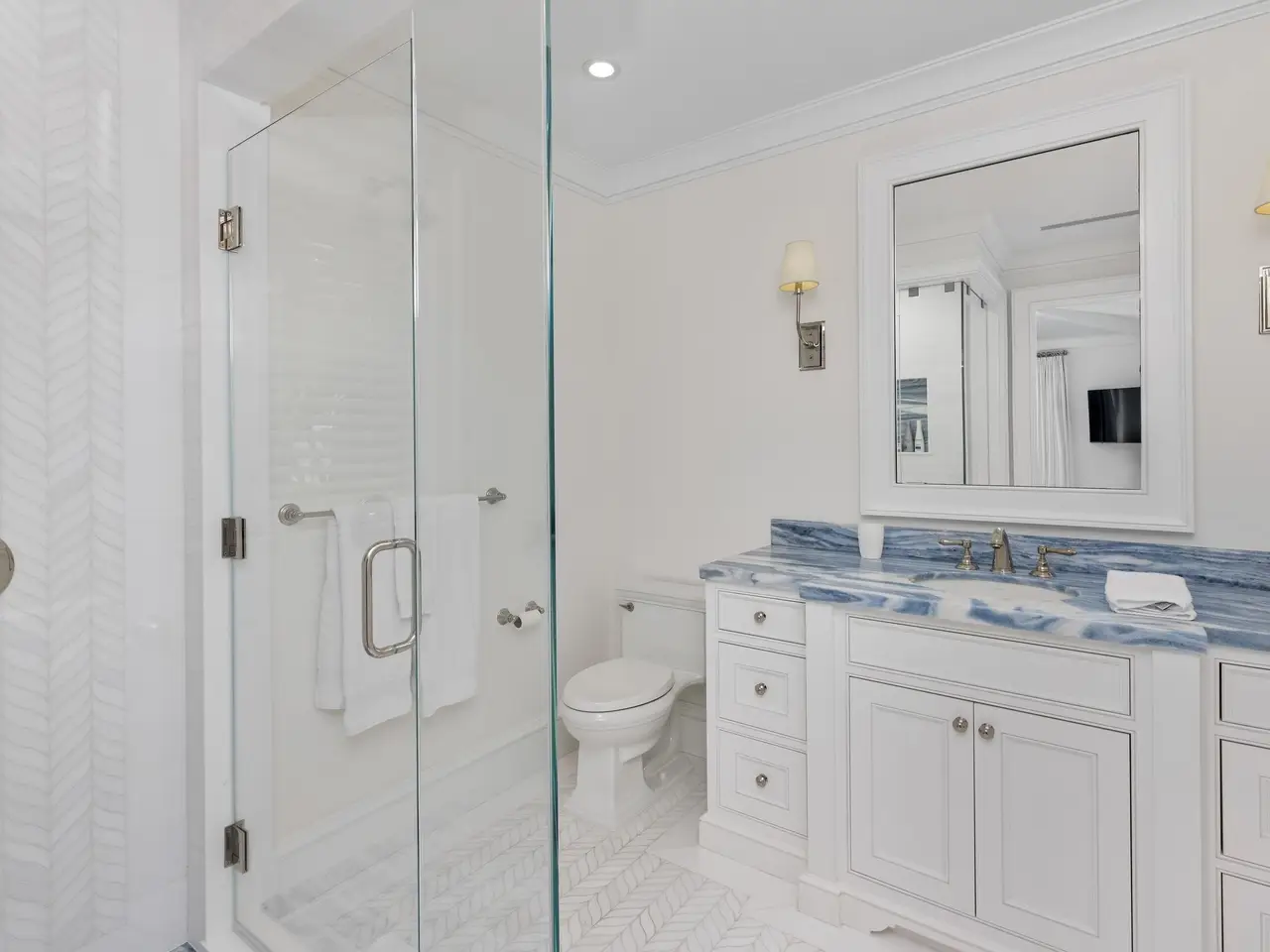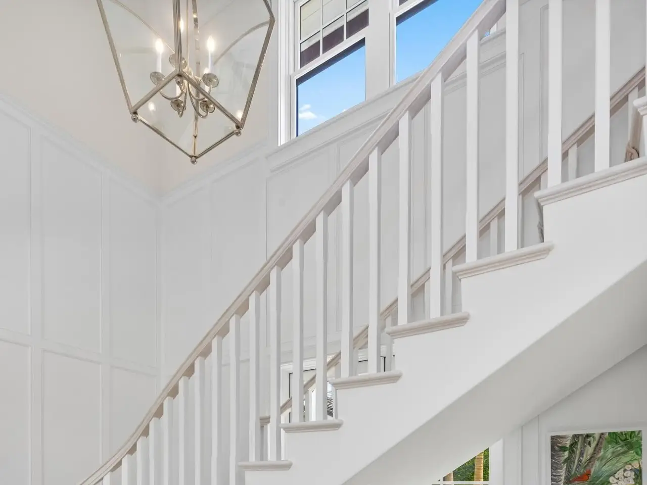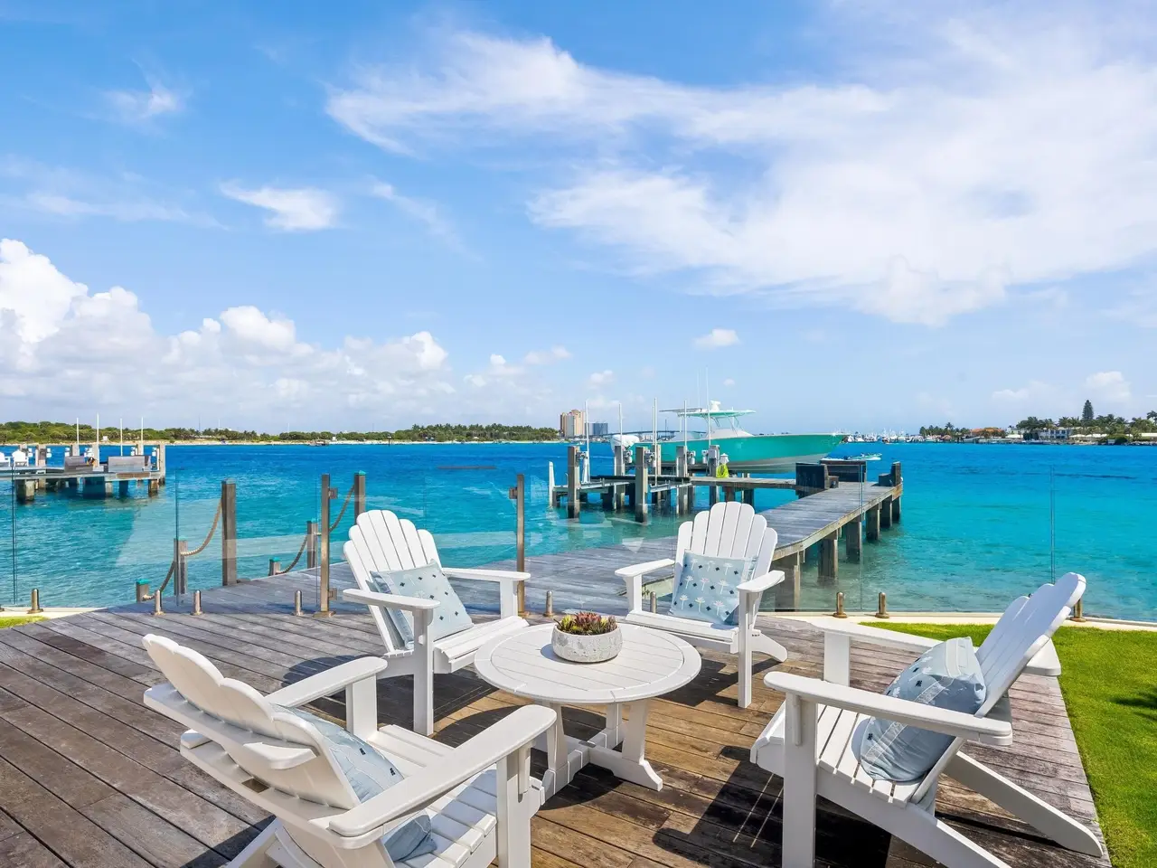 Stately fireplace with Bahamian blue water colors