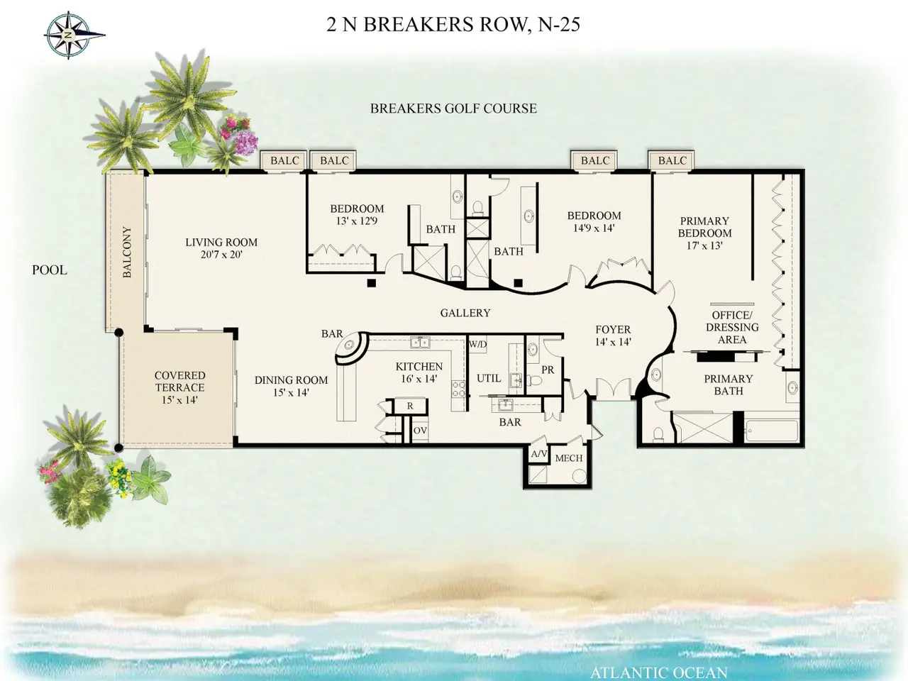 Welcome to this exquisite residence at Breakers Row in Palm Beach. N25 at Breakers Row bridges the magic of oceanfront living with beautiful views of the Breakers Hotel Golf Course. Comprising 3 beds and 3.5 baths, this waterfront, full-service home on the 2nd floor features beautiful ocean golf course views, gracious balconies, a pool, idyllic private cabana, gym, 2 covered parking spaces, and deeded private beach access. Directly on the sand, this residence has custom, bespoke wood finishes throughout. Located conveniently in the heart of town and walking distance to everything, N25 at Breakers Row is your seamless entree into the Palm Beach Island resort lifestyle.