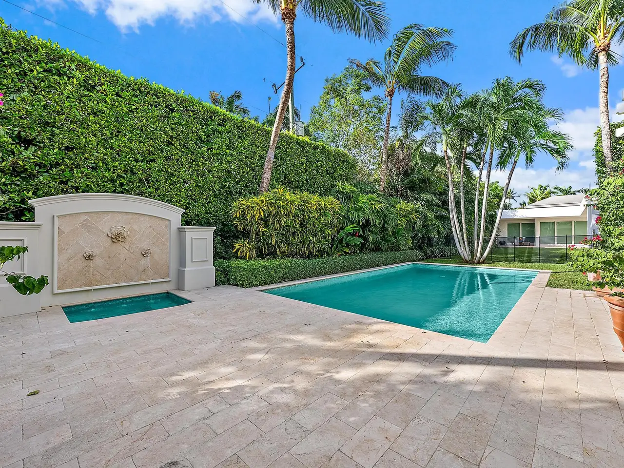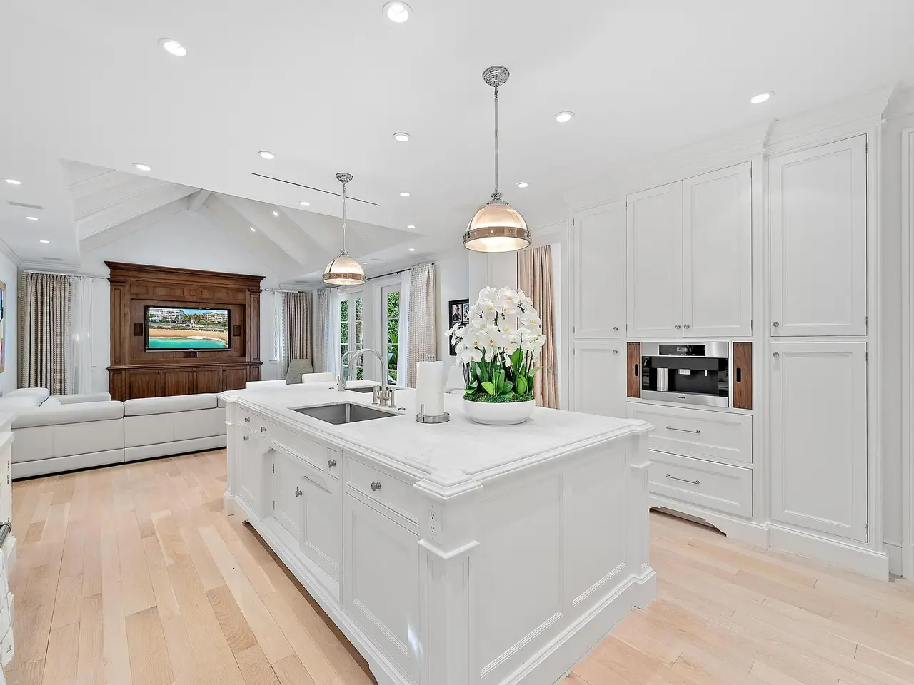 Discover this exquisite West Indies-style home, built and finished by Leeds Custom Design, and nestled on a picturesque 1/3-acre lot. An inviting open great room welcomes you, featuring a dual-sided fireplace that elegantly connects to the dining area. The kitchen is a culinary dream, showcasing a state-of-the-art Wentworth kitchen with Wolf, Sub-Zero, and Miele appliances, along with a large island and cozy breakfast area. The family room, complete with a home theater, is adjacent to a relaxing covert loggia with a beautiful wall fountain. Retreat to the primary suite, which exudes elegance with two ensuite bathrooms. All other bedrooms, each with an ensuite bath, are located on the second floor for added privacy.