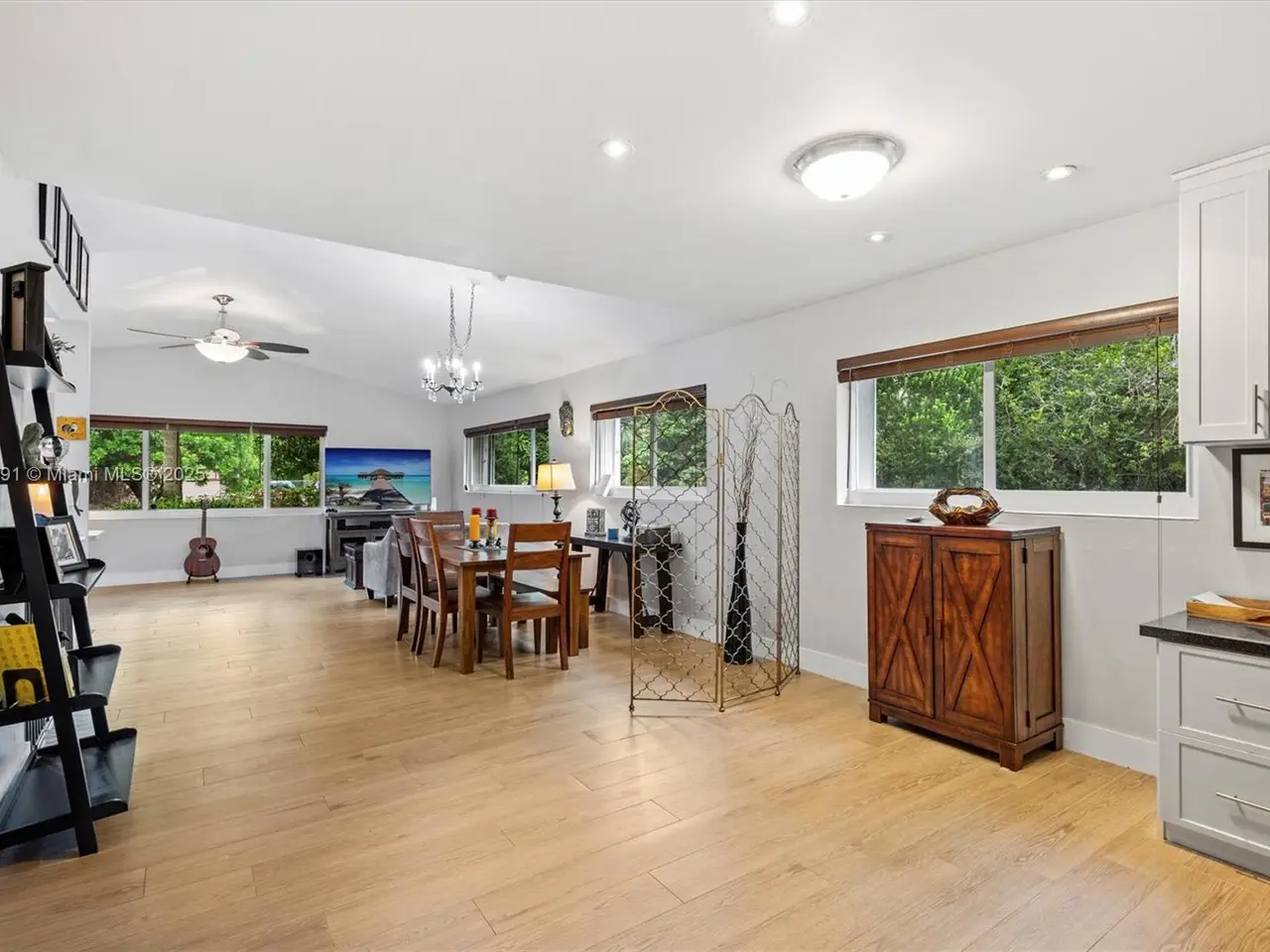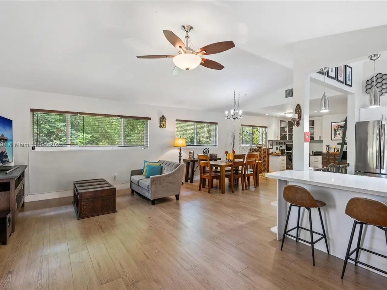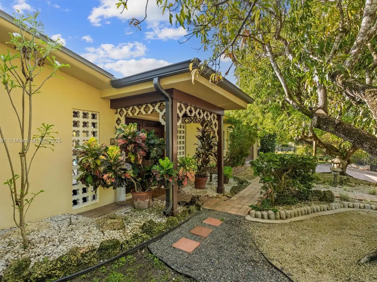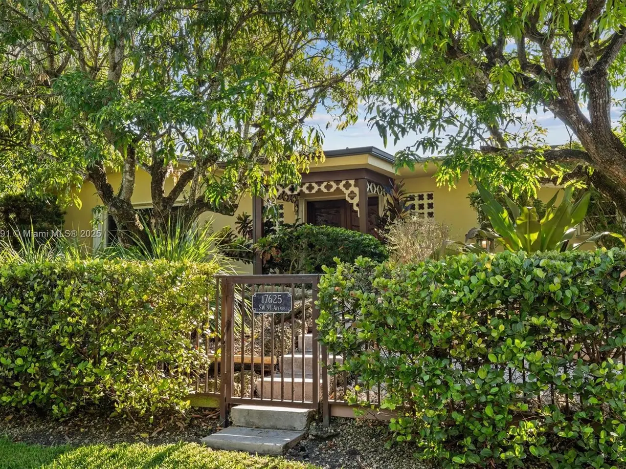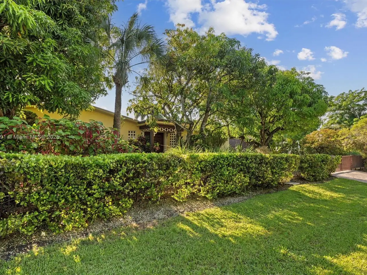 No HOA!! Not Flood Zone (X), 2019 Main House Metal Roof & Solar Panels. Garden Paradise in over 1/2 acre of land (25,200 sqft), Mango, Avocado, Lychee, Longan trees to enjoy nature privately. Beautiful 1-story house, 3 bedr./2 bath in Main House (3rd bedr. currently open office). Separate Guest House or In-Law Quarters with 1 bath & living room. Both structures built around a 6 Foot Saltwater & Heated Pool, screened w/outdoor sitting area & quartz counter extending from kitchen into pool area to enjoy with family. Remodeled kitchen with cathedral ceiling, quartz counter tops, stainless steel appliances, 3 tier lighting, 2 garage, auto sprinkler, impact glass main house, accordion shutters double protection, wood carved front door, 2022 A/C, space for boat. Great Schools & Close to Palmetto Bay Park.