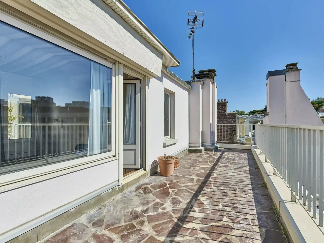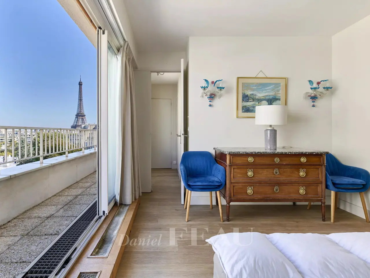 Sole Agent. This duplex apartment on the top floors (6th and 7th) of a little mid 20th century building benefits from three terraces and a balcony (63.64 sqm in total). Dual-aspect and bathed in sunshine throughout the day, it offers 86.96 sqm of living space as defined by the Carrez Law including a living/reception room, a separate kitchen (open-plan would be possible), a suite with a bathroom/wc and a dressing room, a second bedroom, a bathroom and a wc. A near 25 sqm terrace commands an open view of the Eiffel Tower. The apartment benefits from direct lift access. Renovation is required to exploit the full potential. With a cellar.