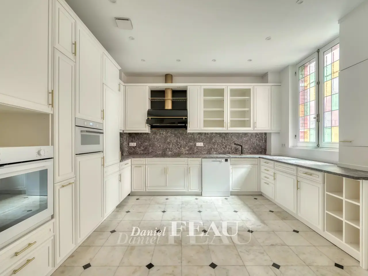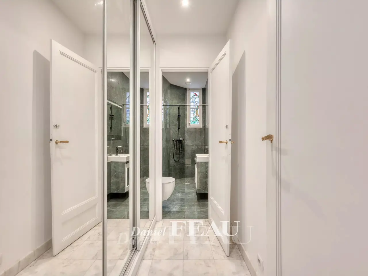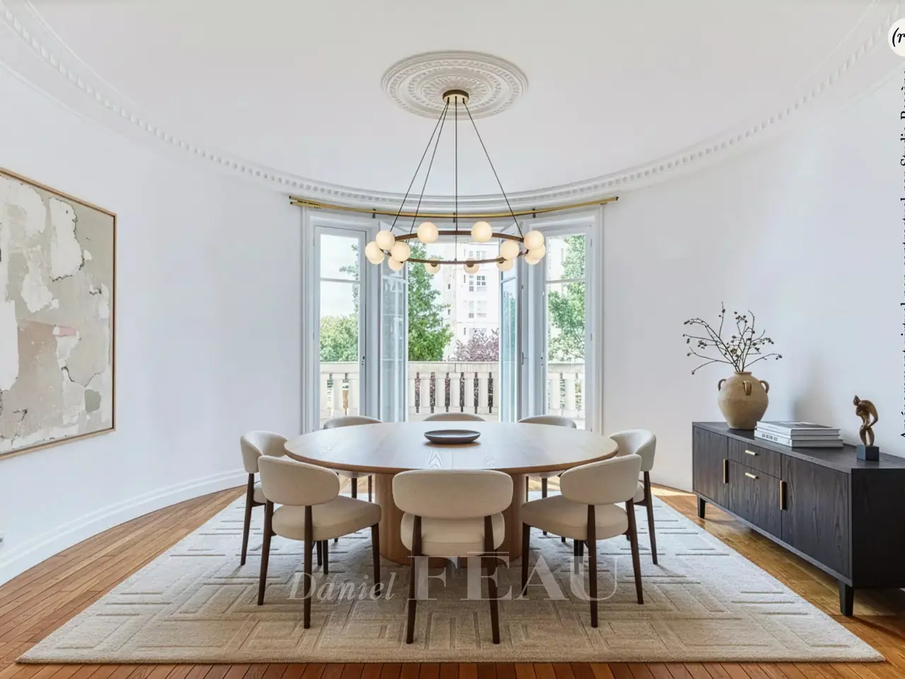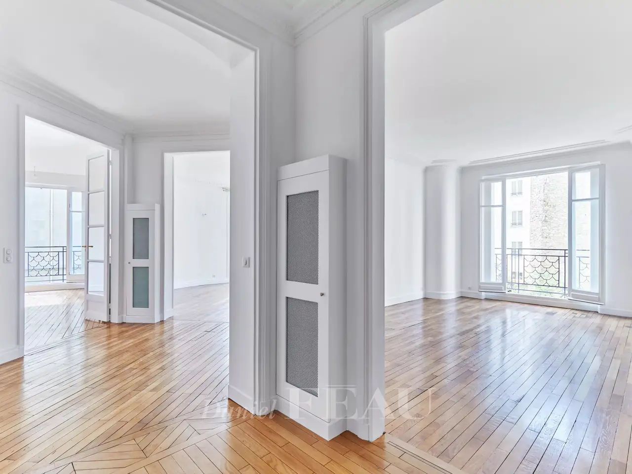 Sole Agent. This elegant apartment is on the 2nd floor of a perfectly maintained 1930s freestone building with luxurious common areas in a peaceful location between Place Rodin and Avenue Mozart in the immediate vicinity of Passy Village, the shops, the transport networks and the schools. Offering 159.04 sqm of living space as defined by the Carrez Law, it includes a rotunda living/reception room opening onto a balcony, a dining room, a spacious separate kitchen with dining facilities, two bedrooms with shower rooms opening onto a continuous balcony, a third bedroom, a shower room with a wc, and a dressing room. A second wc would be possible. Ample fitted storage space. Period features include 2.97 metre high ceilings with mouldings, parquet flooring, and wide floor-to-ceiling windows. South-facing, the apartment is particularly bright, and enjoys open views over leafy greenery. With a secure cellar benefiting from lift access, and two 8th floor storage rooms. The building has a caretaker, and is equipped with a door-entry code and an intercom.