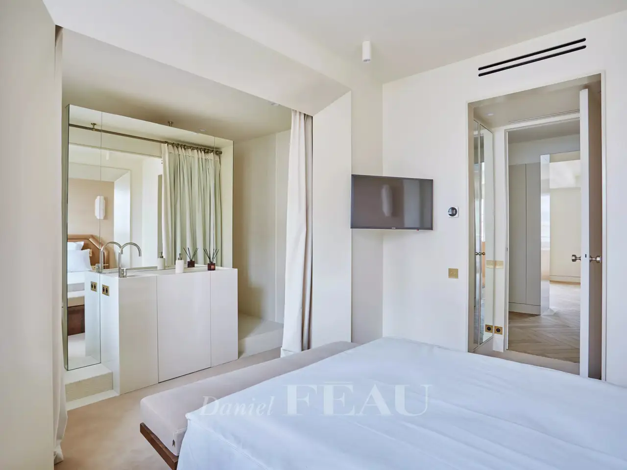This exceptional 123 sqm apartment is on the 7th floor of a relatively recent building located a stone’s throw from Place du Trocadéro. Commanding open views, it includes a spacious living/reception room/kitchen/diing room opening onto a continuous balcony, two suites with shower rooms and dressing rooms, and a guest wc. Air-conditioning. Sold fully furnished. With a cellar and a parking space.
