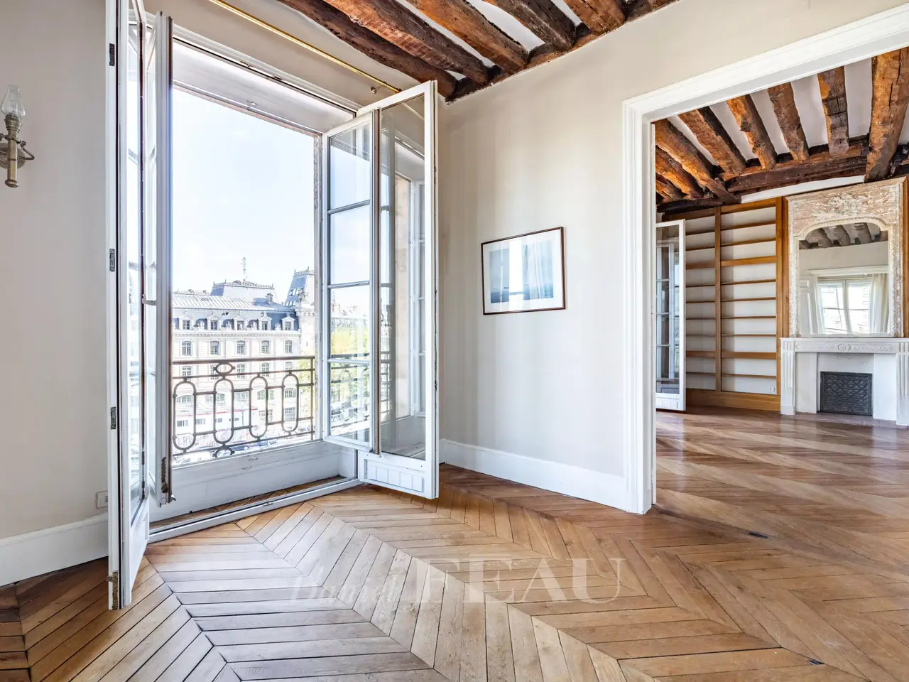 Quai Saint-Michel. This particularly bright apartment offering 90 sqm of living space as defined by the Carrez Law is on the 4th floor of a fine 18th century building with a lift and renovated common areas. Featuring 3.22 metre-high ceilings with exposed beams, Herringbone parquet flooring and a fireplace, it includes a double living/reception room enjoying a superb view of Notre-Dame Cathedral and the Seine, two bedrooms, a bathroom/wc and a shower room/ wc. Renovation is required to exploit the full potential.