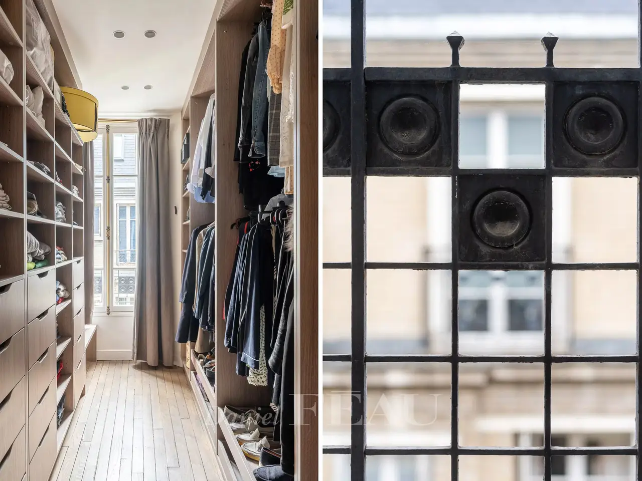 Suffren/Champ-de-Mars neighbourhood. This magnificent dual-aspect apartment benefiting from balconies enjoying open views is on the 6th floor of a fine early 20th century building with a caretaker and a lift. 114.62 sqm of bright living space in very good condition includes a south-west facing double living/reception room, a sitting/dining room with a fireplace, an open-plan kitchen, a master suite with a bath/shower room and wc, a dressing room, a bedroom with a shower room and a guest wc. Ample fitted storage space. With a maid’s bedroom (kitchenette/shower), and a fitted cellar.