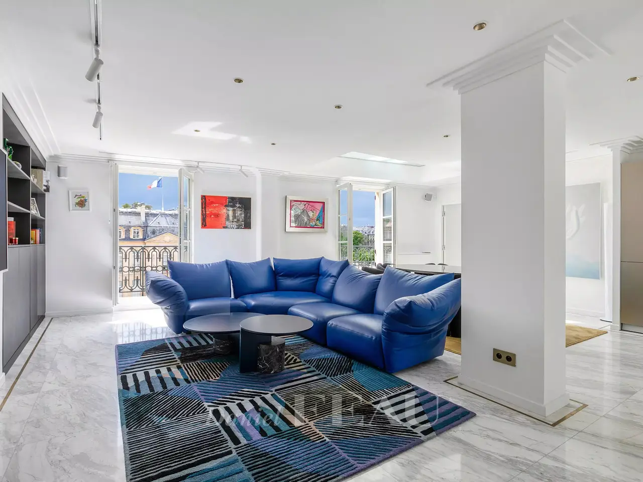 This south-west facing apartment on the top two floors of a secure 19th century building commands a stunning view of the Elysée Palace and the Eiffel Tower. 225 sqm of air-conditioned floor space and 206 sqm of living space as defined by the Carrez Law includes a double living/reception room opening onto a balcony, an open-plan kitchen, three suites with a bathroom/wc, a study with a skylight, a dressing room, a guest wc and a utility room. The apartment has been renovated in a tasteful contemporary style. With two cellars.