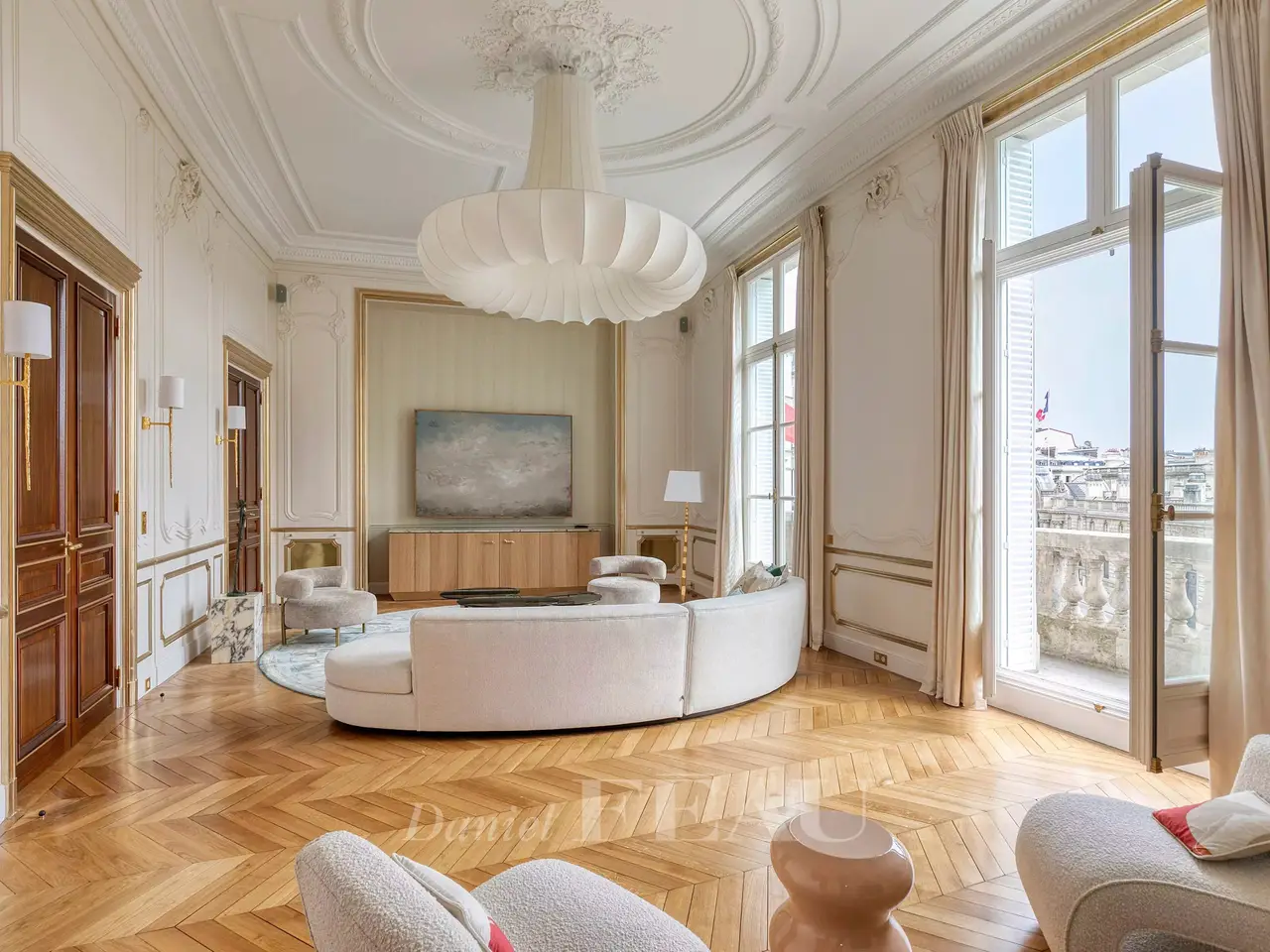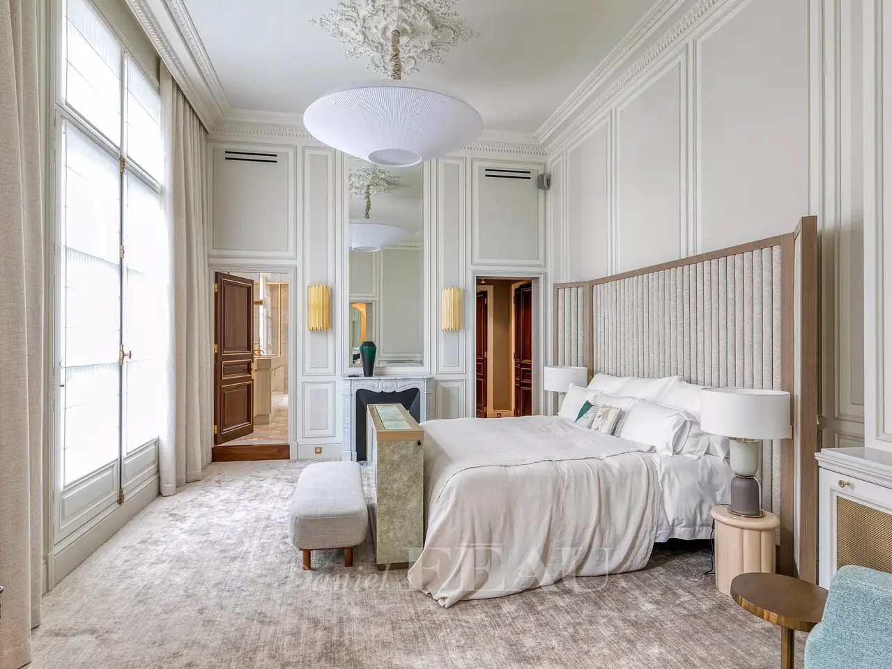 Unique. This magnificent apartment offering 350 sqm of floor space and 320 sqm of living space is on the 2nd floor of an elegant 18th century private mansion, the hôtel d'Orgemont, and overlooks Place Beauvau, the Elysee Palace, avenue de Marigny and Faubourg Saint Honoré. Renovated throughout by a renowned interior decorator and allying contemporary style and period elegance, it includes an entrance hall, a spacious living/reception room with a panelled study benefiting from wide floor-to-ceiling windows overlooking Place Beauvau, a dining room featuring a monumental fireplace and stained glass, a fully equipped kitchen with dining facilities, a second kitchen, a utility room, a storage room, a luxurious master suite with a mahogany dressing room and a complete marble-tiled bathroom, a second suite with a shower room and a dressing room, a spare bedroom with a shower room, and a guest wc. Air conditioning. With 5th floor staff studio apartment and study (20 sqm in total), and three cellars.