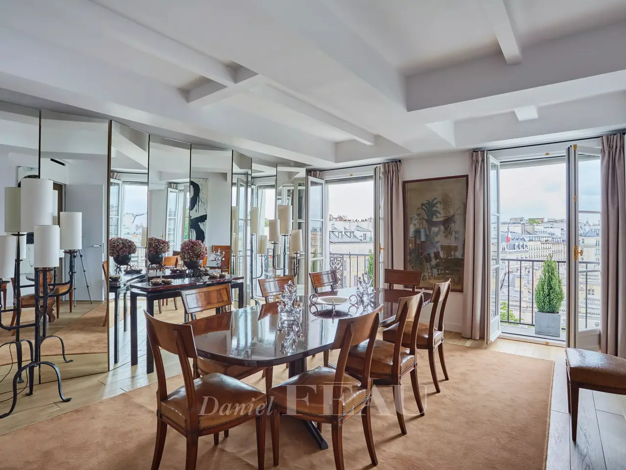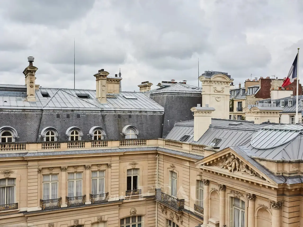 Avenue de Marigny. This superb apartment occupies the entire top floors (5th and 6th) of an elegant early 19th century building which was acquired in the mid 1950’s by James and Elie Rothschild, and the apartment itself was the Parisian pied a terre of Gianni and Marella Agnelli for many years. Offering 219 sqm of floor space and 208 sqm of living space as defined by the Carrez Law, it has been meticulously renovated and decorated throughout. It includes a living/reception room and dining room opening onto a 9 sqm continuous balcony, a drawing room or study, a kitchen with dining facilities, a guest wc, and a master suite with a bathroom, a dressing room and a wc. The top floor comprises two further suites and a utility room. Reversible air conditioning. With an 11 sqm vaulted cellar. A parking space may be possible in a side street. The building’s environment is remarkable, being in the immediate vicinity of the Elysée Palace, formerly the Hotel d’Evreux which was offered by King Louis XV to the Marquis de Marigny in 1753. Also close by is 23 avenue Marigny and the Hôtel de Marigny, built in 1873 for Baron Gustave de Rothschild, and currently a residence for the Presidential palace’s prestigious guests.