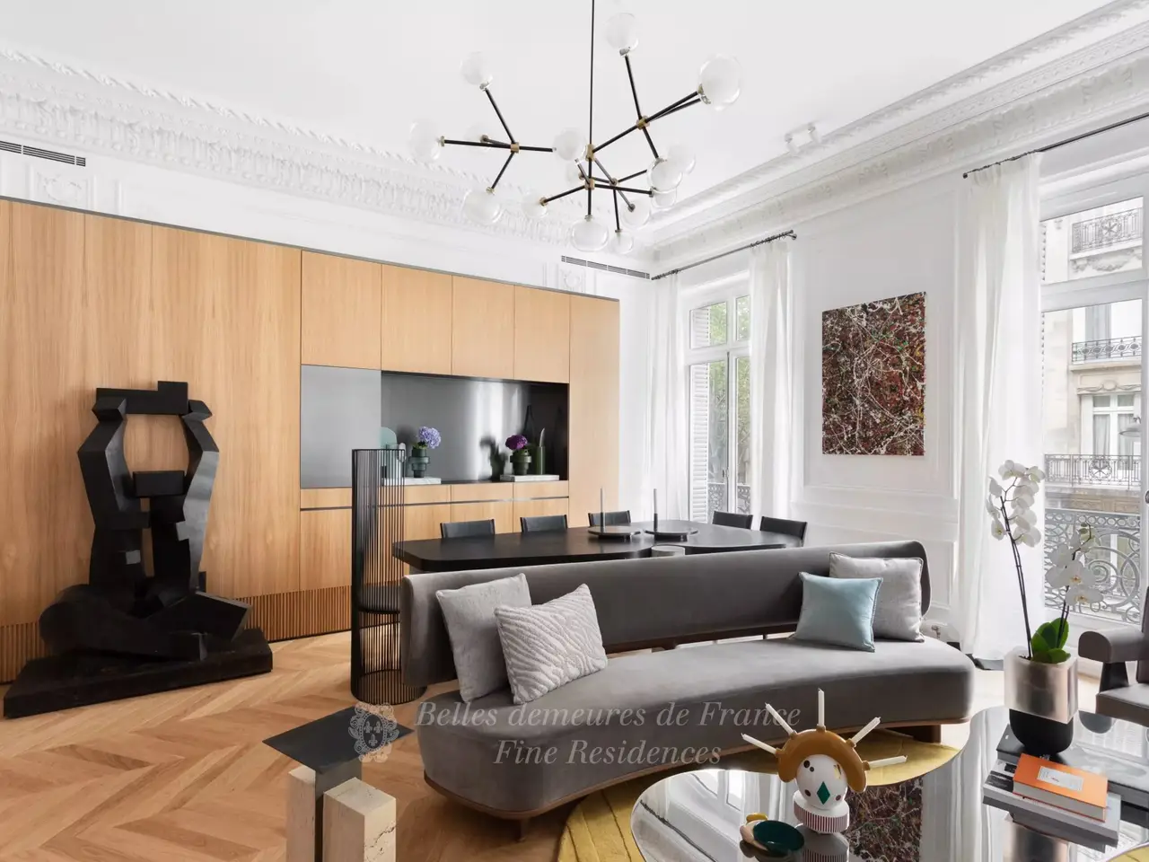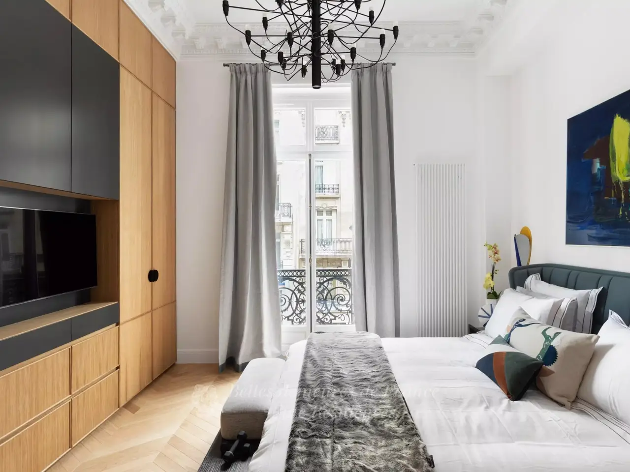 Avenue Georges V. This apartment on the second floor of a fine mid 19th century freestone building has been meticulously renovated throughout. Offering about 106 sqm of living space, it includes a living/dining room, an equipped kitchen, two bedrooms with bathrooms, and a guest wc. Air-conditioning. With a cellar. An ideal pied a terre in the heart of the capital’s prestigious Golden Triangle.