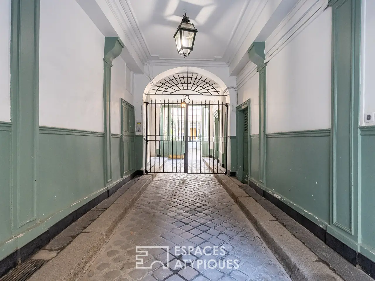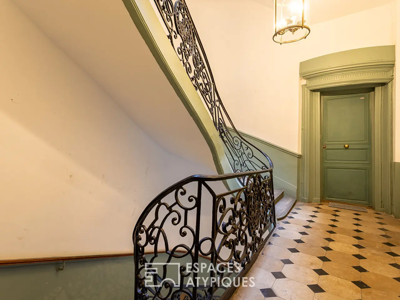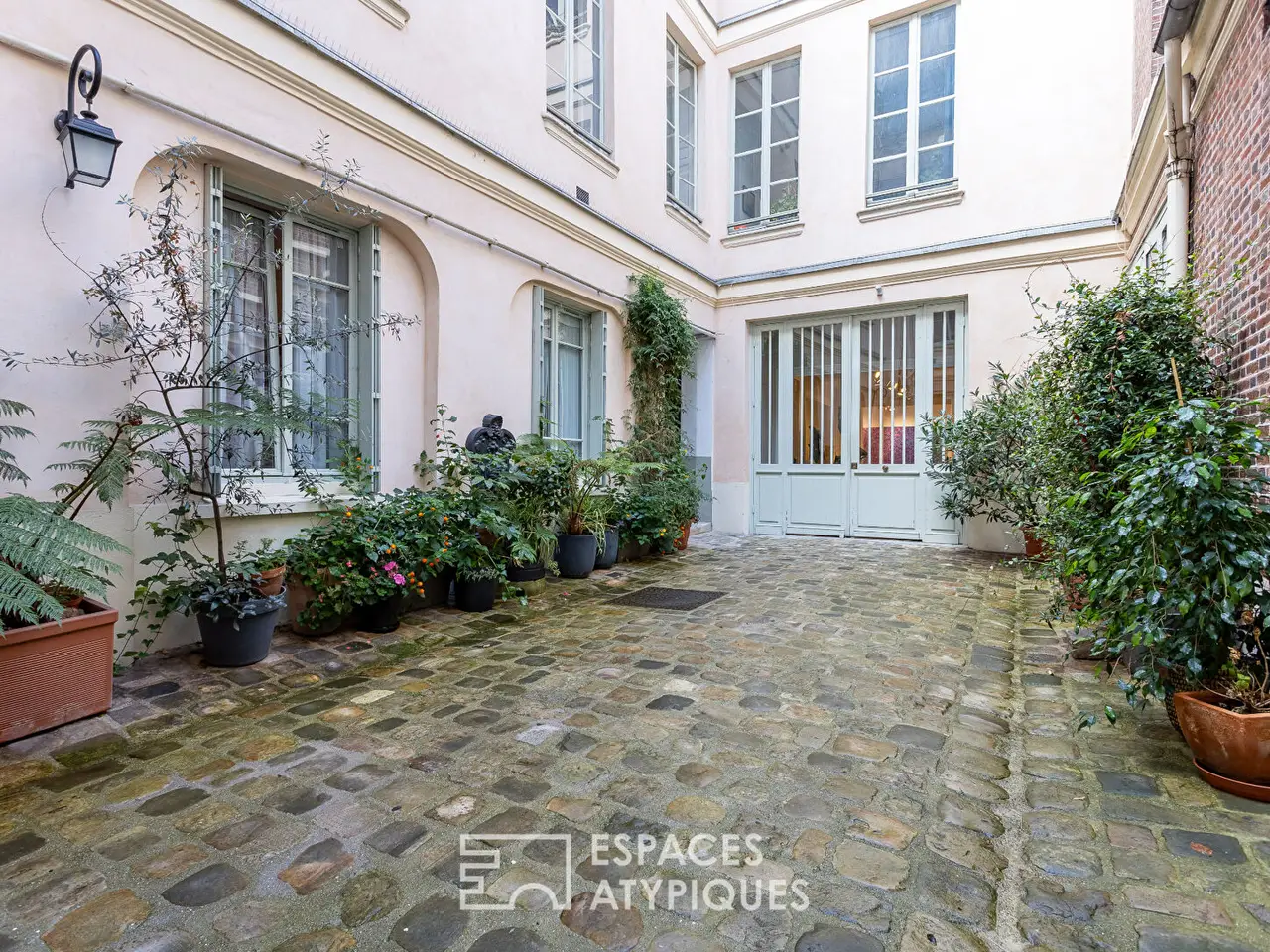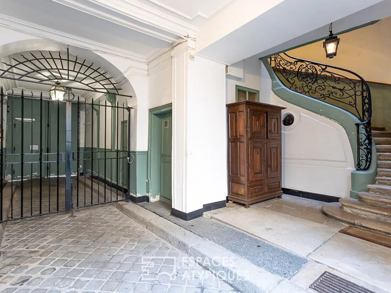 Near Place des Vosges, this 99.18 m2 (50.22 m2 Carrez law) duplex apartment is located on the top floors of a charming, well-maintained 17th-century condominium. On the 4th floor, the entrance opens via a staircase to a large living room of over 40 m2, punctuated by exposed half-timbered beams, creating several spaces bathed in light thanks to the multiple openings. A contemporary-style kitchen opens onto a dining area and adjoins a cozy living room. The upper floor, accessible via a designer staircase by Roger Tallon, houses an attic bedroom with a walk-in shower room. An office space and a separate toilet complete this level. This bright duplex, characterized by its unobstructed view overlooking Place des Vosges, offers a pleasant living space combining comfort and old-world charm in the heart of the historic Marais district. Subject to the condominium status. Metro: Saint Paul REF. 13022 Additional information * 2 rooms * 1 Bedroom * 1 bathroom * Floor : 4 * 5 floors in the building * 11 co-ownership lots * Annual co-ownership fees : 2 760 € * Property tax : 1 350 € * Proceeding : Non Energy Performance Certificate Primary energy consumption e : 315 kWh/m2.year High performance housing