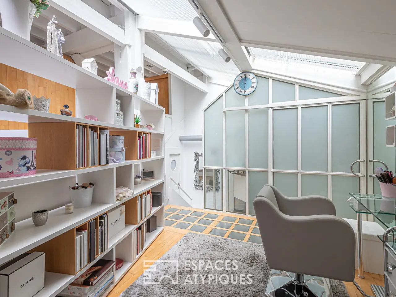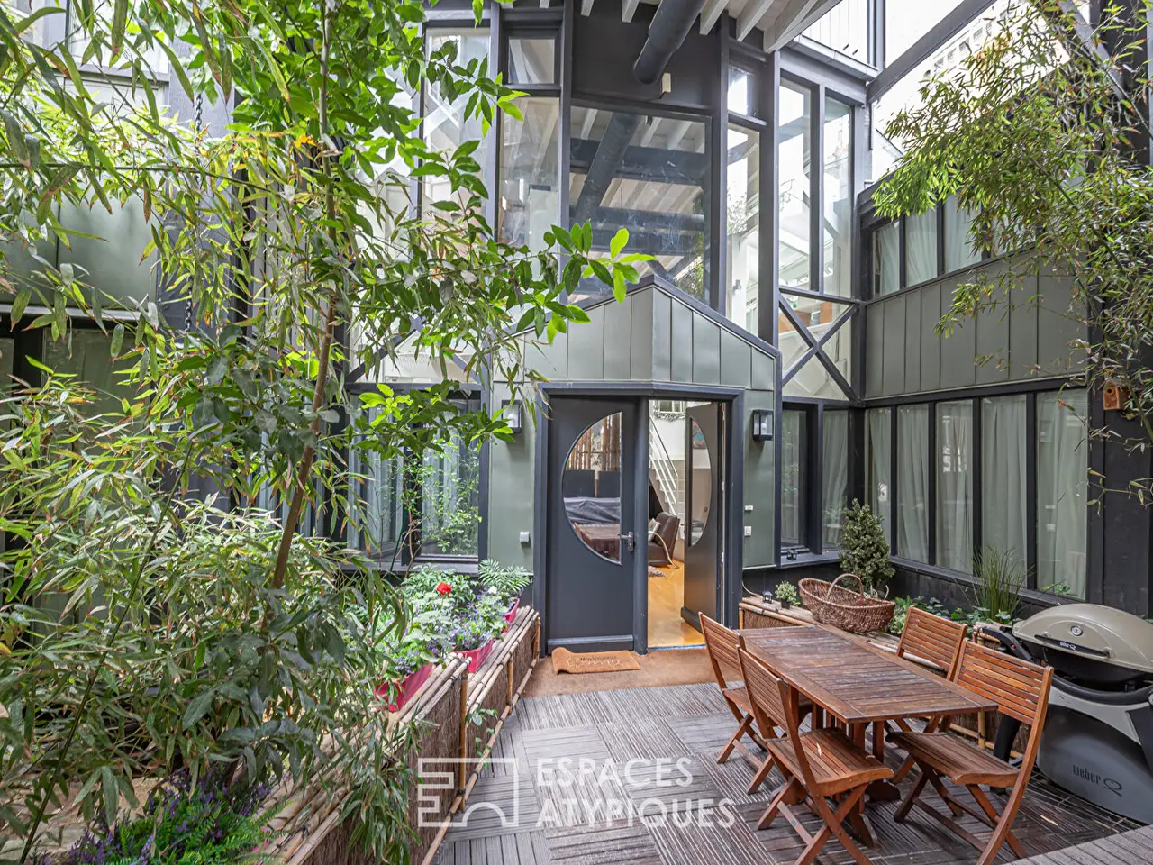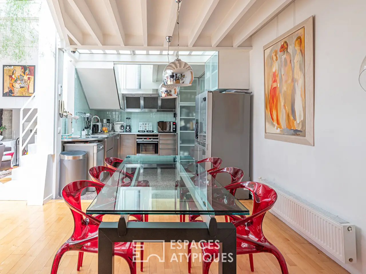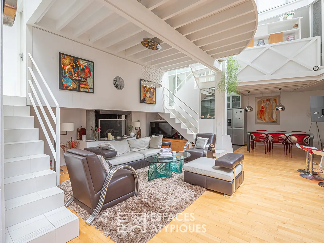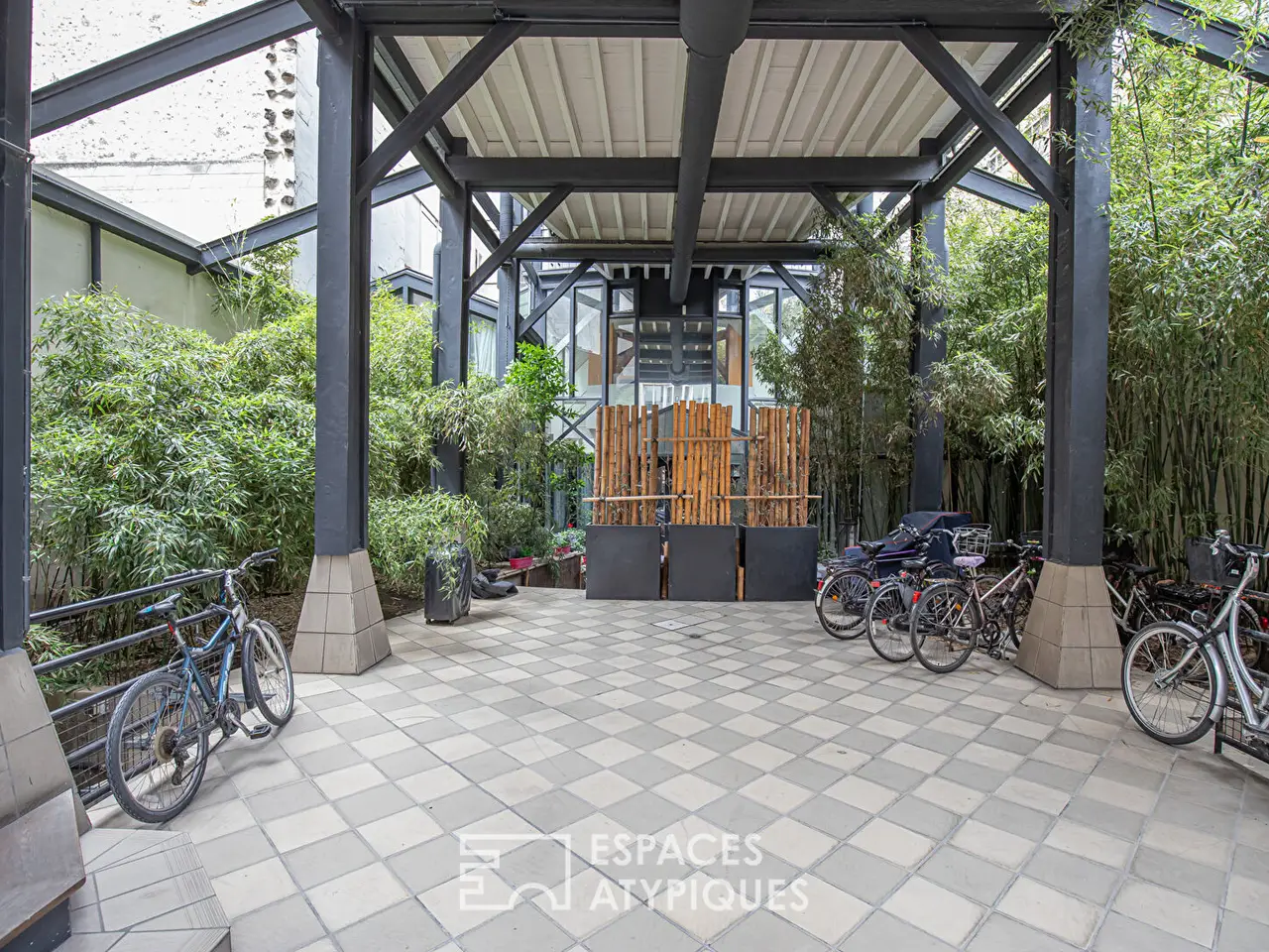 Located near the 11th century Town Hall in a quiet cul-de-sac, this house-style duplex of 170 m2 (160.24 m2 Carrez) benefits from a 16 m2 green terrace for exclusive enjoyment. The entrance on the ground floor opens onto a living room and a dining area with a semi-open kitchen totaling 59 m2 under 6.25 meters in height at the ridge. A second living room of 18 m2, an office of 12 m2 which can be transformed into a third bedroom and a laundry room complete this level. Two staircases rise from either side of the fireplace, leading to the 1st floor with two bedrooms of 12 and 20 m2 each with a shower room or a bathroom, as well as two dressing rooms of 9 and 17 m2. On the half floor there are two independent toilets. This warm duplex living space enjoys calm, a lack of privacy and constant light thanks to its numerous openings and its main South-East exposure. Well subject to the status of the co-ownership benefiting from an easily accessible bicycle parking space. Metros: Voltaire, Richard-Lenoir and Chemin-Vert REF. 6814 Additional information * 5 rooms * 2 bedrooms * 1 bathroom * 1 bathroom * Outdoor space : 16 SQM * 28 co-ownership lots * Annual co-ownership fees : 2 780 € * Property tax : 1 967 €