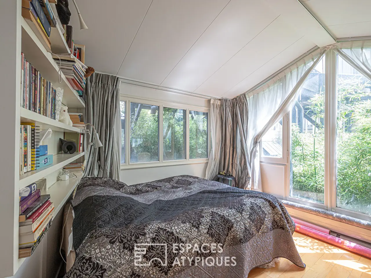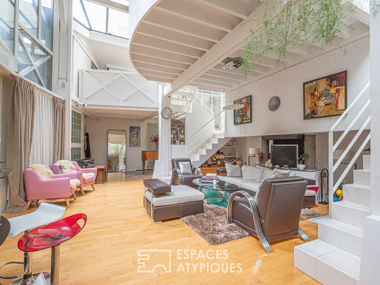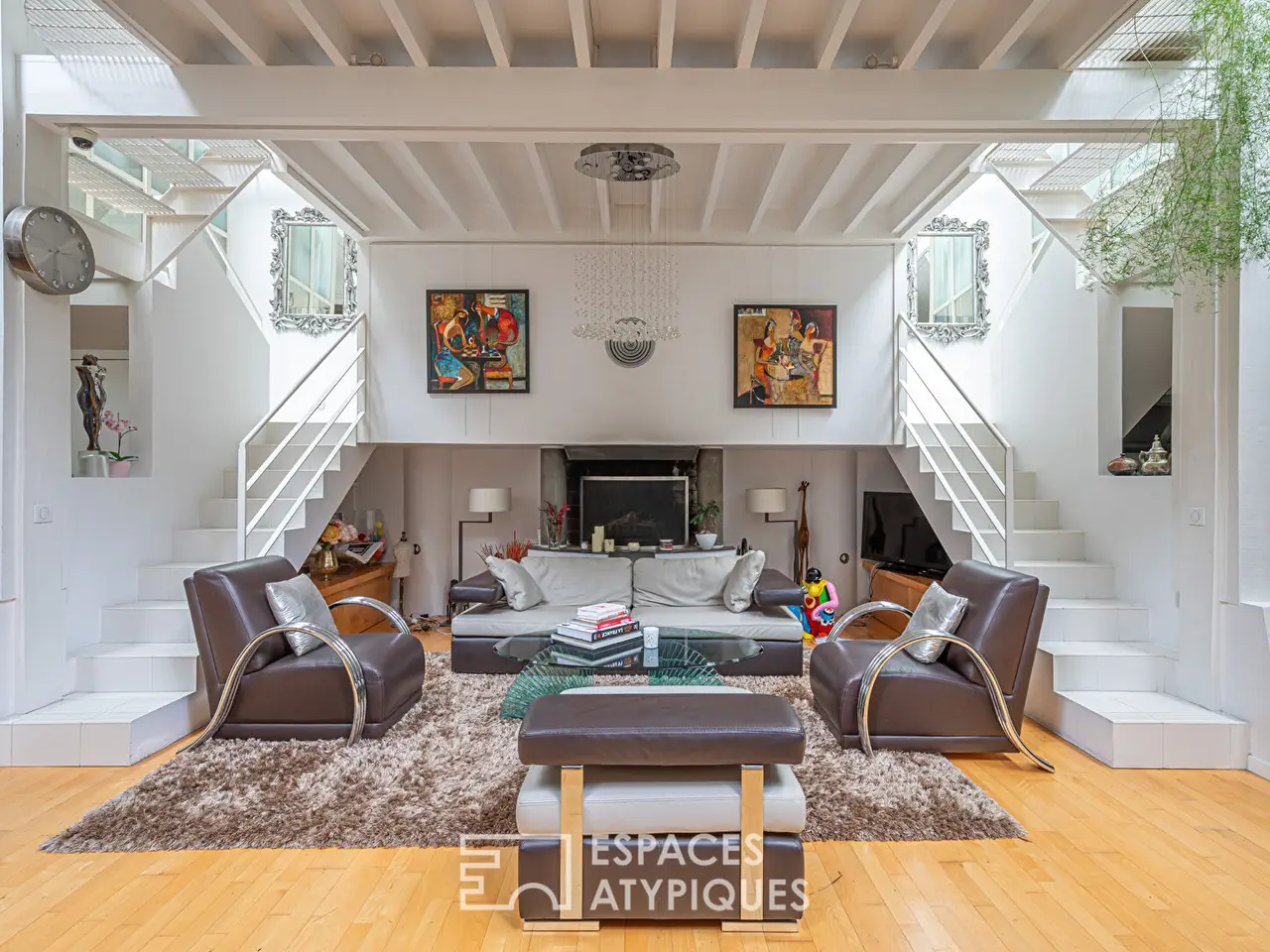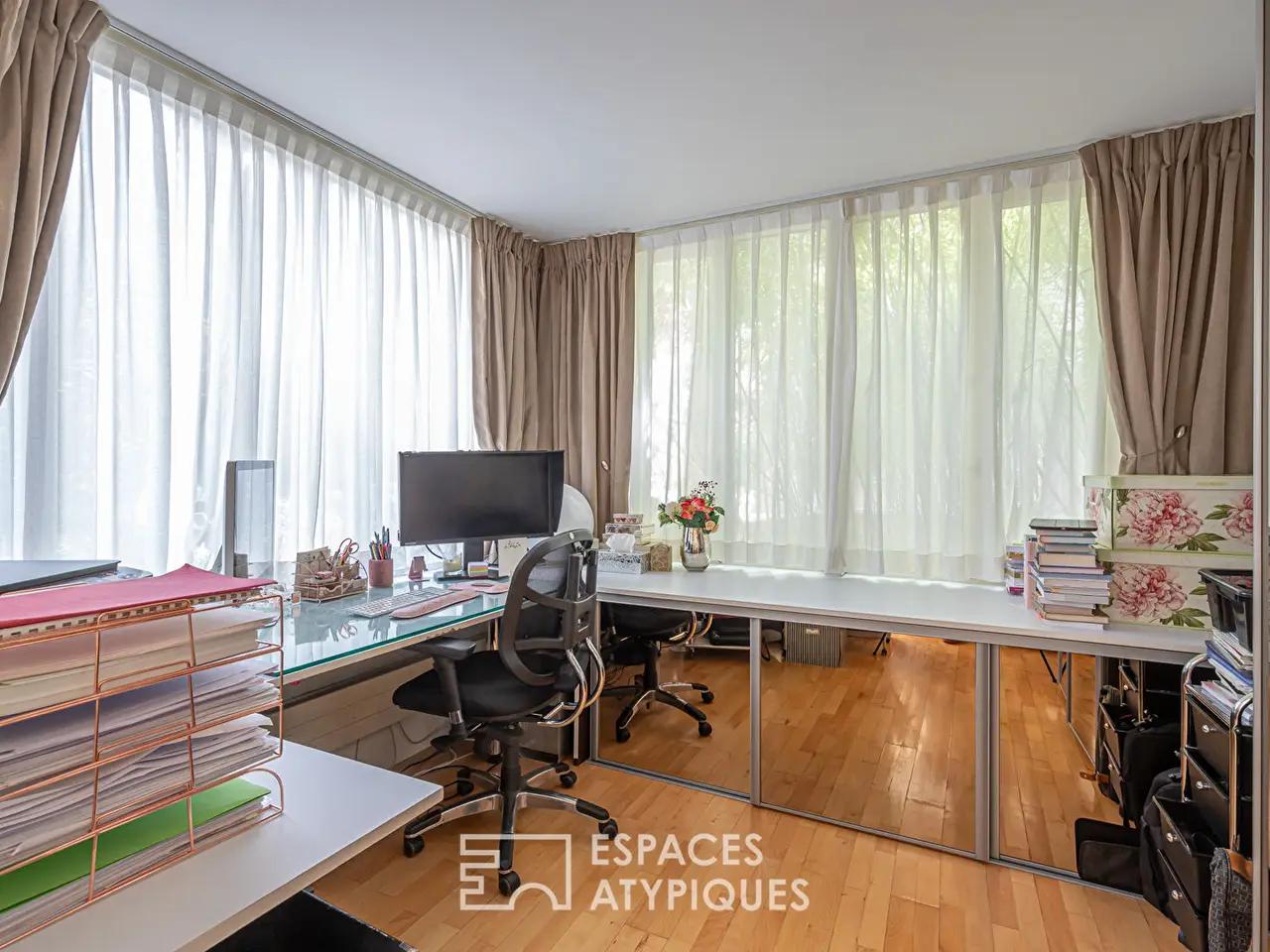 Located near the 11th century Town Hall in a quiet cul-de-sac, this house-style duplex of 170 m2 (160.24 m2 Carrez) benefits from a 16 m2 green terrace for exclusive enjoyment. The entrance on the ground floor opens onto a living room and a dining area with a semi-open kitchen totaling 59 m2 under 6.25 meters in height at the ridge. A second living room of 18 m2, an office of 12 m2 which can be transformed into a third bedroom and a laundry room complete this level. Two staircases rise from either side of the fireplace, leading to the 1st floor with two bedrooms of 12 and 20 m2 each with a shower room or a bathroom, as well as two dressing rooms of 9 and 17 m2. On the half floor there are two independent toilets. This warm duplex living space enjoys calm, a lack of privacy and constant light thanks to its numerous openings and its main South-East exposure. Well subject to the status of the co-ownership benefiting from an easily accessible bicycle parking space. Metros: Voltaire, Richard-Lenoir and Chemin-Vert REF. 6814 Additional information * 5 rooms * 2 bedrooms * 1 bathroom * 1 bathroom * Outdoor space : 16 SQM * 28 co-ownership lots * Annual co-ownership fees : 2 780 € * Property tax : 1 967 €