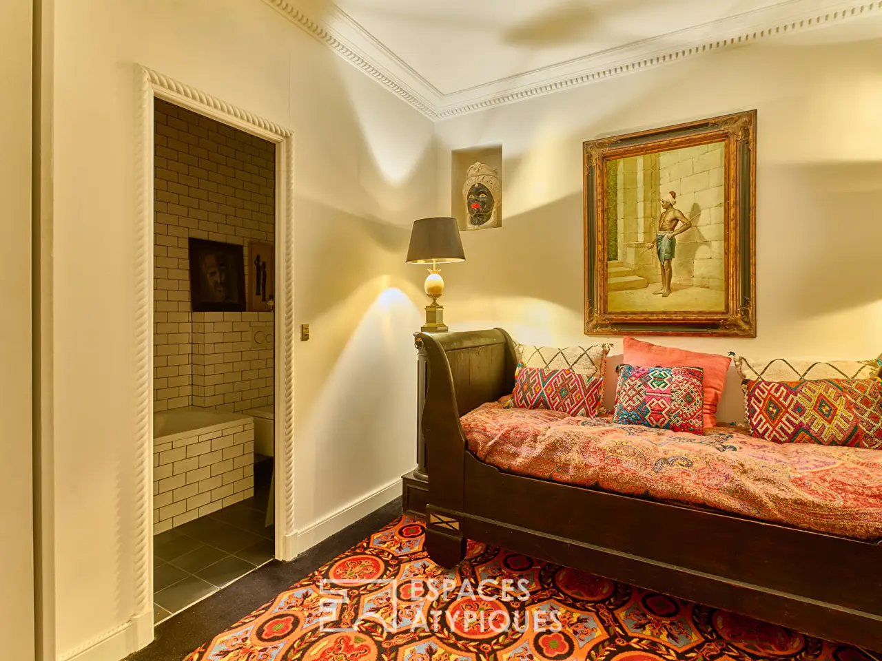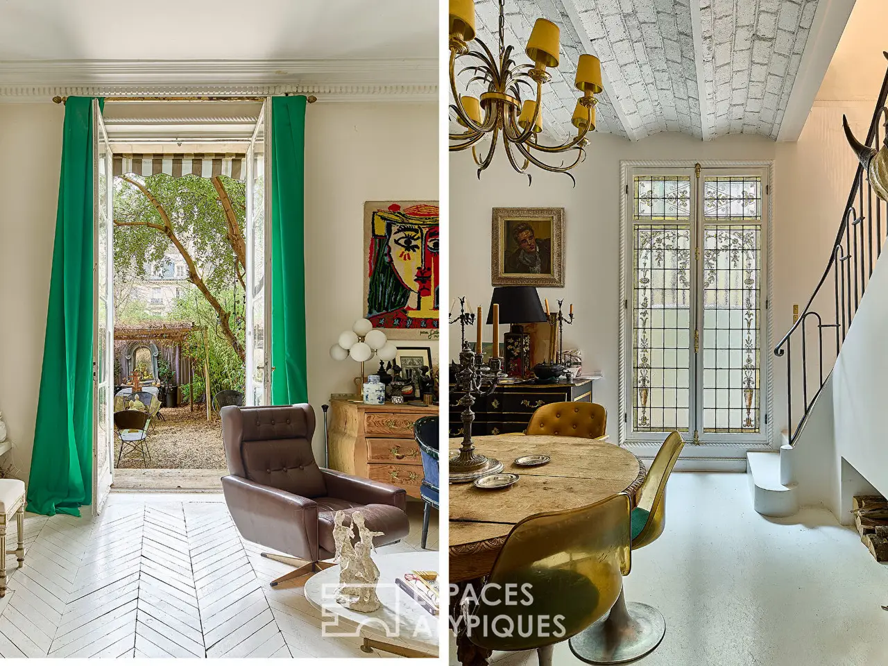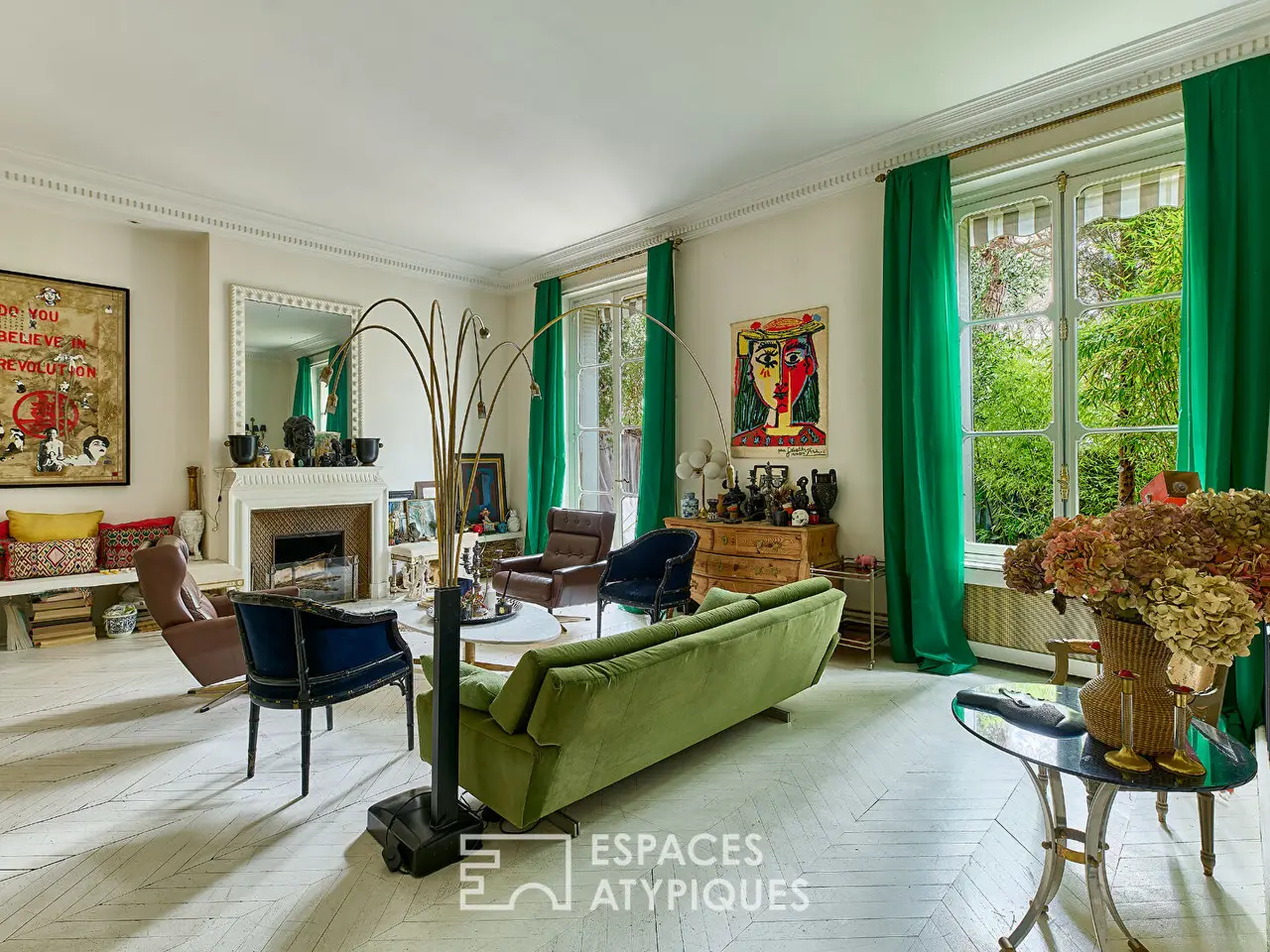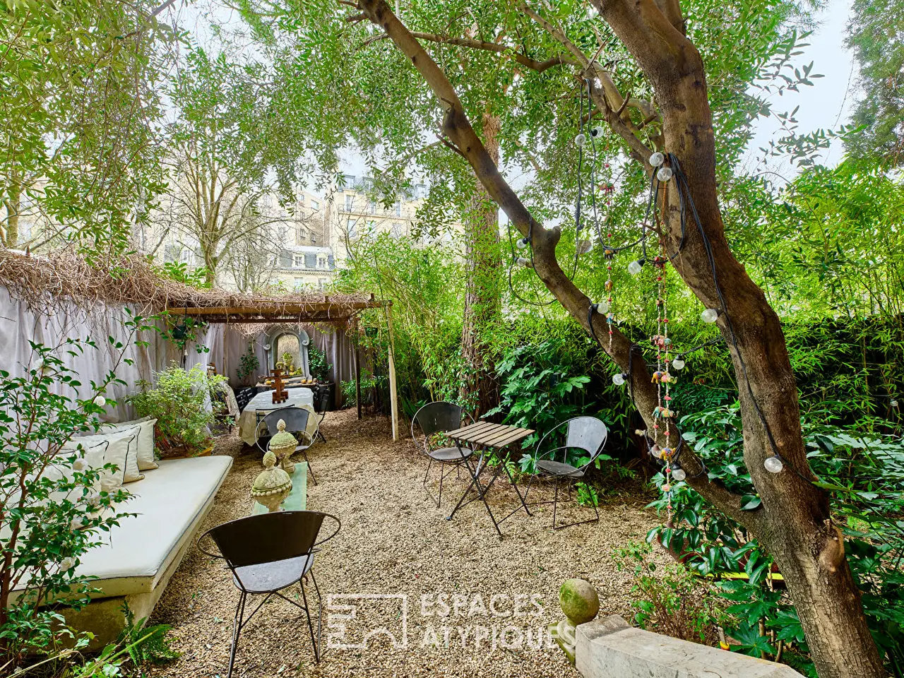 Located on the prestigious Avenue Georges Mandel, this 120.51 sqm apartment (108.31 sqm Carrez) seduces with its character and uniqueness. Nestled on the garden level of a luxury building, it benefits from a 46 sqm outdoor wooded space, a true haven of peace in the heart of Paris. The apartment opens onto an entrance announcing a beautiful ceiling height of 3.70 meters. Equipped with a built-in library, an office area and a guest toilet, it is extended by an elegant living room decorated with a functional fireplace. This living room opens directly onto the garden, like a natural extension of the apartment which offers a summer lounge and a shaded dining area under a pergola, all facing due south. Continuing on from the living room, a double door reveals a noble, intimate and cozy suite. The bedroom has plenty of built-in storage and is accompanied by a bathroom with double sink and toilet. Return to the living space, where the visit continues to the lower level by taking a beautiful staircase. This serves an astonishing room in an English courtyard, hosting a dining room and its open kitchen with a timeless design. The vaults, the French window in clear stained glass and the staircase descent reinforce the eclectic style of the place. The visit ends in a second intimate bedroom with its own bathroom with toilet. The carefully selected materials and architectural details bring a resolutely high-end touch in an arty style. The privileged location allows easy access to the Trocadero gardens, many shops, transport, schools and wooded walks. A large 25 m2 cellar as well as two parking spaces complete this exceptional property. Trocadero Metro (Lines 6 and 9) REF. 9386 Additional information * 3 rooms * 2 bedrooms * 1 bathroom * 1 bathroom * 6 floors in the building * Outdoor spaces : 46 SQM * Parking : 2 parking spaces * 20 co-ownership lots * Annual co-ownership fees : 8 660 € * Property tax : 2 682 € * Proceeding : Non Energy Performance Certificate Primary energy consumption d : 200 kWh/m2.an High performance housing
