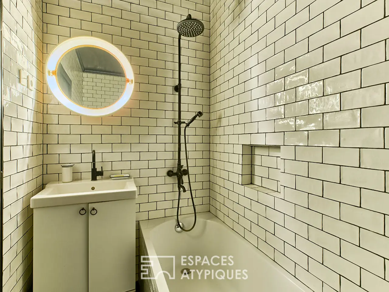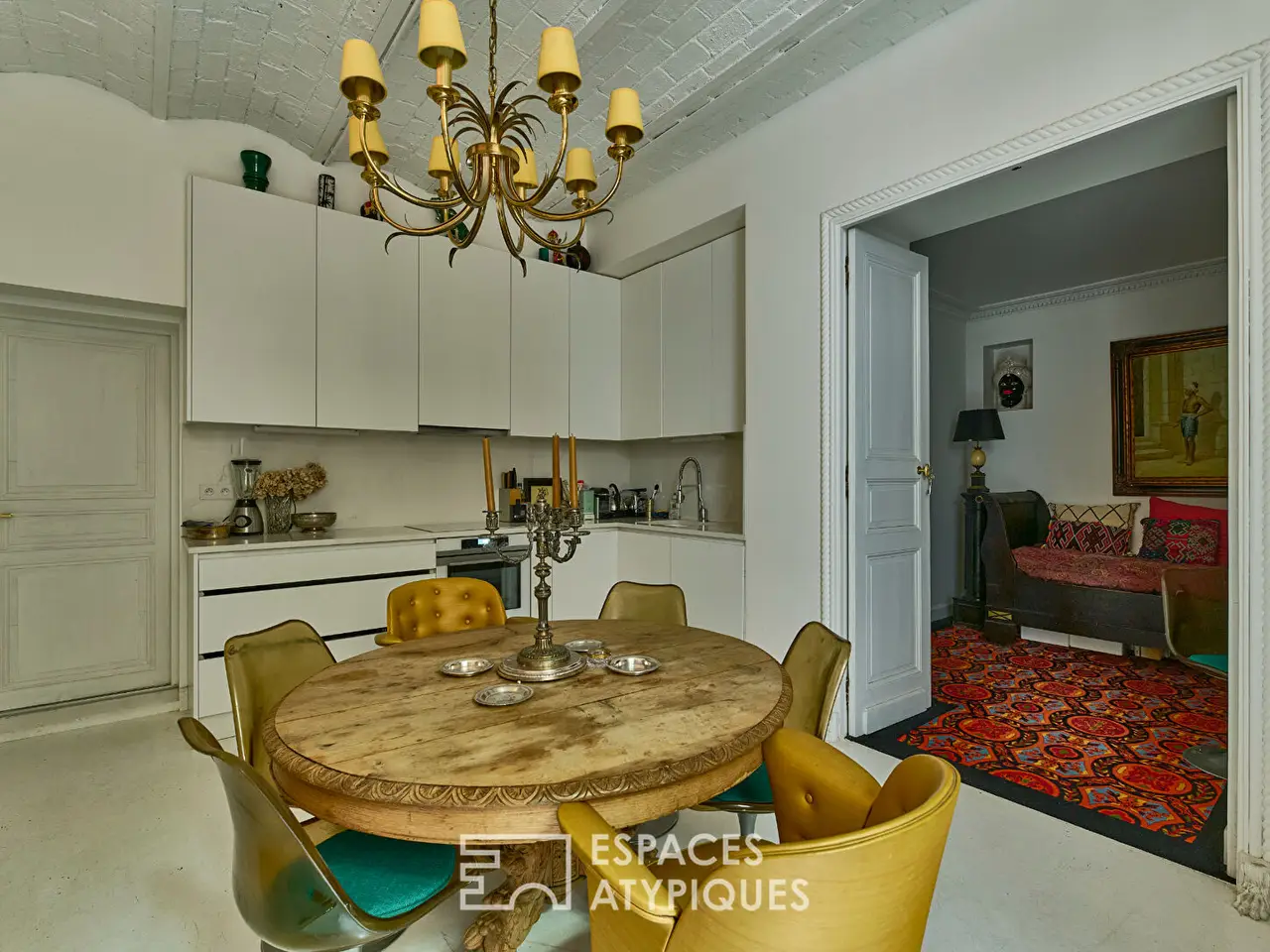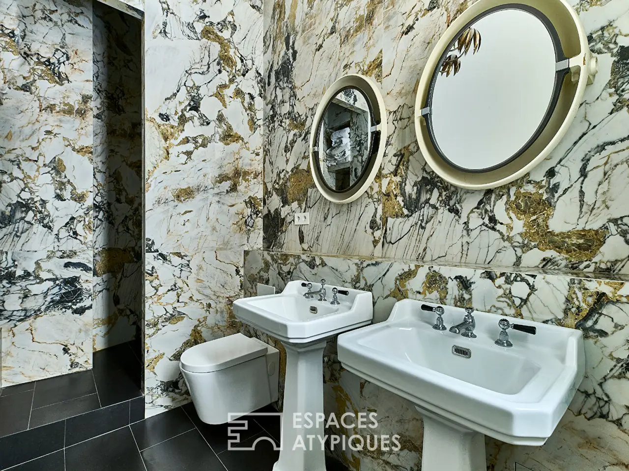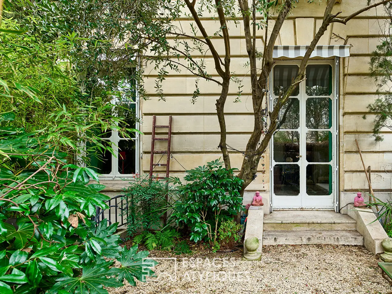 Located on the prestigious Avenue Georges Mandel, this 120.51 sqm apartment (108.31 sqm Carrez) seduces with its character and uniqueness. Nestled on the garden level of a luxury building, it benefits from a 46 sqm outdoor wooded space, a true haven of peace in the heart of Paris. The apartment opens onto an entrance announcing a beautiful ceiling height of 3.70 meters. Equipped with a built-in library, an office area and a guest toilet, it is extended by an elegant living room decorated with a functional fireplace. This living room opens directly onto the garden, like a natural extension of the apartment which offers a summer lounge and a shaded dining area under a pergola, all facing due south. Continuing on from the living room, a double door reveals a noble, intimate and cozy suite. The bedroom has plenty of built-in storage and is accompanied by a bathroom with double sink and toilet. Return to the living space, where the visit continues to the lower level by taking a beautiful staircase. This serves an astonishing room in an English courtyard, hosting a dining room and its open kitchen with a timeless design. The vaults, the French window in clear stained glass and the staircase descent reinforce the eclectic style of the place. The visit ends in a second intimate bedroom with its own bathroom with toilet. The carefully selected materials and architectural details bring a resolutely high-end touch in an arty style. The privileged location allows easy access to the Trocadero gardens, many shops, transport, schools and wooded walks. A large 25 m2 cellar as well as two parking spaces complete this exceptional property. Trocadero Metro (Lines 6 and 9) REF. 9386 Additional information * 3 rooms * 2 bedrooms * 1 bathroom * 1 bathroom * 6 floors in the building * Outdoor spaces : 46 SQM * Parking : 2 parking spaces * 20 co-ownership lots * Annual co-ownership fees : 8 660 € * Property tax : 2 682 € * Proceeding : Non Energy Performance Certificate Primary energy consumption d : 200 kWh/m2.an High performance housing