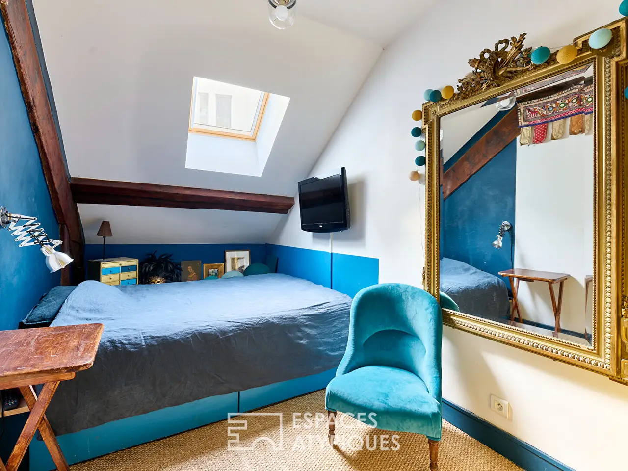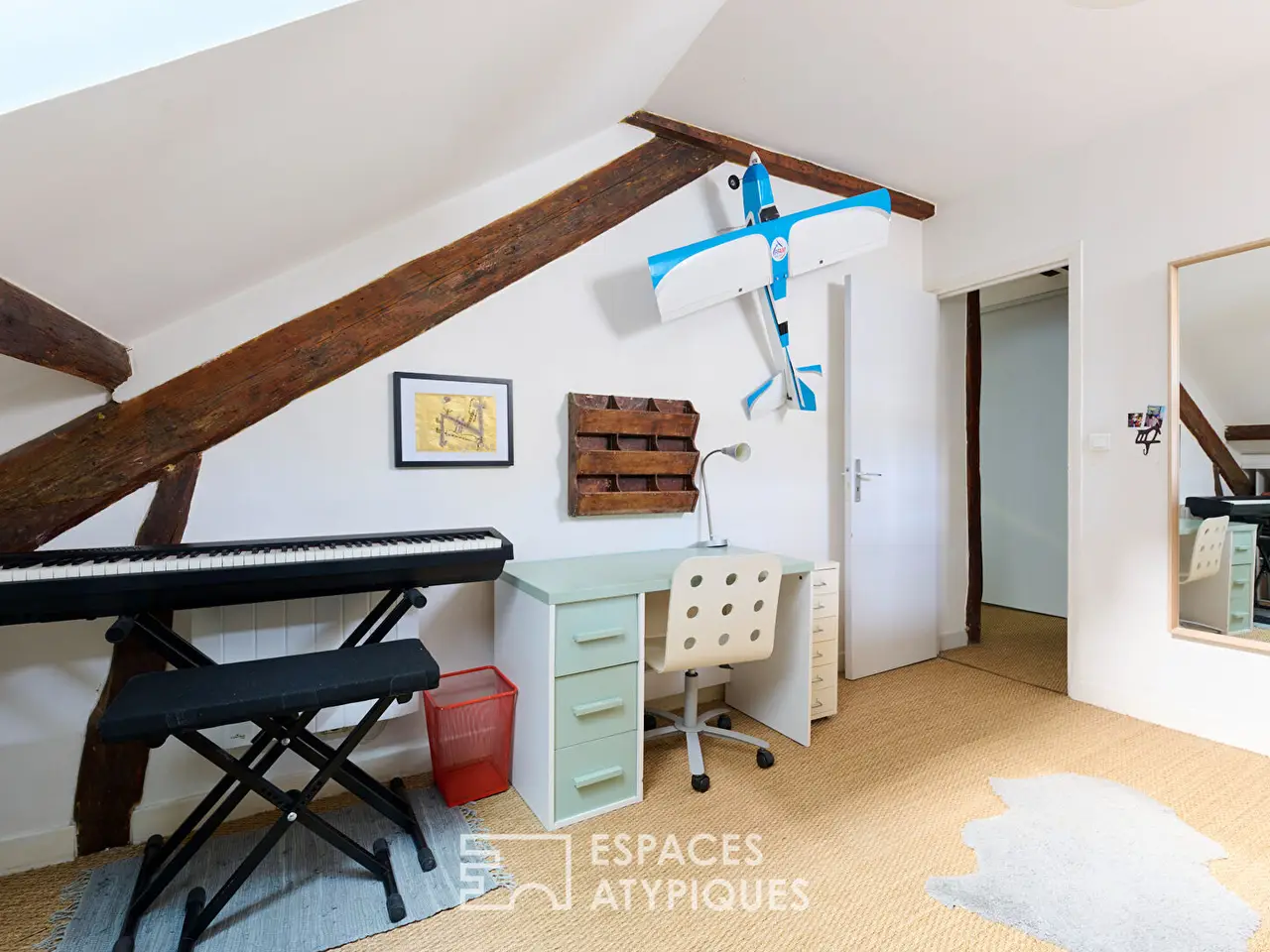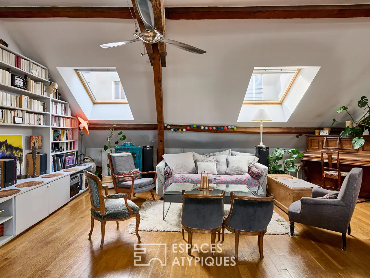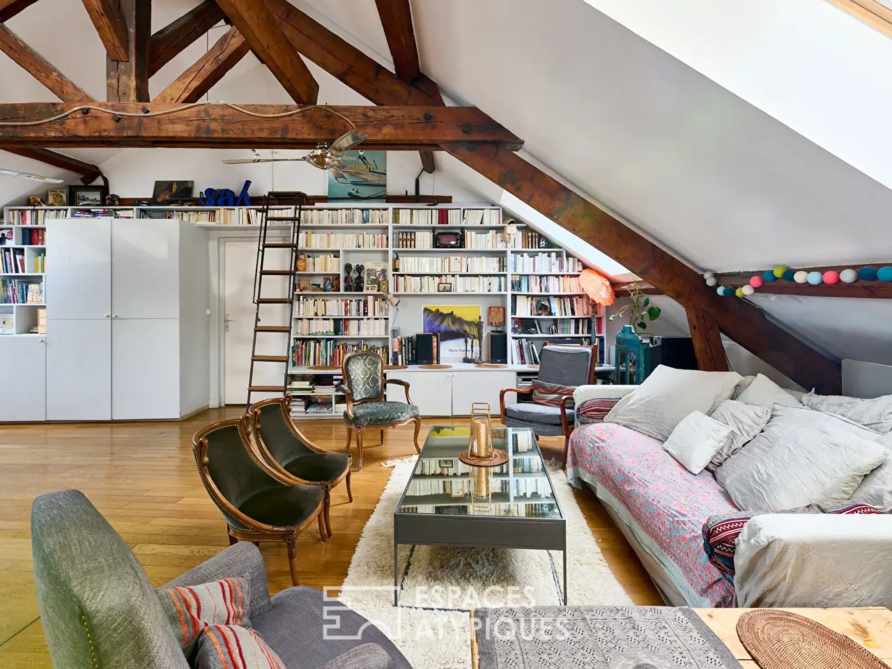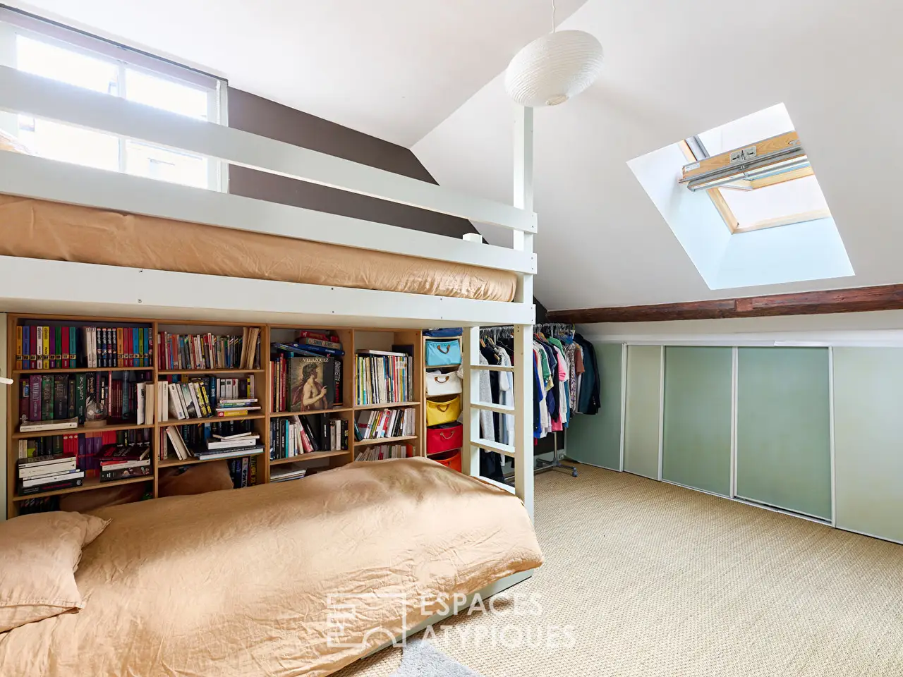 Ideally located a few hundred meters from the Jardin de Reuilly, this loft of 211.77m2 on the ground (129.09m2 Carrez) is hidden out of sight. This apartment, a former cabinetmaking workshop, has been completely reinvented by these owners. Accessible by a few steps, the entrance hall with integrated storage opens onto a living room of more than 91.43m2 on the ground (58.25m2 Carrez) under 4.25 meters of ceiling height. The main room consists of a living room, an open American kitchen with bar counter and a dining area with a wood stove. The double East-West exposure supplemented by 6 zenithal openings ensures preponderant light. Two sleeping areas take place on either side of the living room. On one side, 3 bedrooms with storage and a bathroom with WC. On the other hand, and ensuring privacy, a master bedroom with bathroom and WC. Two attics accessible from the living room offering additional storage space complete the package. REF. 9577 Additional information * 5 rooms * 4 bedrooms * 1 bathroom * 1 bathroom * Floor : 3 * 3 floors in the building * 57 co-ownership lots * Annual co-ownership fees : 3 216 € * Property tax : 830 € * Proceeding : Non Energy Performance Certificate Primary energy consumption e : 283 kWh/m2.an High performance housing