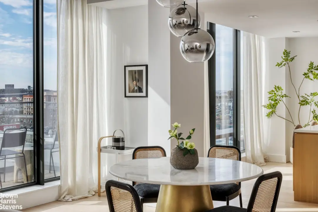 Welcome to PH8D at 251 1st Street, a breathtaking penthouse designed by ODA that blends contemporary design with unparalleled craftsmanship. This expansive three-bedroom, 2.5-bathroom residence features an impressive 1,669 SF interior floorplan, sophisticated finishes, two spacious terraces and panoramic south-facing views through floor-to-ceiling glass windows, allowing abundant natural light to fill the space. With 9'4" ceilings, every room feels open and airy, offering a perfect balance of style and function in one of Brooklyn's most sought-after neighborhoods. The sleek, chef-inspired kitchen is a true standout, showcasing custom-built satin lacquer cabinetry, stainless steel storage below, and top-of-the-line Gaggenau appliances. The striking kitchen island, crafted from Anegre wood and topped with Pure White Caesarstone, offers both form and function, making it the ideal space for cooking and entertaining. The primary bathroom exudes luxury with stunning White Sivec marble floors and walls, paired with Watermark fixtures for an elevated experience. Oversized mirrors with integrated lighting, a double-sink vanity with ample storage, and recessed medicine cabinets add to the bathroom's elegance and functionality. The secondary bathrooms are equally refined, featuring an artful mix of imported porcelain tiles that create a sophisticated, timeless look. The first floor of 251 1st Street offers a welcoming lobby lounge, library, and two comfortable seating areas designed for both relaxation and socializing. Residents enjoy the convenience of a part-time doorman (7am-11pm) and a virtual concierge available around the clock. Step outside and experience two beautifully landscaped courtyards, a rooftop retreat with sweeping views, lounge areas, and two dining spaces perfect for al fresco gatherings. The lower level boasts a fitness and yoga room, children's playroom, and a stylish lounge with a party room and kitchen. Additional features include a stroller valet, pet grooming station and a secured bike storage. Active 15 year tax abatement that expiring in 2032.