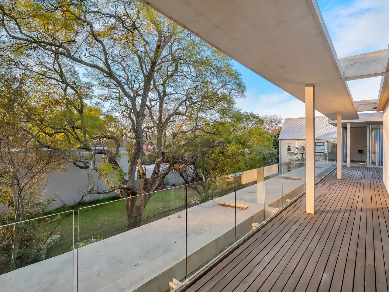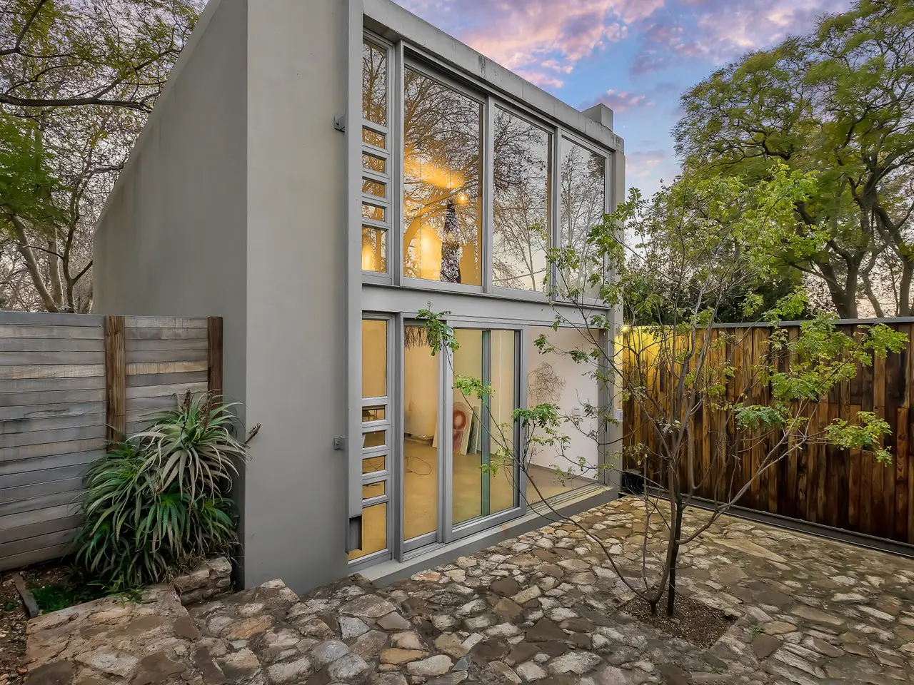 This architectural masterpiece out of the pages of a glossy magazine, combines cutting-edge glamour with a minimalist aesthetic. Brimming with sunshine and energy, it thinks way beyond the minimalist box. An inspired blend of floor to ceiling fenestration, bespoke cabinetry, and detailed finishes throughout are a happy mix. Courtyards, expansive tree-top views, ideal north facing aspects and seamless integration between the indoors and outdoors set the tone of this urban retreat measuring 513 square metres, with welcoming entrance and free-flowing spaces to include state of the art kitchen with stunning feature stone wall, integrated appliances and breakfast bar, dining, living, areas opening to the elevated pool and terraced treed garden – a total entertainer’s lifestyle. Generous stacking doors open this home to light, air, and structured garden views. There is a private guest wing comprising of spacious bedroom, bespoke bathroom, and private courtyard access. Currently this section is being utilised as a study. Guest cloakroom. The feature-clad staircase takes you to the accommodation on the upper level of the home, with tree-top views over the suburb. There are four bedrooms and three bathrooms finished to exacting standards (two en suite). Both the master suite and second bedroom suite are superbly integrated with the outdoors and the expansive treed garden below. The master suite offers a sun filled dressing room with clerestory windows and beautifully detailed full bathroom. A stand-alone, light filled, double volume, open plan studio/cottage of 126 square metres, with private entrance and double garage, enclosed courtyards, open plan kitchen, living and bedroom spaces and gorgeous bathroom offers multiple options – ideal for extended family living, additional income generating cottage, Airbnb, or home office environment. The double volume spaces allow for a mezzanine level to be created for additional living or accommodation. In addition, excellent staff suite with direct access to the main house, additional double automated garage, and storeroom/laundry. Features include piped gas connection for geysers and hobs, SMEG appliances and sinks, swivel wood burning fireplace in the living area and alarm system in the cottage. Do not miss out on this opportunity in the stylish suburb of Parkview, where access to local coffee shops, eateries, the retail strip on Tyrone Avenue, and both private and public schools, is just a stone’s throw away. Distinctive architecture plus a prestige neighbourhood. One look will do.