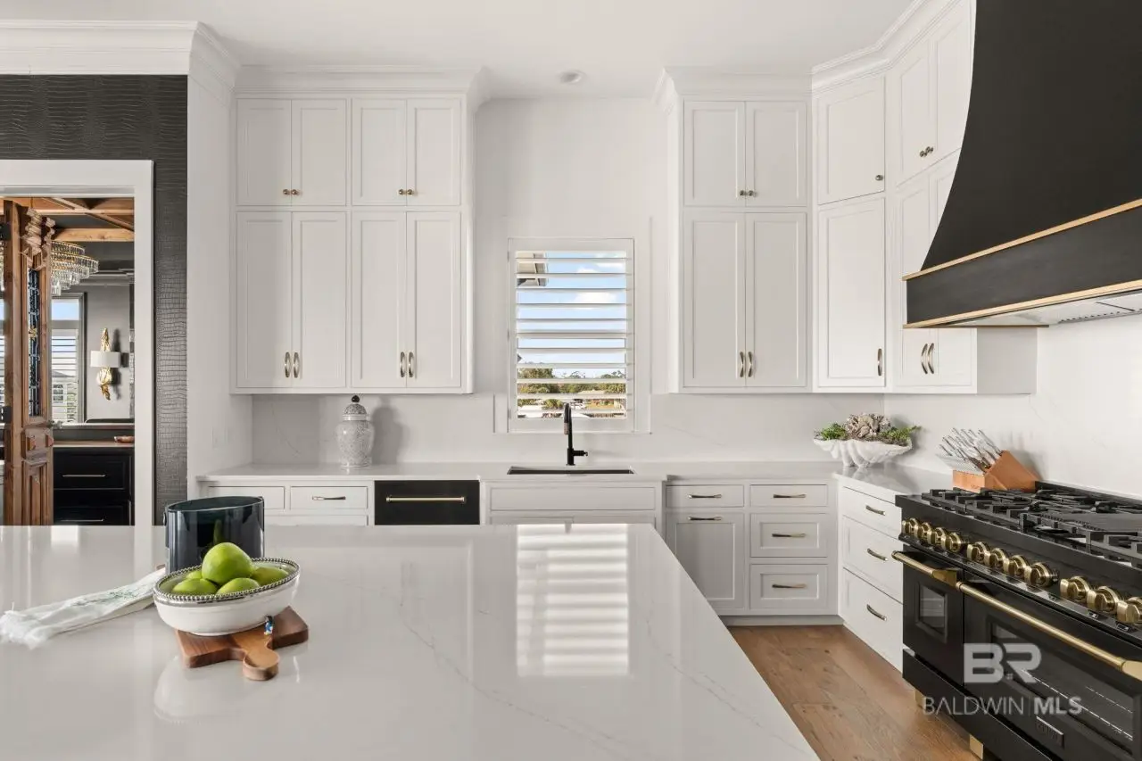 Experience luxury coastal living at its finest in this breathtaking 5-bedroom, 4-bath estate perfectly positioned on a ½-acre cul-de-sac lot with 217 feet of pristine waterfront on the Intracoastal Waterway and a private boat basin. Enjoy panoramic views of the Intracoastal and the Gulf, where gorgeous sunrises and stunning sunsets fill the sky each day?and watch the Blue Angels fly from the comfort of your own backyard.A boater's paradise, this property offers direct access to the Intracoastal Waterway and is in close proximity to the Pass, providing effortless access to the Gulf of America or fishing, cruising, and coastal adventures.Inside, the home showcases white oak hardwood floors throughout, beautiful moldings, luxury marble and tile bathrooms, and a gourmet kitchen adorned with quartz countertops and backsplash, black stainless designer appliances, a Wolf built-in coffee system, and a butler's pantry featuring custom cabinetry and walnut counters.The Bar & Game Room exudes a stylish speakeasy vibe, featuring a gas fireplace, walnut bar, beverage refrigerator, Scotsman ice maker, and beverage dispenser?a perfect gathering place for friends and family.Step outdoors to your private resort-style retreat with a gunite heated pool and spa, surrounded by marble decking, and an outdoor kitchen equipped with a Blaze gas grill, Large Green Egg, beverage fridge, prep sink, and a full outdoor bathroom for added convenience.Additional highlights include a whole-house gas generator, an elevator servicing all three floors, and en-suite bedrooms finished with quartz, marble, and designer tile.Celebrated for its exceptional design and craftsmanship, this home has been featured in multiple luxury coastal magazines?a true testament to its architectural distinction and timeless beauty.This extraordinary waterfront residence seamlessly blends modern sophistication, comfort, and the ultimate coastal lifestyle. This is an equitable interest listing where seller is selling only an