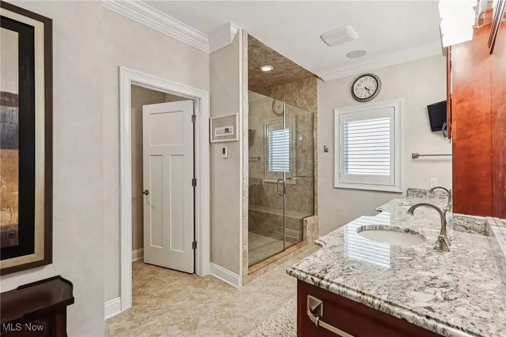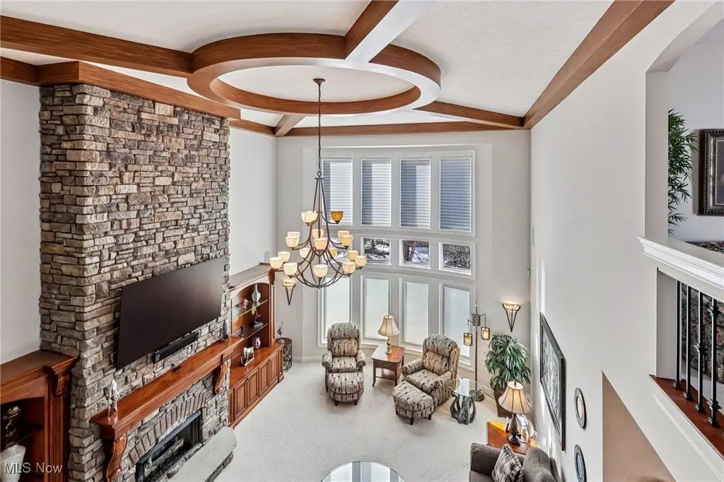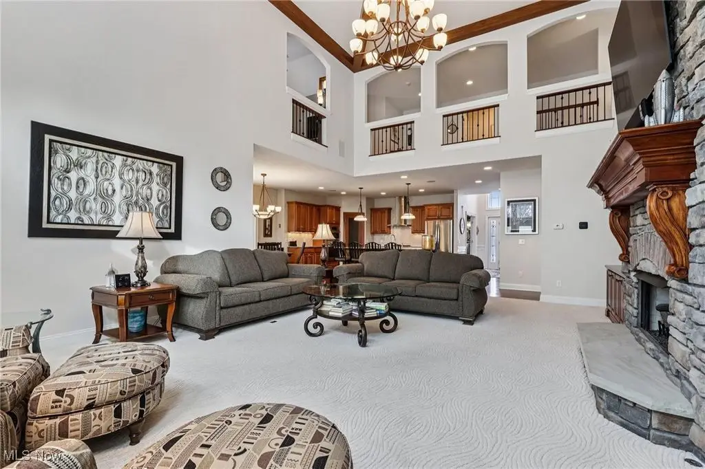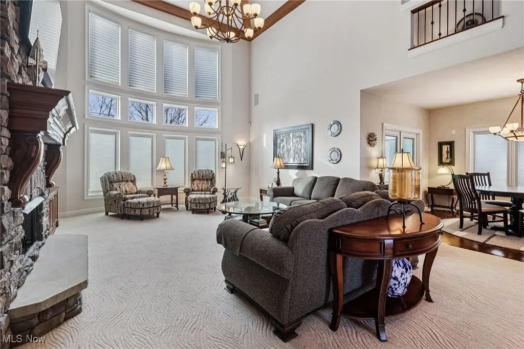This exceptional one-owner residence was custom designed and masterfully built by Perrino Custom Homes, offering a perfect blend of elegance, comfort, and functionality. The open floor plan is ideal for both entertaining and everyday living.The spectacular two-story great room features an impressive wall of windows, a dramatic fireplace, stunning beamed ceiling, and rich hardwood floors. The space flows seamlessly into the gourmet eat-in kitchen - a chef's dream with a large center island, granite countertops, and premium stainless-steel appliances. Just off the kitchen, enjoy a beautiful enclosed three-season room and an adjoining stone patio, perfect for outdoor dining and grilling.The luxurious first-floor owner's suite includes a spacious walk-in closet and a spa-like shower with a heated floor and designer finishes. A private den/library with a vaulted tray ceiling and custom built-ins offers the perfect work-from-home retreat.Upstairs, a generous loft overlooks the great room and provides additional living space, while two large bedrooms boast large closets and additional walk-in closet and share a beautifully appointed full bath.The lower level offers ample storage and the potential for future recreation or fitness space. Additional highlights include a first-floor laundry/mudroom, hardwood flooring throughout most of the main level, and professionally selected decor throughout.Set on a private, beautifully landscaped lot ideal for gardening and summer entertaining, this home exemplifies quality and craftsmanship. Sterling Lakes is a sought-after gated community featuring lush green spaces, sidewalks, and a serene setting.