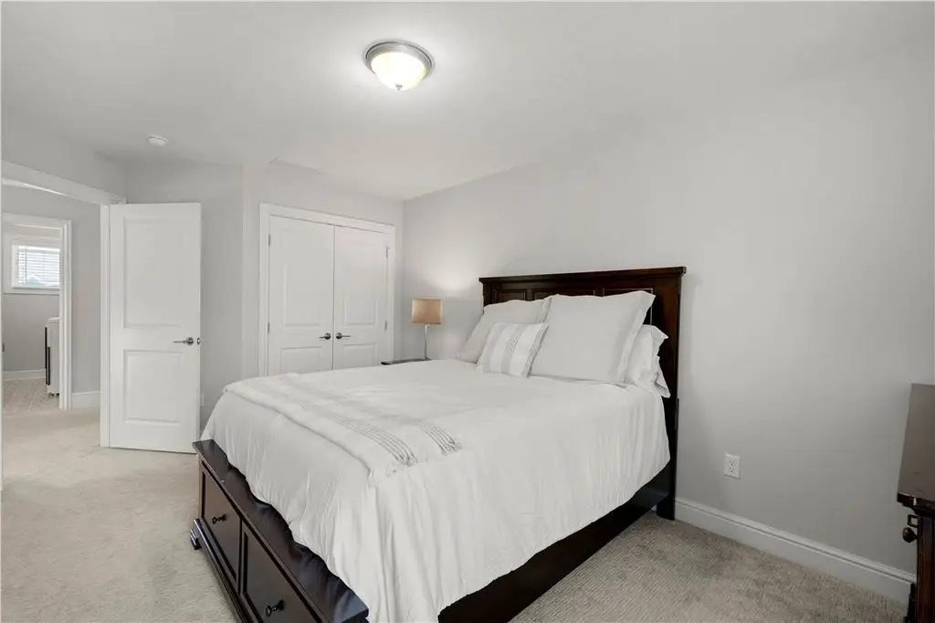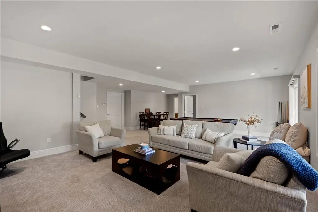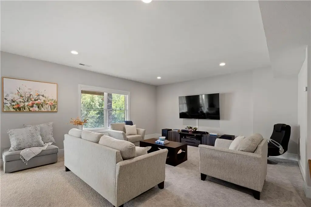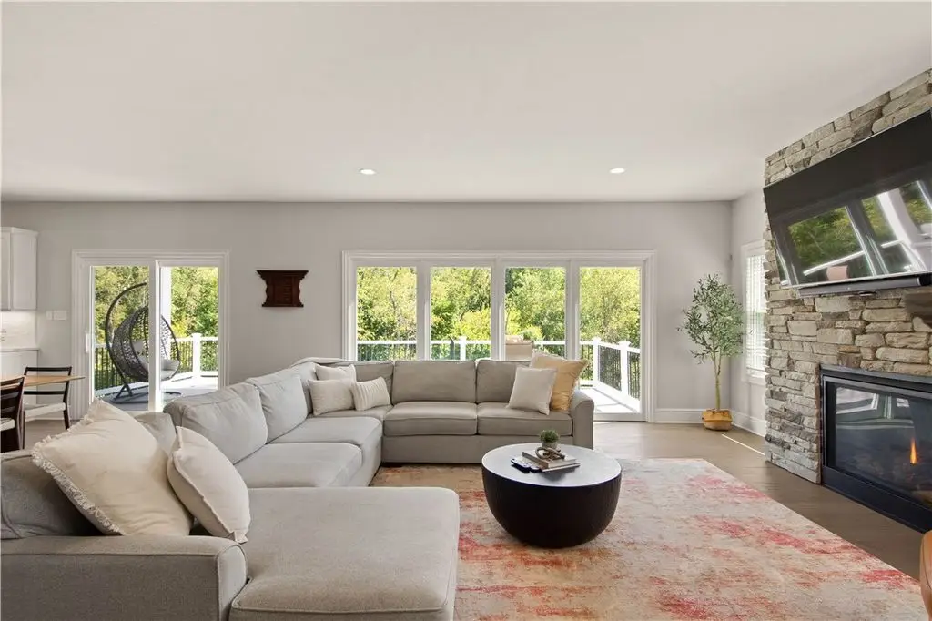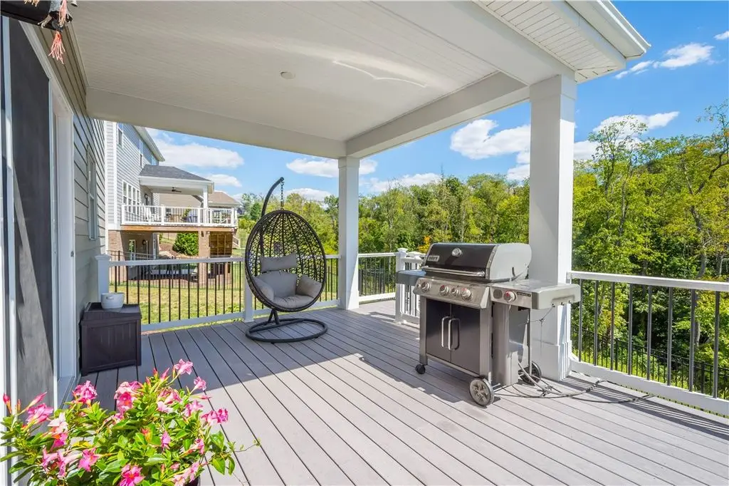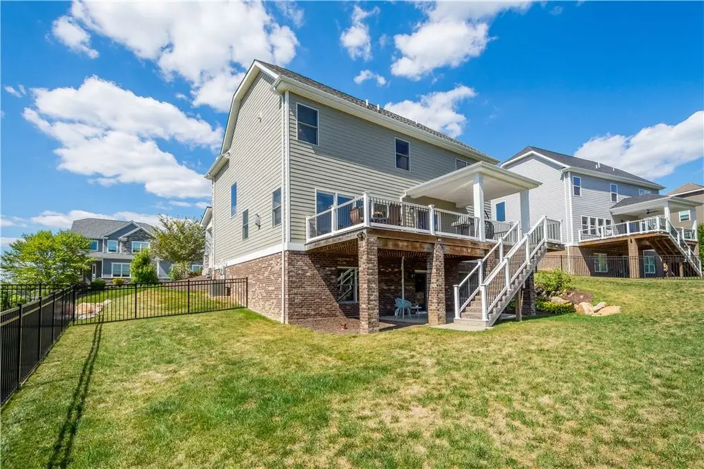 Five bedroom, 3.5 bath home blends timeless design & modern luxury. The main level offers an open concept with spacious great room featuring a floor-to-ceiling stone fireplace & walls of windows. A gourmet kitchen boasts a massive quartz island, luxury appliances custom cabinetry, and walk-in pantry, flowing seamlessly to the dining room & 30-foot partially covered Trex deck. A dedicated home office, mudroom with custom built-ins & powder room complete this level. Upstairs the primary spa-like en-suite w/ custom tiled oversized Roman shower & gigantic walk-in closet. 3 additional bedrooms share a full bath, along with a laundry room. The finished walk-out lower level features a large entertaining area, 5th bedroom, full bath & storage room. Relax & enjoy sunrise views from the deck or patio overlooking the large, mostly level fenced yard w/ a private wooded backdrop. HOA covers weekly lawn care, mulching, seasonal clean-up, and snow removal, allowing you to enjoy free time with loved ones.