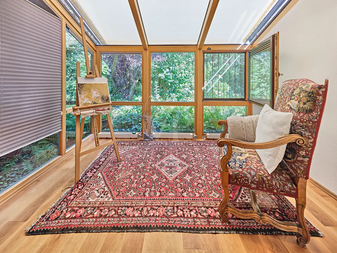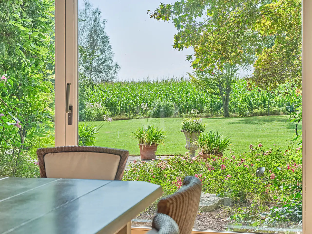 This spacious bungalow-style villa with room heights of up to 5 meters is located on a spacious 3,159 m² plot and offers a living space of around 330 m². The rooms are furnished to a high standard throughout and offer superior living comfort. Upon entering the house, you are greeted by a bright and spacious entrance area with a checkroom and access to the double garage. Numerous windows, some of which are floor-to-ceiling, provide plenty of natural light and an inviting atmosphere. The spacious living/dining room has a water-bearing tiled stove and large panoramic windows that lead onto the terrace and into the garden on the south side. The dining area forms a successful transition from the open-plan living area to the kitchen, which can be closed off. The fireplace room with indoor and outdoor fireplace is also ideal as a visitor or guest room. The kitchen, with high-quality slate flooring, has exclusive furnishings and brand-name electrical appliances. The master bedroom has a separate dressing room. The adjoining hallway is designed as a closet room and leads to two further bedrooms or children's rooms, each of which has its own conservatory. The daylight bathroom impresses with its comfortable fittings. A separate WC is available for guests. A particularly practical feature is that all rooms on the ground floor have their own terrace or garden access. The almost all-round natural stone terrace is partially covered and offers a variety of uses in almost any weather. The floors on the first floor are laid with very high-quality solid floorboards and parquet flooring. The doors are made of solid wood in an elegant arched style. The predominantly newly glazed wooden windows are fitted with custom-made fly screens. The basement offers additional comfort with a large spa area, including a swimming pool with counter-current system, a shower room, a sauna for 6-8 people, lounging areas and daylight windows. Four further basement rooms offer space for fitness/yoga, laundry, hobbies and a workshop. The fitness/yoga room has its own shower and WC. The heating is provided by district heating (wood chips). A photovoltaic system with an output of 10 kW and a Tesla buffer battery of the same size as well as a solar thermal system with a 750-liter buffer storage tank ensure an environmentally friendly energy supply. The outdoor area includes a tiled outdoor pool with a roll-down cover, a pavilion with thermal insulation glazing and a copper roof as well as two garden sheds. There is also a double garage with electric doors and 2-3 outdoor parking spaces. An alarm system for the house and garden provides additional security. This villa offers a wide range of possible uses and a high level of living comfort. As it was built in a mixed area as a former business villa, commercial use can also be considered here. If required, a commercial space of up to approx. 700 m² can be leased in the neighboring commercial hall. The location is very quiet despite the proximity to the commercial enterprises. The south-facing garden in particular offers unparalleled privacy and an unobstructed view of meadows and fields. As the businesses close at 6 p.m. at the latest and there is generally no work at all at weekends, the villa on offer is virtually a quiet, secluded location during these periods. You will receive further information with our detailed exposé.