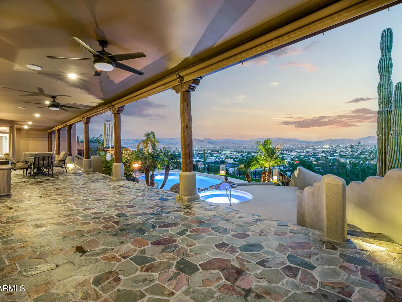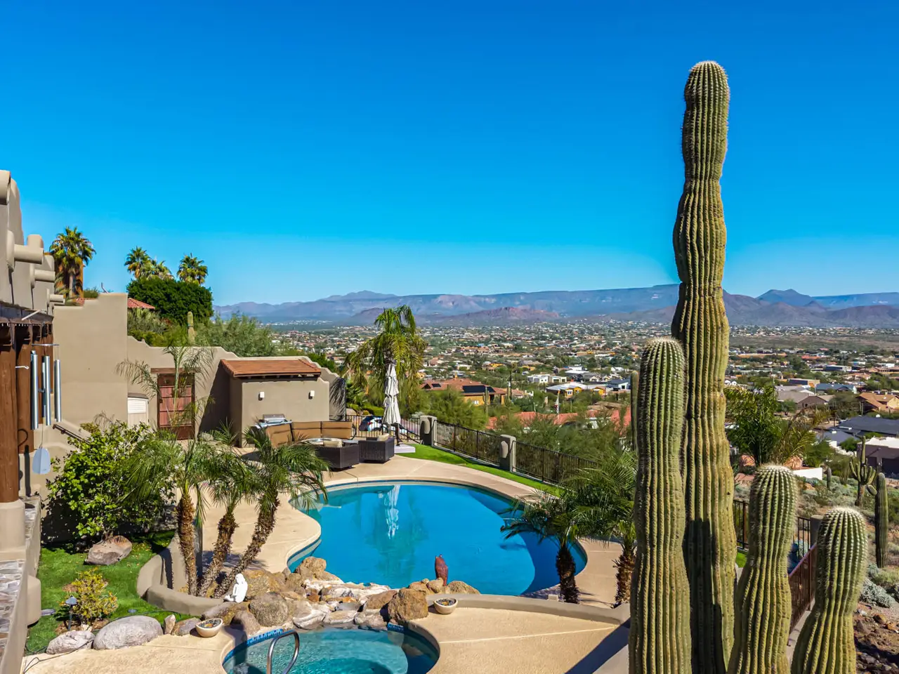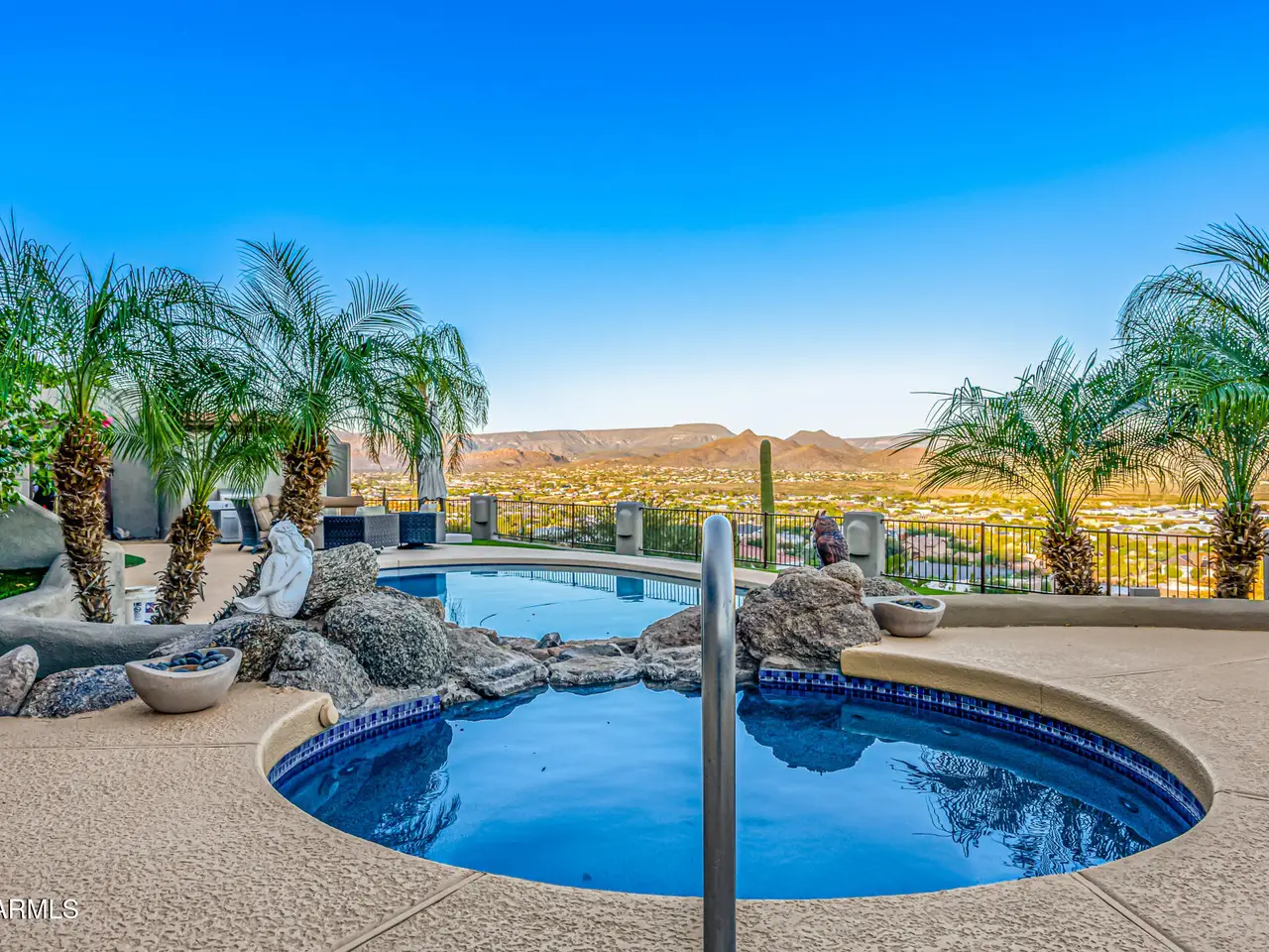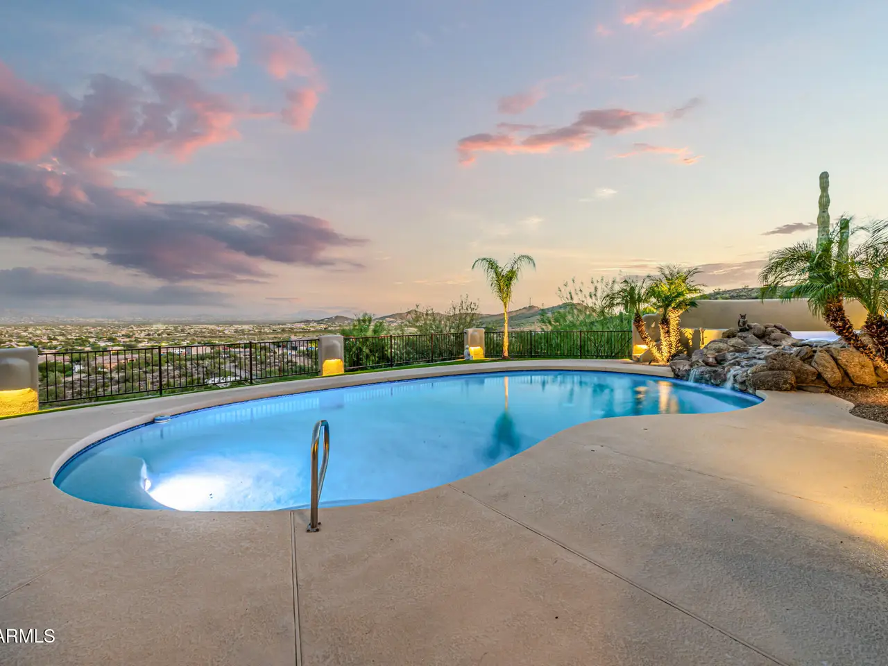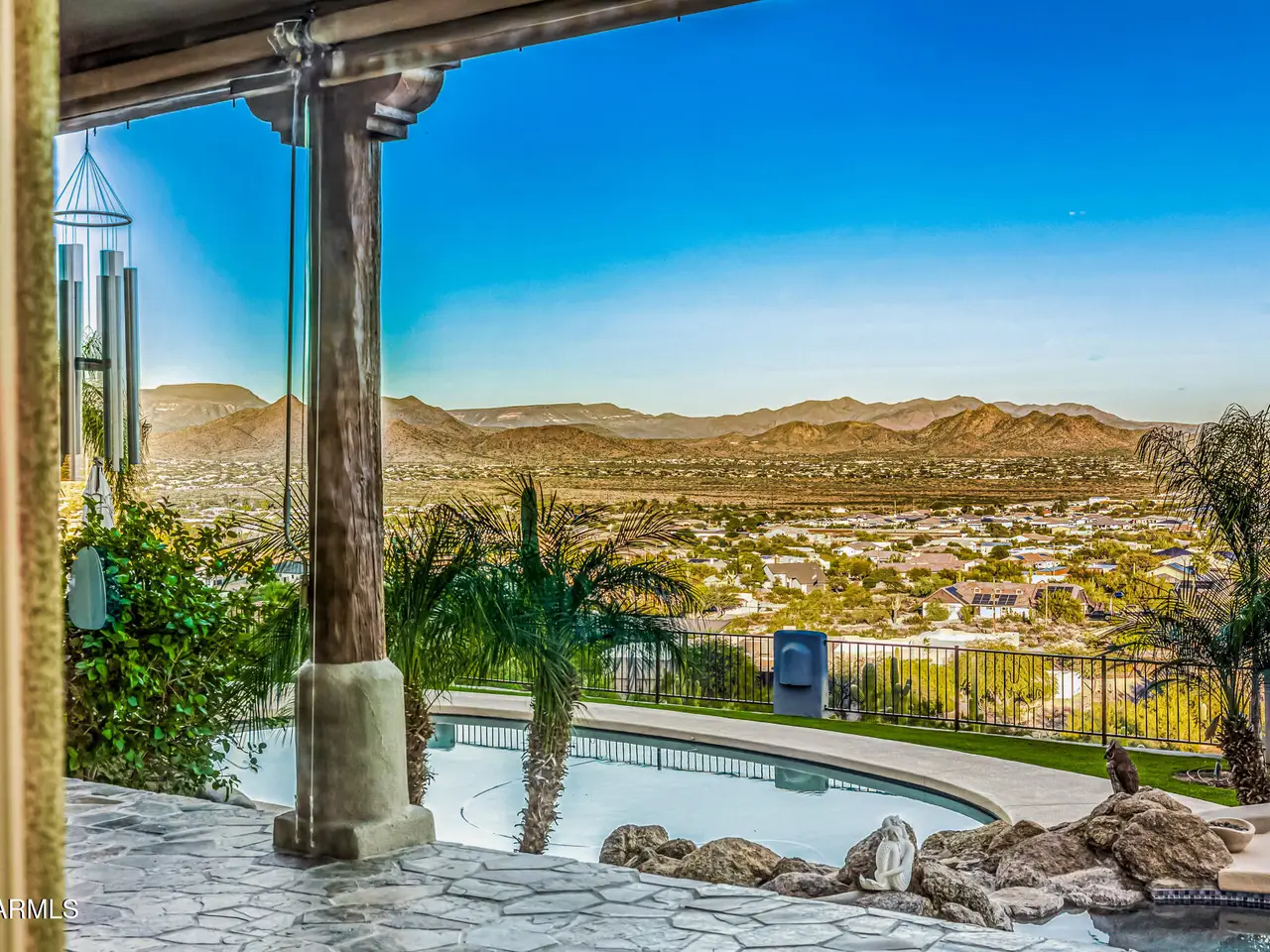Live where the views feel endless. This custom property sits on 1.5 acres with million-dollar city lights & mountain panoramas from sunrise to sunset. Inside, the great room opens beneath dramatic cathedral beamed ceilings & a warm fireplace ideal for gatherings. The kitchen blends seamlessly with the living spaces & features rich cabinetry, granite counters & tile flooring throughout. Each bedroom includes a walk-in closet & the luxurious primary suite features a sitting/office area, patio access, spa-style bath & dual walk-ins. Enjoy a resort-style backyard with heated pool + spa, extended covered patio and view fencing. No HOA. Oversized 3-car garage with cabinets + epoxy floors, water softener, & plenty of storage. Freshly painted, impeccably cared for and move-in ready!