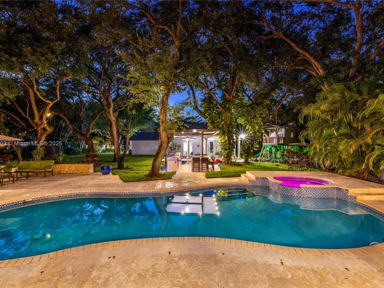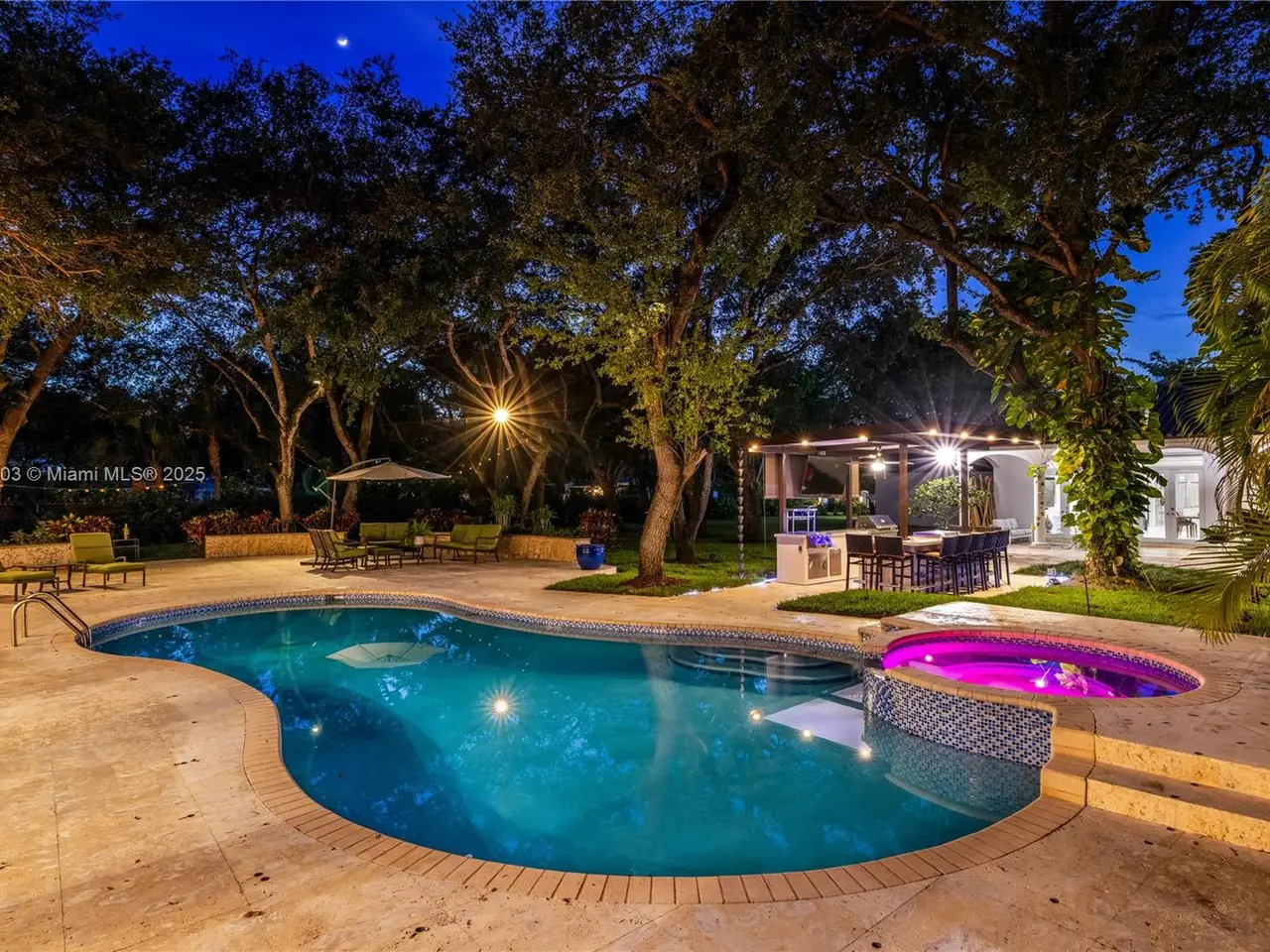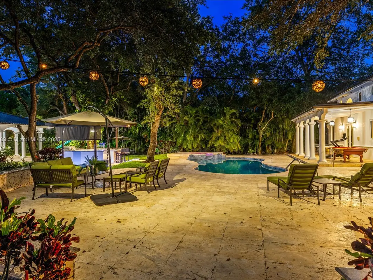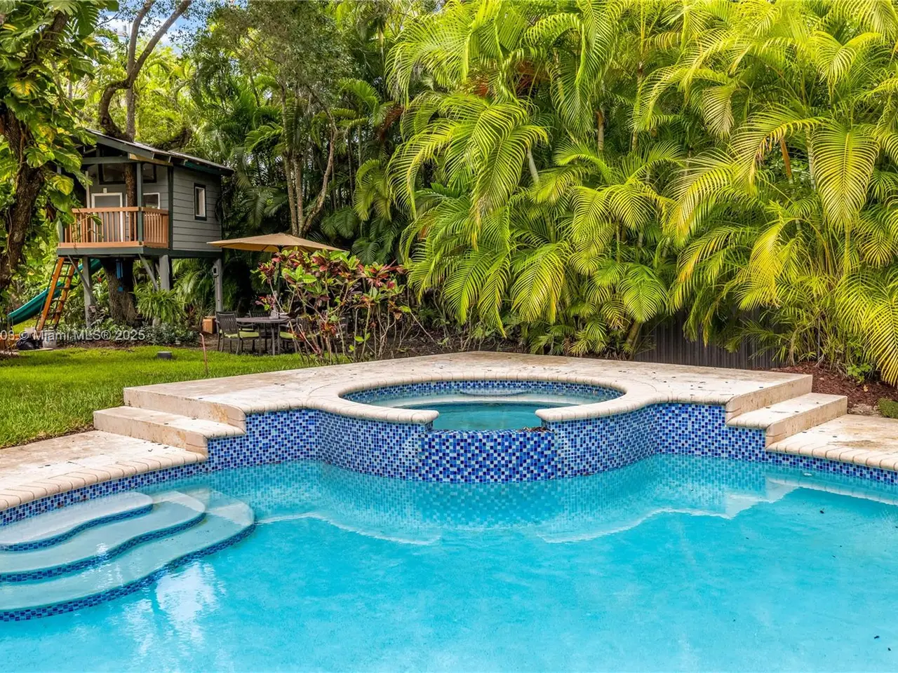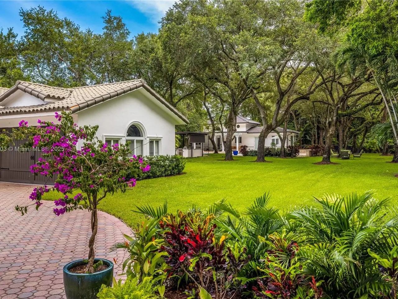 Stunning gated 1-story 8,126 total SF residence on a quiet cul-de-sac in prime North Pinecrest, steps from Gulliver & Beth Am. Set on a lush 1.1 acre with a 2-story, 1,300 SF guesthouse, treehouse, & ample parking. The 6-bed, 5.5-bath main home offers an office, new impact windows/doors, & Firenze Carrara polished marble tile throughout. Gourmet kitchen boasts a leather-textured marble island, Veneta Cucine cabinetry, & Miele appliances. Guest bath features full-height, single-slab Italian tile. Primary suite includes dual walk-in closets & a spa-style bath with Kohler DTV+ faucet less system for steam, audio, chromotherapy, & lighting. Whole-house Brilliant system manages lighting, Zoom intercom, & Sonos audio indoors/out. Outdoor oasis includes a new summer kitchen & resort-style pool.