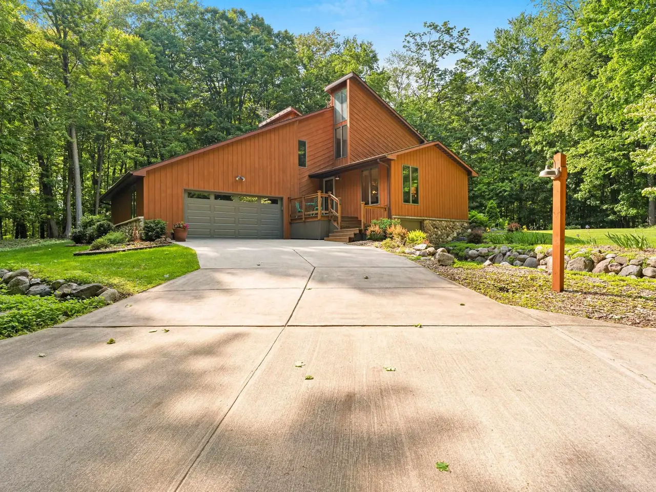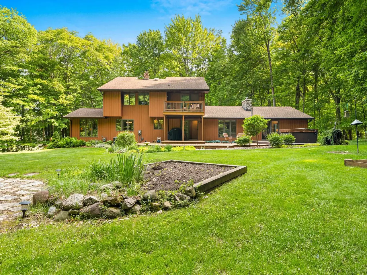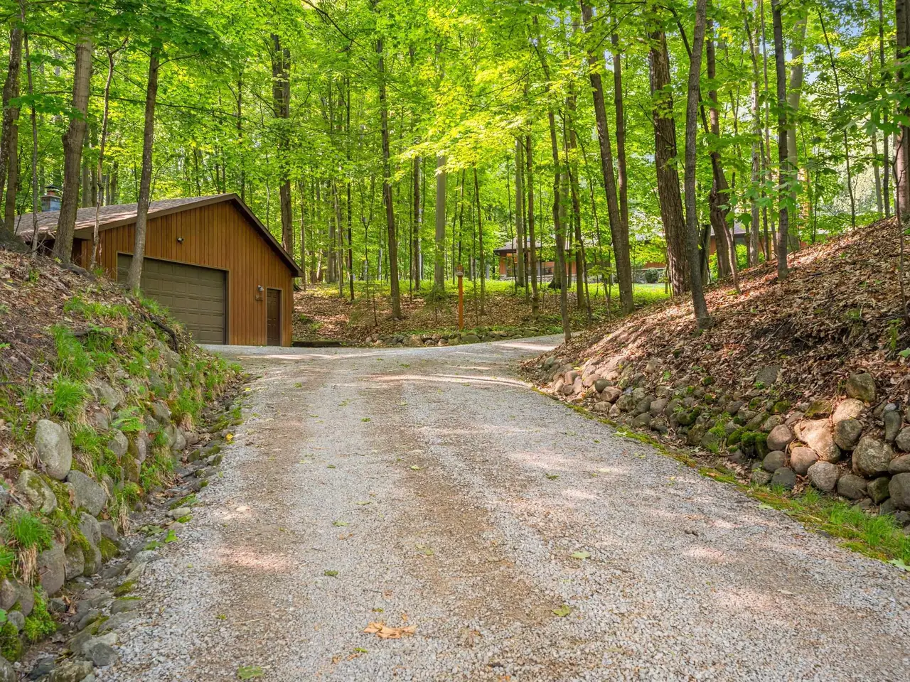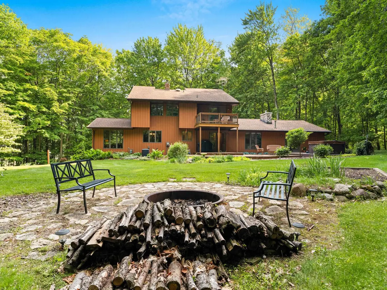 Secluded Wooded Retreat! Beautiful & meticulously cared for spacious home. Modern & upgraded amenities; architectural character and charm. Sought after private wooded location! 2 Outbuildings; lower is 30 X 50. Sits on almost 5 acres with water access and serene water views. Relax in the hot tub or by the fire pit and enjoy the magnitude of wildlife. Home offers fully renovated kitchen/dining with granite counter tops and ss appliances. 2 living rooms; wb fireplace. Sunroom with in-floor heat and panoramic sunset views. Mother-in-law suite on main level with heated floors. Optional 3 bedrooms upstairs including Master which features vaulted ceilings, walk in tile shower and walk-in closet. Walkout basement with ample storage. Close to New Zoo, Reforestation Camp and more. A must-see!