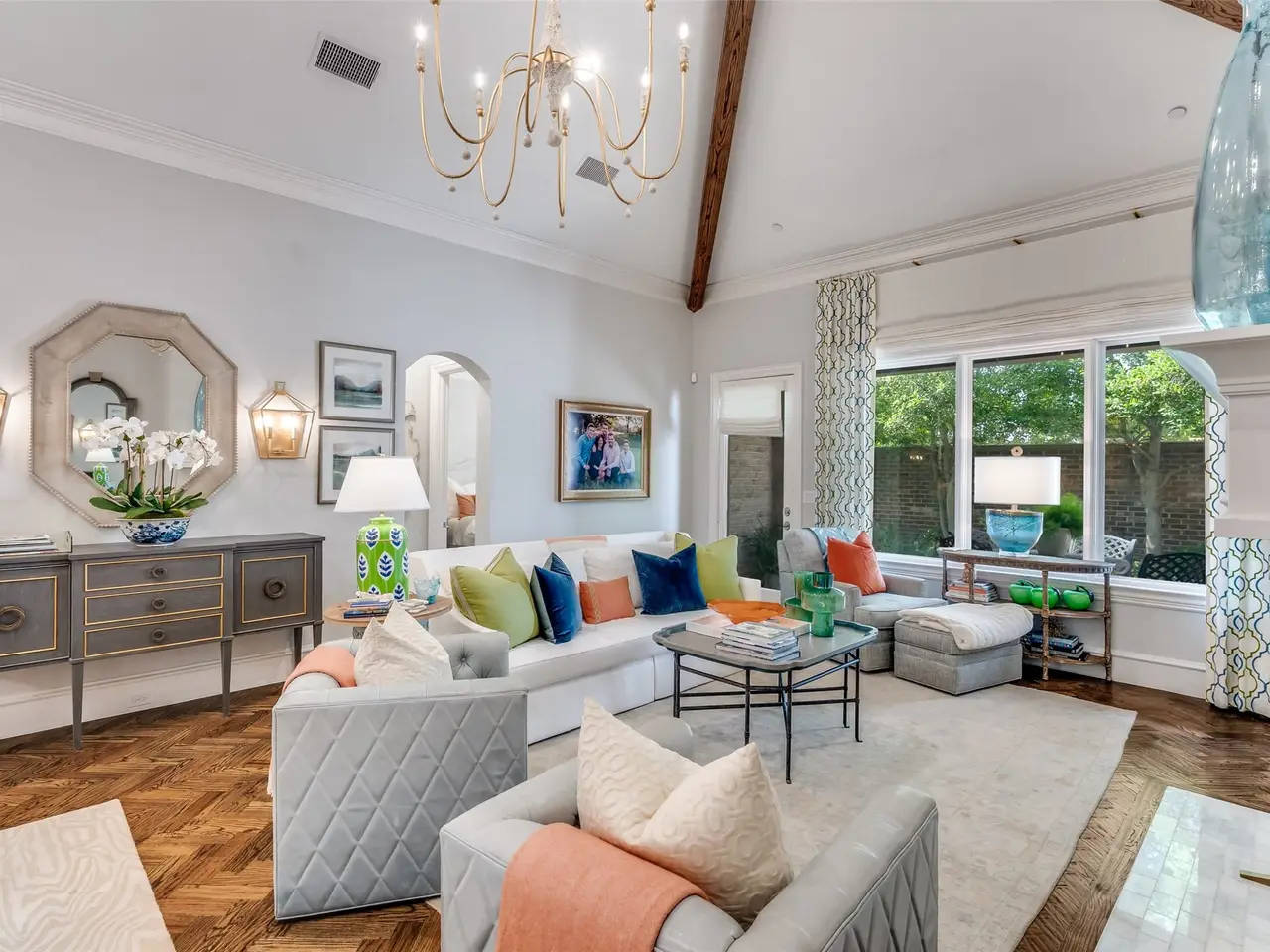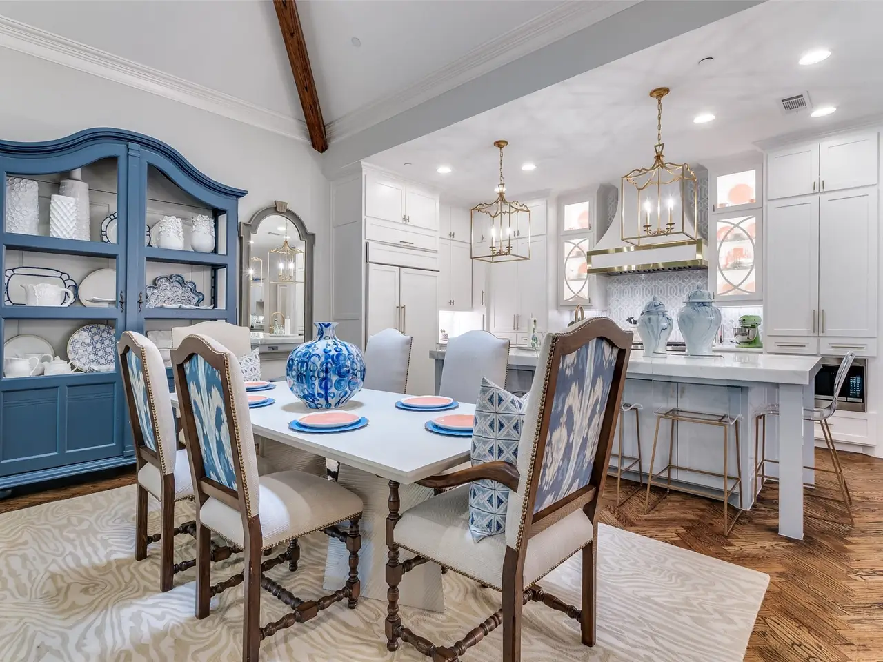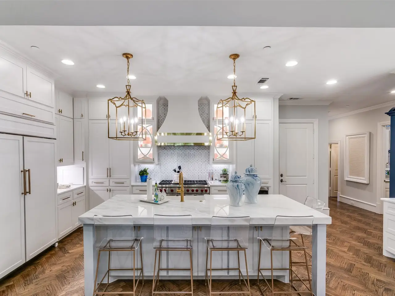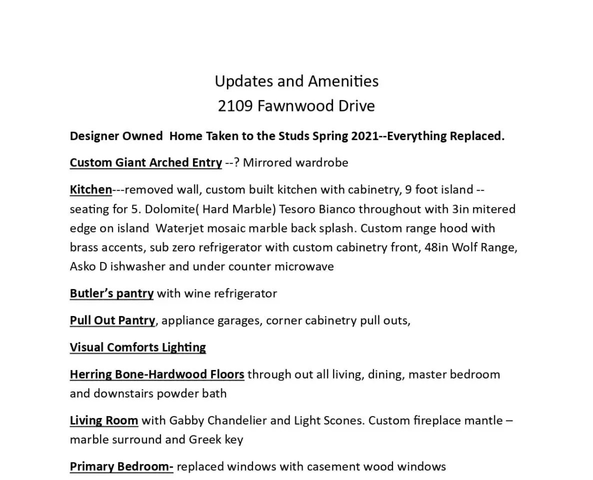 This custom, designer-owned home is nestled in the coveted Willow Bend community. Every room has been thoughtfully renovated (see full list in supplements). Step inside to find real hardwood herringbone flooring throughout the foyer, kitchen, dining room, family room, and primary suite. The staircase, upstairs landing, and hallway are also finished in hardwood. The foyer is highlighted by a custom arched coat closet armoire, setting the sophisticated design tone throughout. The powder bath features marble counters, Thibaut wallpaper, Julie Neill lighting, and a designer antiqued mirror—just steps from the laundry room accented with whimsical Lee Jofa wallpaper. The open kitchen boasts a massive nine-foot island with breakfast bar seating for five, Dolomite counters, Wolf 48-inch gas range, Sub-Zero refrigerator, Asko dishwasher, under-counter KitchenAid microwave, marble waterjet backsplash, two appliance garages, pull-out drawers, brushed gold hardware, custom hood with brass accents, LED lighting in seeded glass cabinets, and Visual Comfort lanterns. A wet bar with wine fridge and butler’s pantry makes entertaining effortless. The family room, open to the kitchen, features beamed ceilings, a large Gabby chandelier with sconces, a grand fireplace, and a wall of windows overlooking the backyard with stone-edged flower beds and a turf lawn for low-maintenance living. The primary suite offers a dreamy marble bath with oversized vanities, standalone soaking tub, Schumacher wallpaper, brushed gold plumbing, and custom designer finishes. Upstairs includes two bedrooms, each with ensuite baths, quartz vanities, and walk-in closets. A large media room with kitchenette and walk-in floored attic access is located off the landing, next to a built-in desk area and half bath. The two-car garage features epoxy floors, overhead storage, and wall-mounted organization. This lavish designer property is fully remodeled and move-in ready. Schedule a showing today!