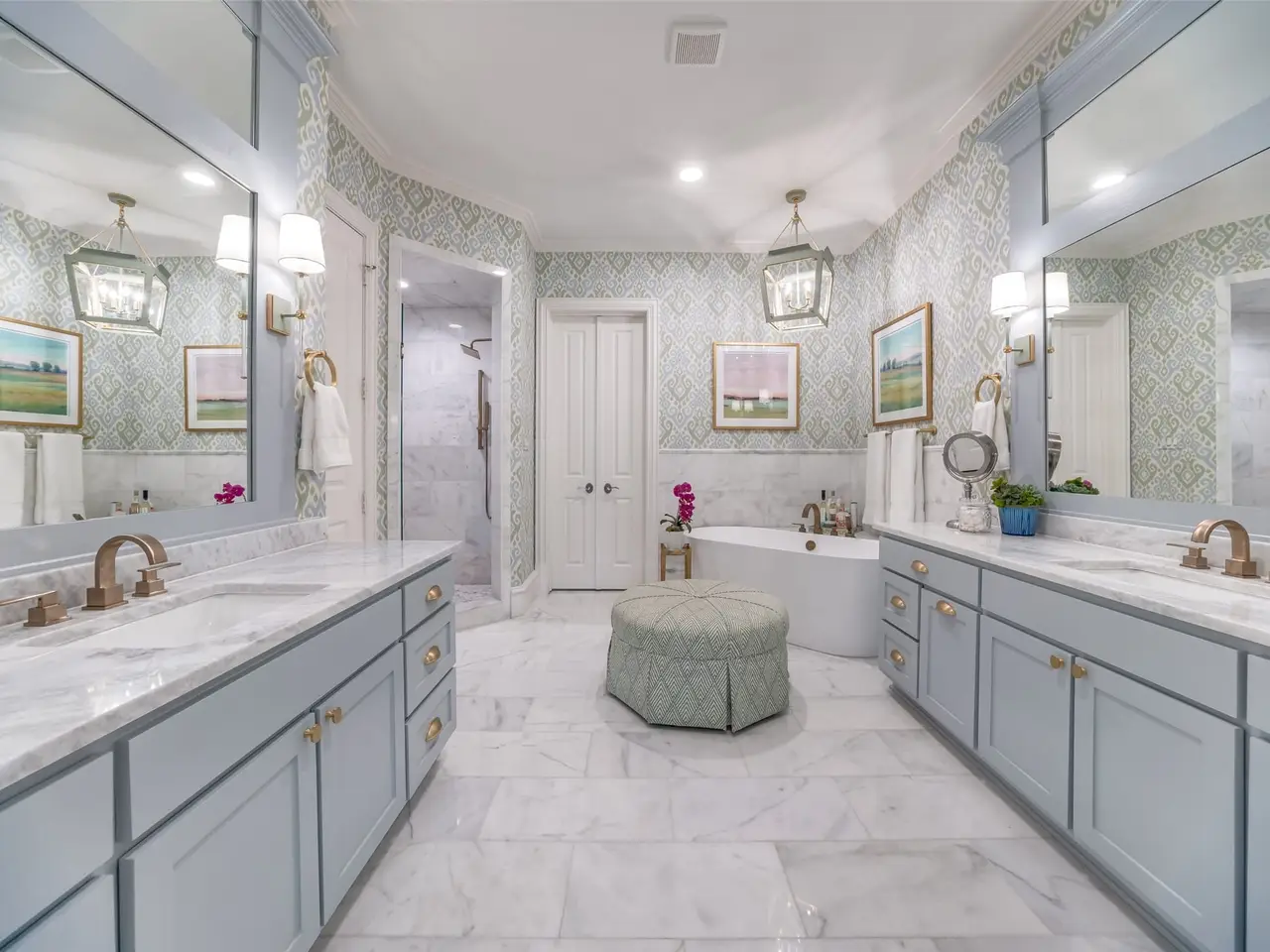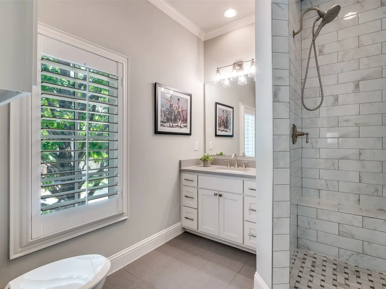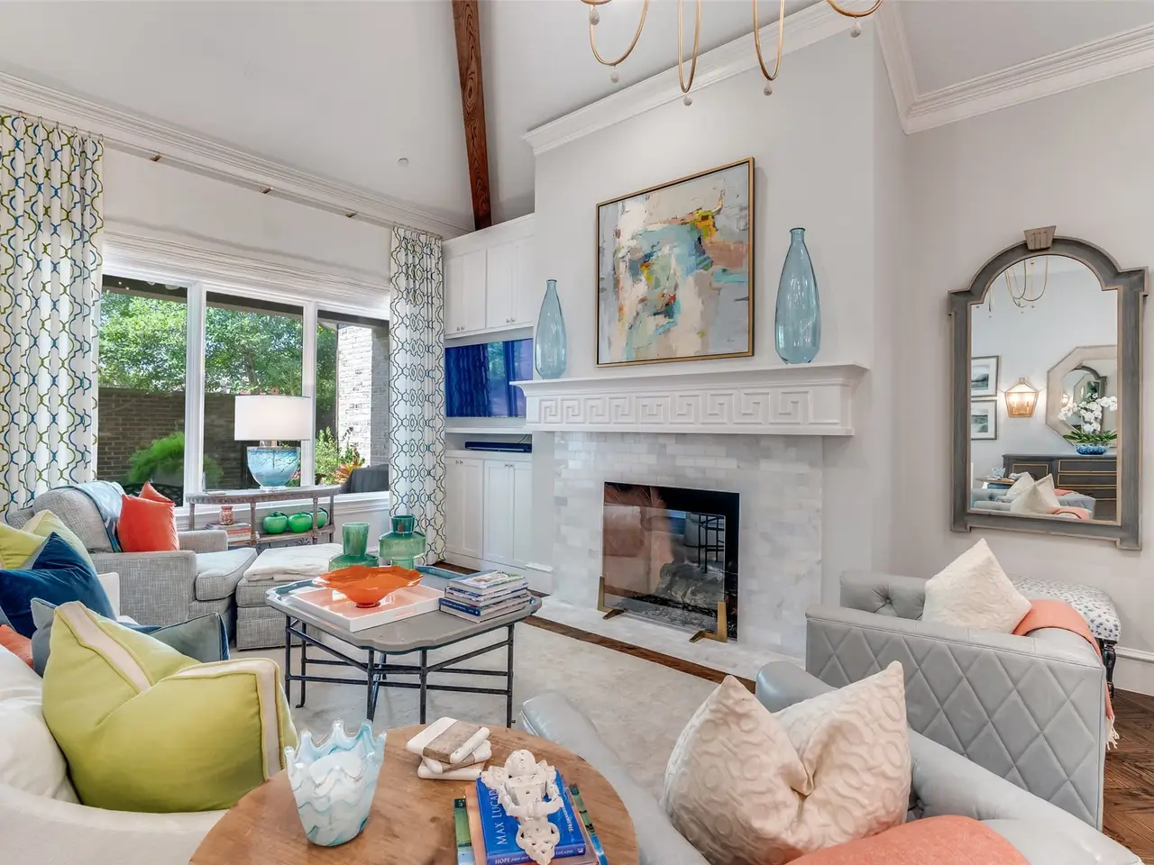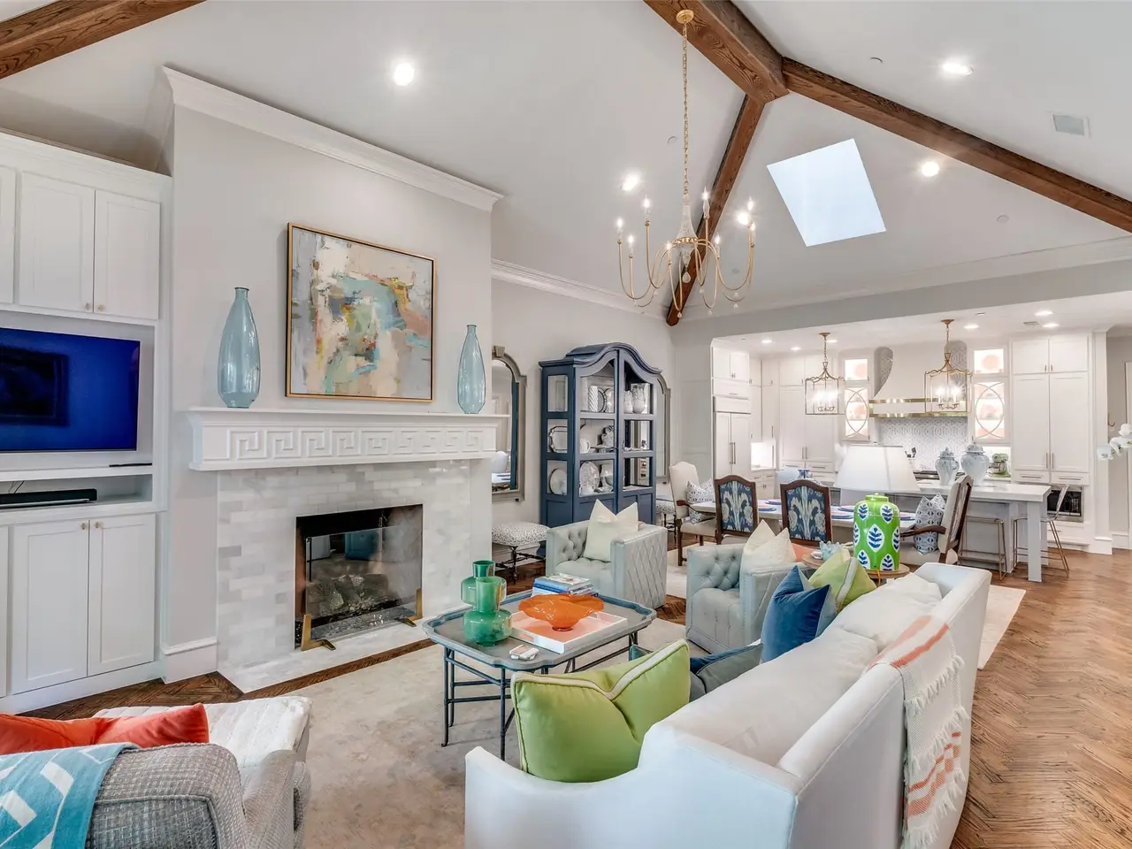 This custom, designer-owned home is nestled in the coveted Willow Bend community. Every room has been thoughtfully renovated (see full list in supplements). Step inside to find real hardwood herringbone flooring throughout the foyer, kitchen, dining room, family room, and primary suite. The staircase, upstairs landing, and hallway are also finished in hardwood. The foyer is highlighted by a custom arched coat closet armoire, setting the sophisticated design tone throughout. The powder bath features marble counters, Thibaut wallpaper, Julie Neill lighting, and a designer antiqued mirror—just steps from the laundry room accented with whimsical Lee Jofa wallpaper. The open kitchen boasts a massive nine-foot island with breakfast bar seating for five, Dolomite counters, Wolf 48-inch gas range, Sub-Zero refrigerator, Asko dishwasher, under-counter KitchenAid microwave, marble waterjet backsplash, two appliance garages, pull-out drawers, brushed gold hardware, custom hood with brass accents, LED lighting in seeded glass cabinets, and Visual Comfort lanterns. A wet bar with wine fridge and butler’s pantry makes entertaining effortless. The family room, open to the kitchen, features beamed ceilings, a large Gabby chandelier with sconces, a grand fireplace, and a wall of windows overlooking the backyard with stone-edged flower beds and a turf lawn for low-maintenance living. The primary suite offers a dreamy marble bath with oversized vanities, standalone soaking tub, Schumacher wallpaper, brushed gold plumbing, and custom designer finishes. Upstairs includes two bedrooms, each with ensuite baths, quartz vanities, and walk-in closets. A large media room with kitchenette and walk-in floored attic access is located off the landing, next to a built-in desk area and half bath. The two-car garage features epoxy floors, overhead storage, and wall-mounted organization. This lavish designer property is fully remodeled and move-in ready. Schedule a showing today!
