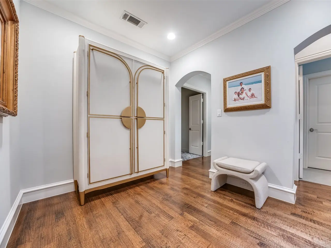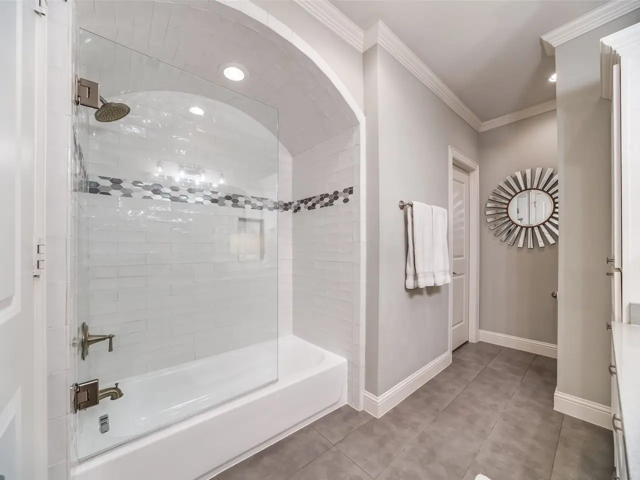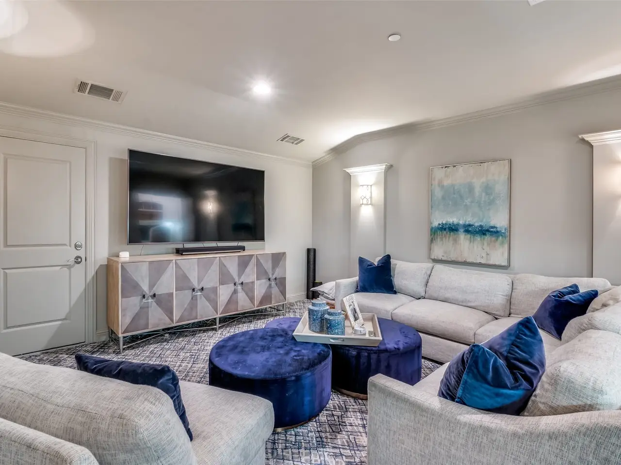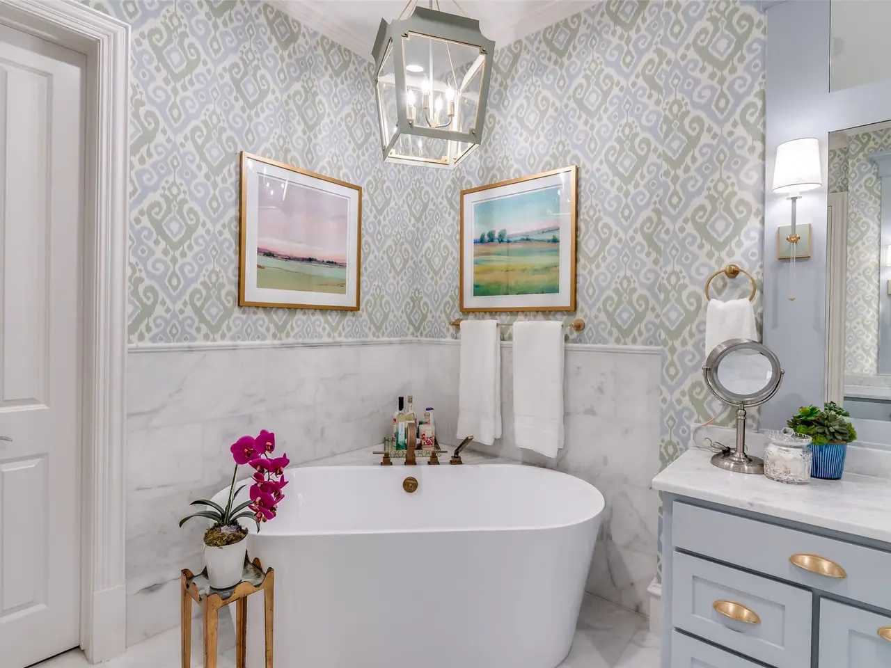 This custom, designer-owned home is nestled in the coveted Willow Bend community. Every room has been thoughtfully renovated (see full list in supplements). Step inside to find real hardwood herringbone flooring throughout the foyer, kitchen, dining room, family room, and primary suite. The staircase, upstairs landing, and hallway are also finished in hardwood. The foyer is highlighted by a custom arched coat closet armoire, setting the sophisticated design tone throughout. The powder bath features marble counters, Thibaut wallpaper, Julie Neill lighting, and a designer antiqued mirror—just steps from the laundry room accented with whimsical Lee Jofa wallpaper. The open kitchen boasts a massive nine-foot island with breakfast bar seating for five, Dolomite counters, Wolf 48-inch gas range, Sub-Zero refrigerator, Asko dishwasher, under-counter KitchenAid microwave, marble waterjet backsplash, two appliance garages, pull-out drawers, brushed gold hardware, custom hood with brass accents, LED lighting in seeded glass cabinets, and Visual Comfort lanterns. A wet bar with wine fridge and butler’s pantry makes entertaining effortless. The family room, open to the kitchen, features beamed ceilings, a large Gabby chandelier with sconces, a grand fireplace, and a wall of windows overlooking the backyard with stone-edged flower beds and a turf lawn for low-maintenance living. The primary suite offers a dreamy marble bath with oversized vanities, standalone soaking tub, Schumacher wallpaper, brushed gold plumbing, and custom designer finishes. Upstairs includes two bedrooms, each with ensuite baths, quartz vanities, and walk-in closets. A large media room with kitchenette and walk-in floored attic access is located off the landing, next to a built-in desk area and half bath. The two-car garage features epoxy floors, overhead storage, and wall-mounted organization. This lavish designer property is fully remodeled and move-in ready. Schedule a showing today!