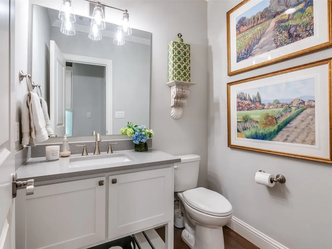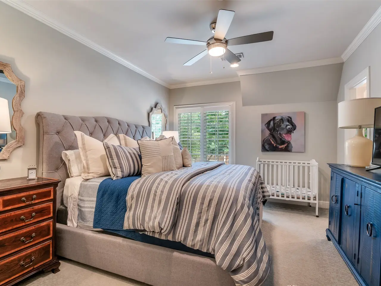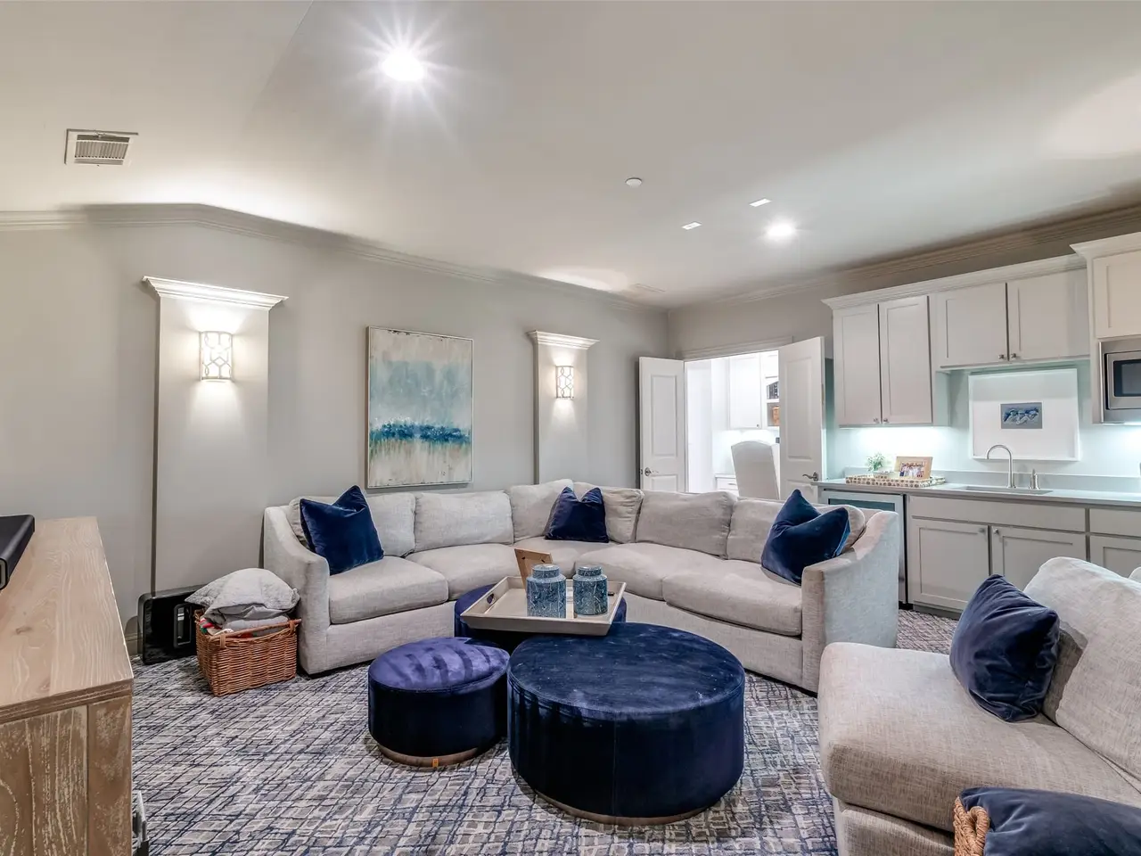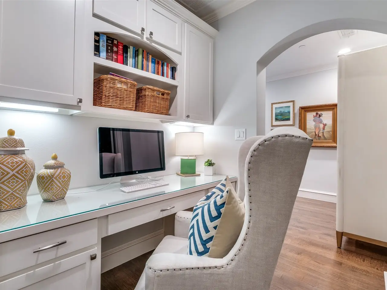 This custom, designer-owned home is nestled in the coveted Willow Bend community. Every room has been thoughtfully renovated (see full list in supplements). Step inside to find real hardwood herringbone flooring throughout the foyer, kitchen, dining room, family room, and primary suite. The staircase, upstairs landing, and hallway are also finished in hardwood. The foyer is highlighted by a custom arched coat closet armoire, setting the sophisticated design tone throughout. The powder bath features marble counters, Thibaut wallpaper, Julie Neill lighting, and a designer antiqued mirror—just steps from the laundry room accented with whimsical Lee Jofa wallpaper. The open kitchen boasts a massive nine-foot island with breakfast bar seating for five, Dolomite counters, Wolf 48-inch gas range, Sub-Zero refrigerator, Asko dishwasher, under-counter KitchenAid microwave, marble waterjet backsplash, two appliance garages, pull-out drawers, brushed gold hardware, custom hood with brass accents, LED lighting in seeded glass cabinets, and Visual Comfort lanterns. A wet bar with wine fridge and butler’s pantry makes entertaining effortless. The family room, open to the kitchen, features beamed ceilings, a large Gabby chandelier with sconces, a grand fireplace, and a wall of windows overlooking the backyard with stone-edged flower beds and a turf lawn for low-maintenance living. The primary suite offers a dreamy marble bath with oversized vanities, standalone soaking tub, Schumacher wallpaper, brushed gold plumbing, and custom designer finishes. Upstairs includes two bedrooms, each with ensuite baths, quartz vanities, and walk-in closets. A large media room with kitchenette and walk-in floored attic access is located off the landing, next to a built-in desk area and half bath. The two-car garage features epoxy floors, overhead storage, and wall-mounted organization. This lavish designer property is fully remodeled and move-in ready. Schedule a showing today!