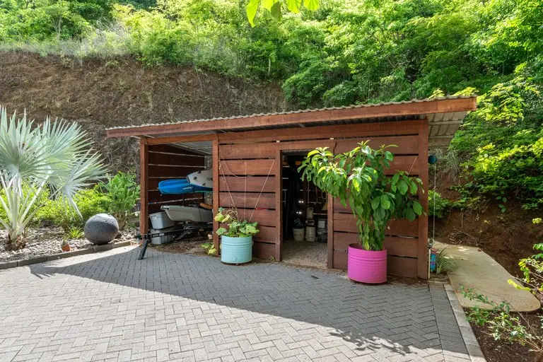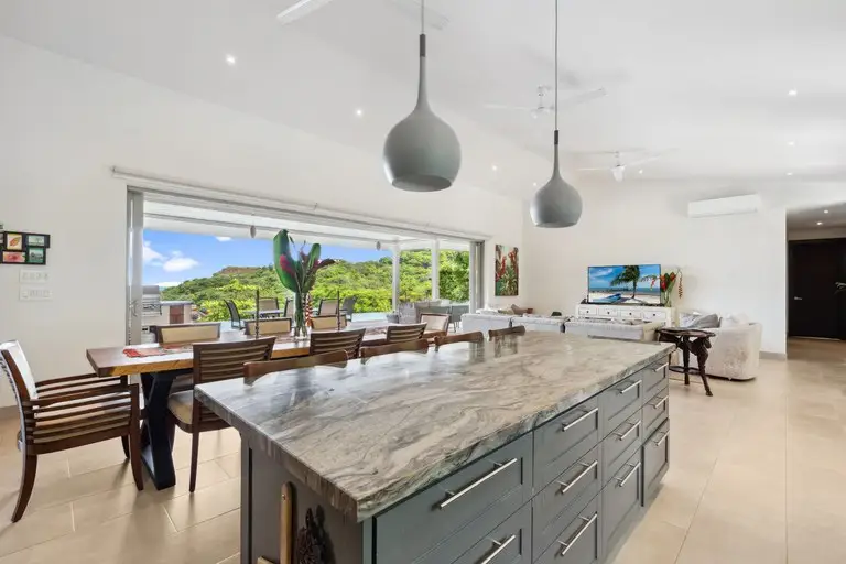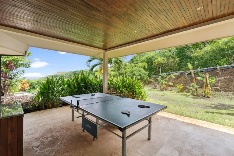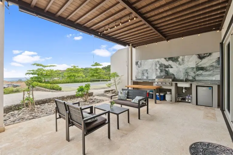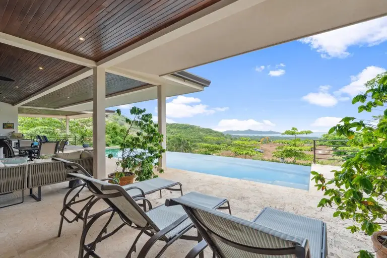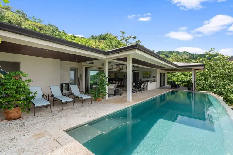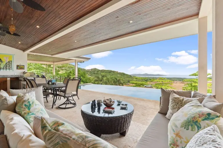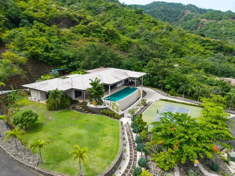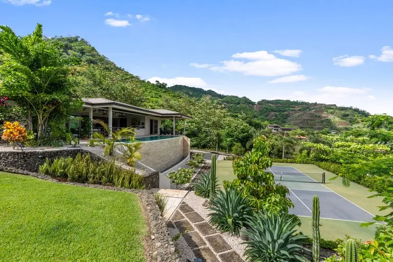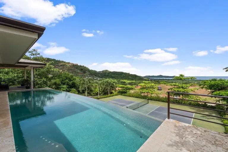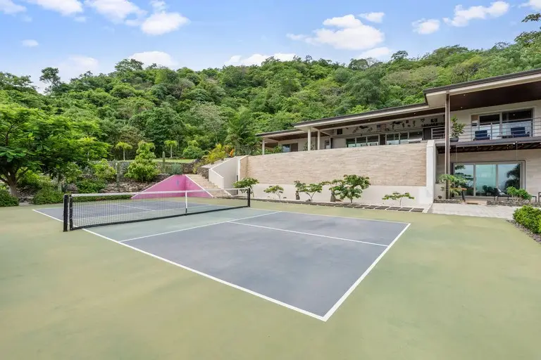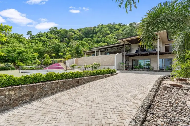 Welcome to Pickle on the Hill, a private estate located in the prestigious gated community of Mar Vista, just minutes from Playa Flamingo. With panoramic ocean views, lush tropical landscaping, and standout amenities, including a private pickleball court, this property offers a rare blend of luxury, privacy, and outdoor living on Costa Rica’s Gold Coast. Main Residence: Step through the beautifully landscaped entrance into a spacious 3-bedroom, 3.5-bath home designed for comfort, elegance, and entertaining. A two-and-a-half-car garage and a thoughtfully paved driveway add both convenience and curb appeal, while vaulted hardwood ceilings and refined finishes inside create a warm and welcoming atmosphere. At the heart of the home, the gourmet kitchen stands out with stainless steel appliances, stone countertops, and an oversized island perfect for hosting guests. This open-concept space flows effortlessly into the living and dining areas and extends outdoors through large sliding glass doors, ideal for enjoying the breezy tropical climate. Retreat to the primary suite, a private haven with expansive ocean views, multiple sitting areas, and an en-suite bathroom featuring a soaking tub, dual vanities, and a walk-in shower. Two additional guest bedrooms, each with their own en-suite bath, offer direct access to outdoor patios and either lush garden or ocean views, ensuring comfort and privacy for family or visitors. Surrounding the home, lush gardens and multiple lounging areas invite relaxation and connection with nature. A multi-level pool offers a refreshing escape, while the professionally built pickleball court, a rare feature in the area, elevates the estate’s entertainment value and lifestyle appeal. Independent Apartment: Completely separate from the main home, the 2-bedroom guest apartment offers maximum privacy with its own paver driveway, covered carport, and gated entrance. Guests enjoy an outdoor kitchen, shaded lounge area, coralina-tiled shower, and a dedicated observation deck with ocean views, perfect for unwinding at sunset. Inside, the apartment features high-quality finishes and a full kitchen with stainless steel appliances, ample counter space, and a comfortable living area with a flat-screen TV. A private laundry closet adds extra convenience. The principal bedroom opens to tropical views and ocean breezes, while the second bedroom doubles as a flex space with a Murphy bed, ideal for guests or use as an office or workout area. Situated within Mar Vista, a secure and sought-after gated community, this property offers access to premier amenities: Gracia Restaurant with sunset dining, an ocean-view infinity pool, a modern gym, yoga pavilion, hiking trails, and tennis and pickleball courts. Families benefit from proximity to La Paz Community School (located within the development) and CRIA, just 10 minutes away—two of the region’s most respected international schools. Whether you're searching for a luxury family residence, a serene retreat, or an income-generating investment, Pickle on the Hill offers a unique opportunity in one of the most desirable areas along Costa Rica’s Pacific coast.