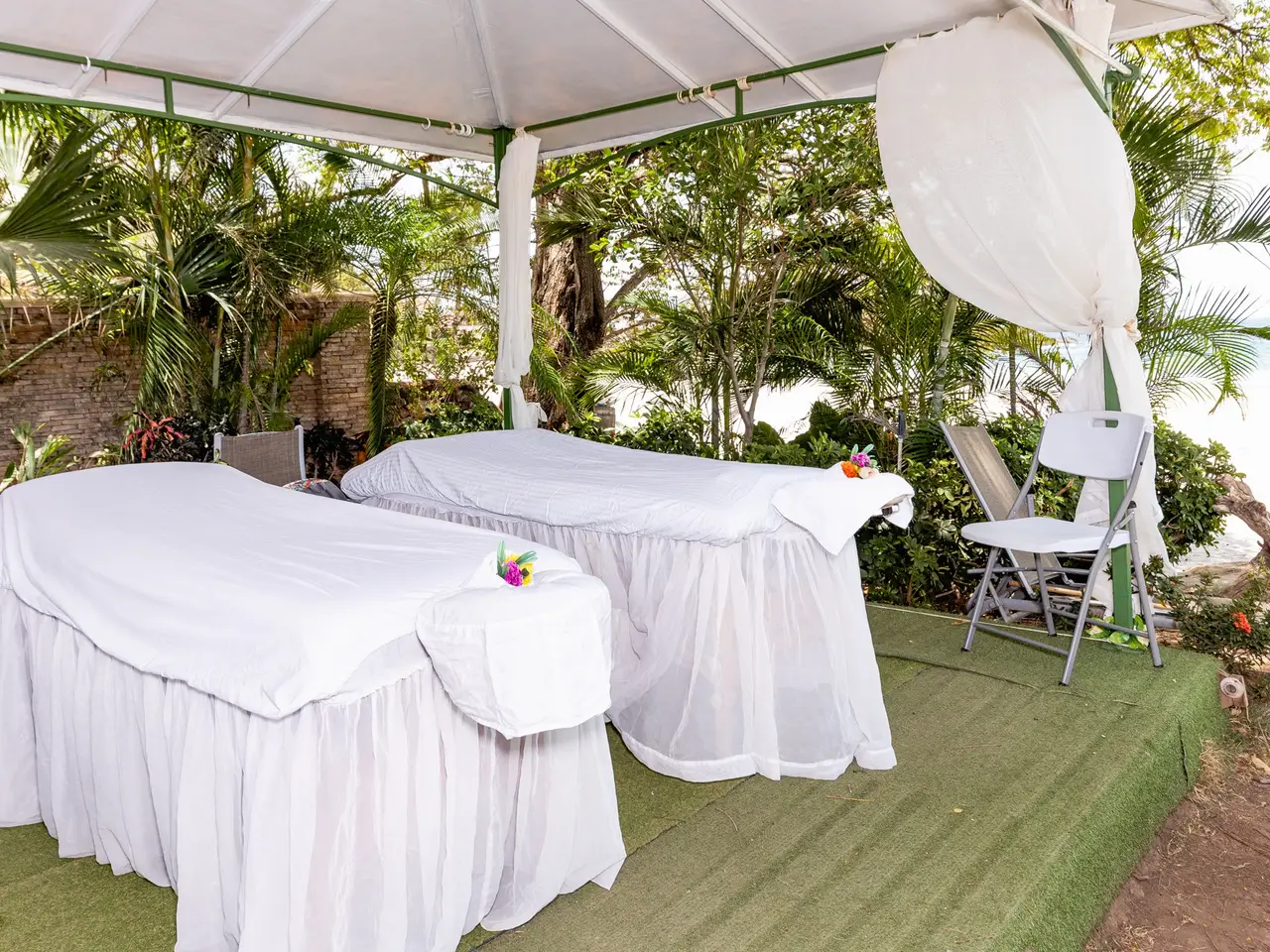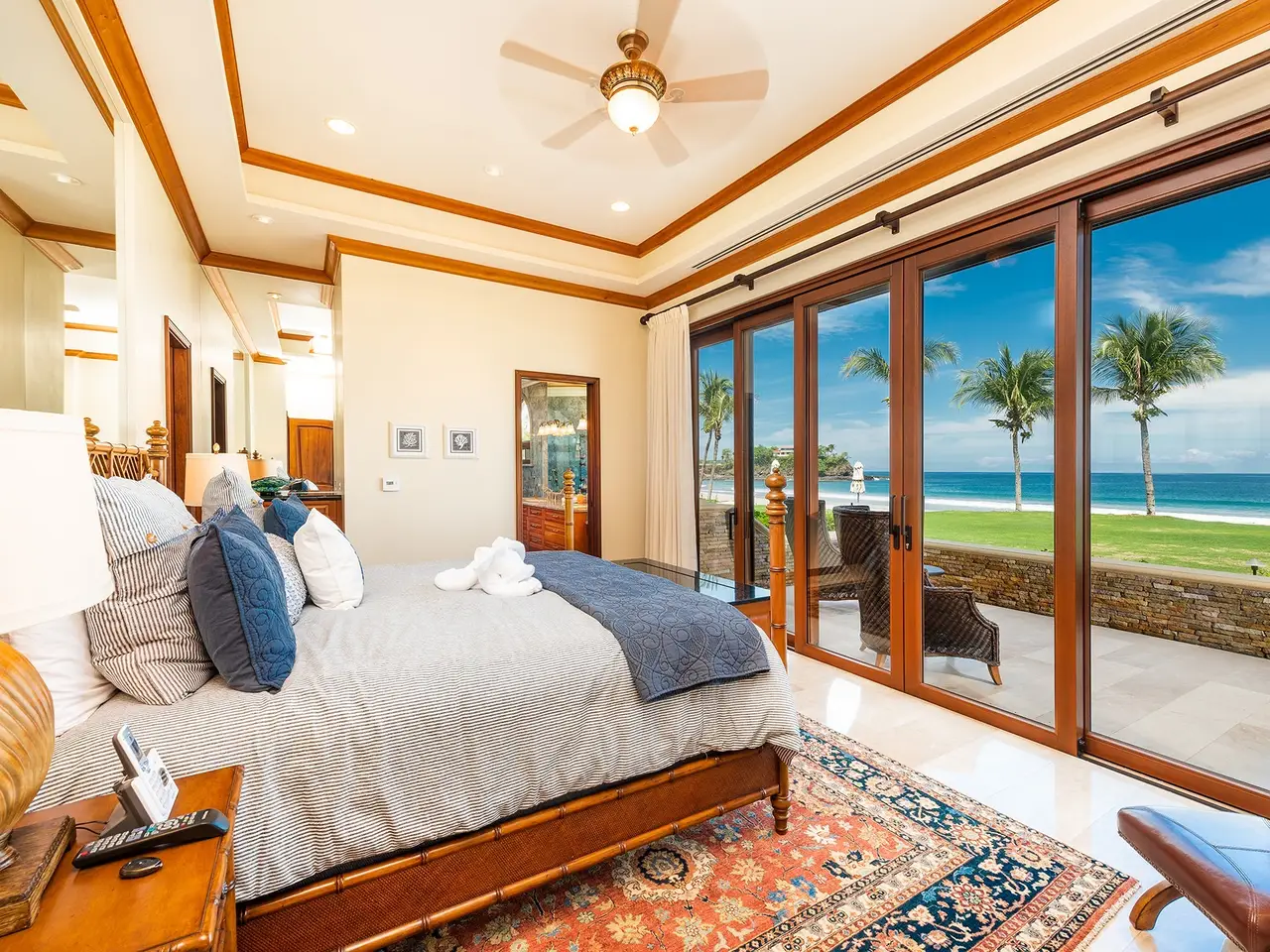 Experience luxury living at Palms #33, an exquisite, titled beachfront property in the heart of Flamingo, Guanacaste, Costa Rica. This stunning condo is part of The Palms, a prestigious development featuring 34 exclusive condos on pristine white sands. As you enter Palms #33, you'll be greeted by elegant travertine floors, high ceilings, and an incredible wide-open view of Flamingo Beach. Spanning 2,831 square feet, this luxurious condo offers 3 bedrooms and 3.5 bathrooms, ensuring ample space for comfort and relaxation. The kitchen is a chef's dream, featuring a spacious design, Sub-Zero and Viking appliances, green granite countertops, and ample space to entertain friends and family. Adjacent to the dining area is a beautiful bar with onyx stone that lights up. The area is surrounded by an atrium with a lush jungle and garden on one side and a breathtaking ocean view on the other. You and your guests are going to be in awe of this gorgeous setting! Palms #33 comes fully-furnished with exquisite high-end furniture. It is turn-key and ready for you! This condo would make a great permanent residence or it could continue as a vacation rental. There are two large oceanfront master suites that overlook the Catalina Islands. The suites boast king beds that face the ocean with roll-up TVs at the end of the beds for added luxury. Each has a massive spa-like ensuite bathroom covered in granite stone with make up counters, two sinks, showers, and oversized bathtubs. There is also a third guest bedroom that is equally as beautiful with a king bed and ensuite bathroom with a shower. All along the front of the condo, including off the 2 master suites and the living area, are patio doors that completely open up, allowing you to enjoy the seamless transition between indoor and outdoor living. The patio offers a perfect space for gatherings and lounging, surrounded by gorgeous palm trees and the Pacific ocean. Being a ground floor corner unit, Palms #33 offers a spacious outdoor area and easy access to the beach. Across a soft grassy front yard, you are steps away from the pristine white sand and warm tropical waters! The Palms is a gated community offering 24-hour security with parking, a large community BBQ area, a gym with an ocean view, 2 swimming pools, luxury lounge chairs, onsite massage therapists, and use of standup paddle boards, sea kayaks, and snorkeling equipment. The infinity beachfront swimming pool and an adult pool share a bar, providing the perfect setting for enjoying a cocktail while watching the beautiful sunset over the Pacific Ocean. The community is within walking distance of local restaurants and the new Flamingo Marina. It is minutes away from groceries, medical, a casino, an equestrian center, schools, and many other restaurants. Playa Flamingo is known as the Beverly Hills of Costa Rica, offering luxurious homes and condos on the beach and in the nearby hills. The sand is soft and the bay is perfect for playing in the waves. With less than 5% of Costa Rica's coastline titled, Palms #33 presents a rare opportunity to own a titled white sand beachfront property. Don't miss the chance to make Palms #33 your luxurious beachfront retreat! Reach out to us today to secure a private viewing.
