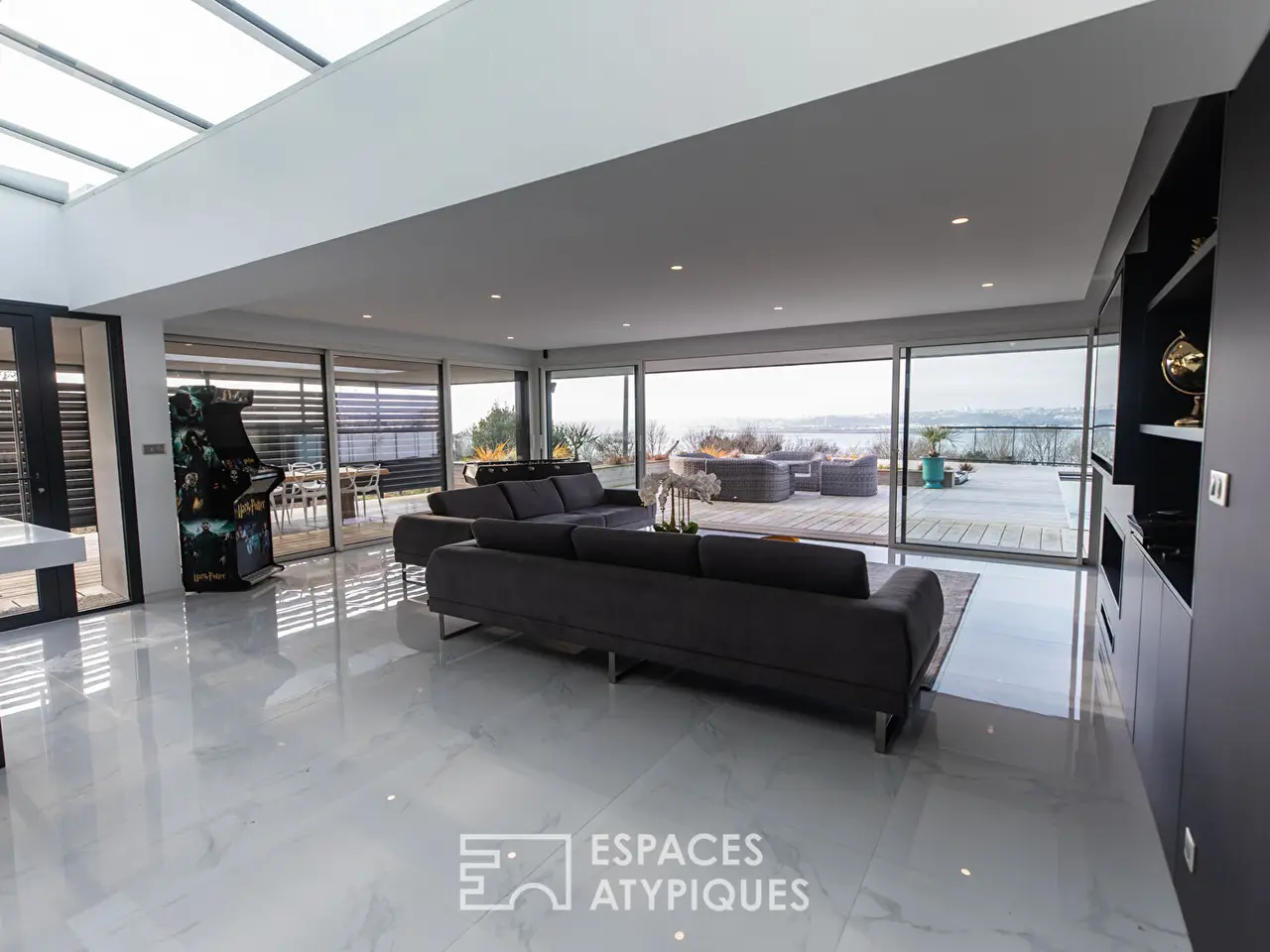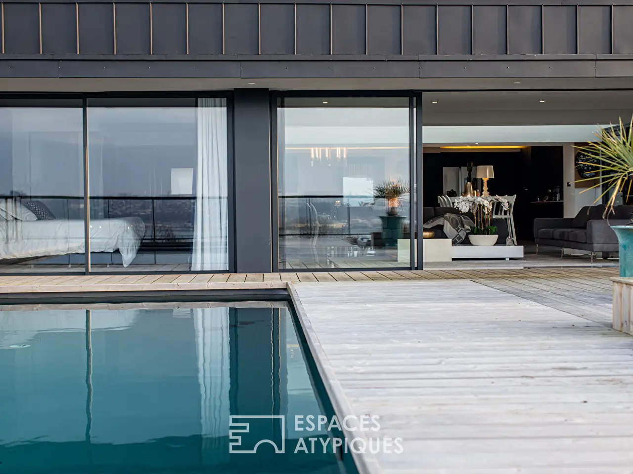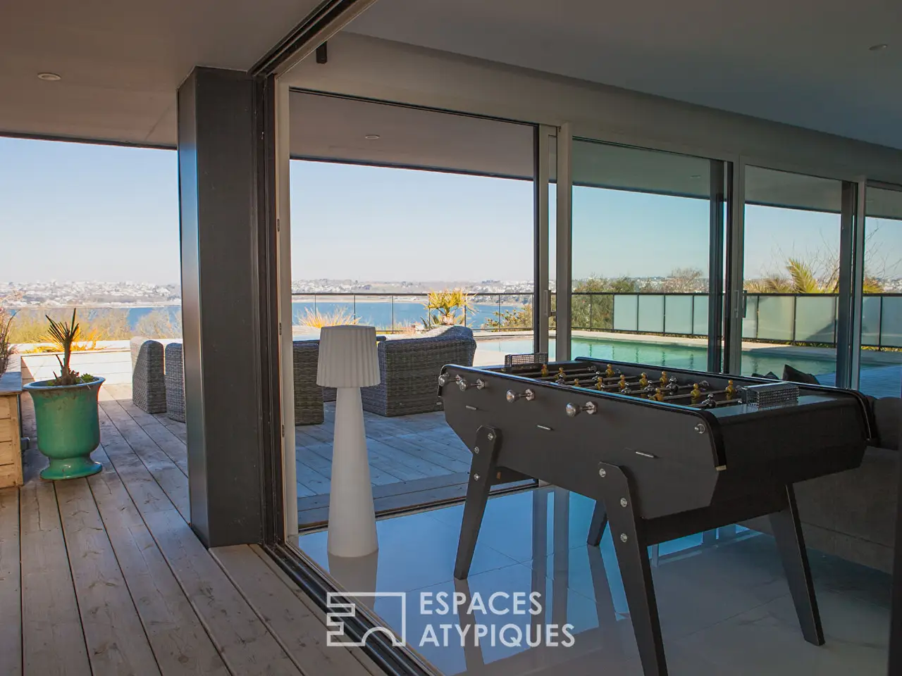 Located in the town of Plougastel-Daoulas, placed in a dominant position facing the sea, this villa of 300 m2 with swimming pool is erected on a plot of approximately 1600 m2. Nestled in peace, this resolutely contemporary property multiplies the sea views of the harbor of Brest to offer, in the evening, the spectacle of sunsets over the sea and the lights that illuminate the city and its port. Past the entrance, we are literally caught up in the panorama before our eyes. The sculptural living room of more than 90 m2 plays with minimalism so that the sea view always remains in the foreground. Here, the lounge-living room and kitchen spaces come together to decline softness, light and color, and display, in a contemporary vein, a spirit of conviviality. The modern kitchen is adorned with a central island allowing you to have lunch with the family. The masterful living room of almost 45 m2 and its large bay windows, abolishes the border between the interior and the exterior to open onto the terrace and its breathtaking view. In the continuity we discover a very large parental suite widely open on the terrace and its swimming pool and equipped with an XXL dressing room and a bathroom. A back kitchen completes the services of this first level. A flight of steps leads us to the first level and serves 4 generous bedrooms, 3 of which open onto the big blue, and a bathroom. The lower level, meanwhile, houses an independent apartment of more than 60 m2 to accommodate family, friends, or people wishing to develop a professional or rental activity independently. It consists of a kitchen, a living room, 2 bedrooms and a bathroom. This level also houses a gym that can easily be transformed into a projection room, a wine cellar, a double garage of 55 m2 and a technical room. On the outside, fitted out with several spaces, the terrace and its unparalleled view of the maritime ballet will allow you to share convivial moments and dive into the azure blue of the swimming pool for refreshing swims to the extent of your desires. In the evening, you can enjoy the wonderful sunset over the sea and the city of Brest comfortably installed in the jacuzzi. Adjoining the house, sheltered from prying eyes, we discover a real living room with a summer kitchen and its dining area will certainly allow you to spend real moments of sharing with family or friends. To complete the services of this property, the property has a double carport and a storage space. Graphic and refined lines, a magnificent luminosity, very beautiful volumes, comfortable and functional spaces, are the assets of this beautiful house ideally located? an invitation to the sweetness of life. This property, unique in its kind, offering a sea view, with these sublime sunsets, an exceptional quality of life, a magical place will delight lovers of contemporary habitat with sea spray. Here, the city, although very close, is nothing more than a distant memory: you can contemplate it but not hear it. Located a few 10 minutes from the city center of Brest, 3 km from amenities and a few steps from the seaside ENERGY CLASS: B / CLIMATE CLASS: A. Estimated average amount of annual energy expenditure for standard use, based on energy prices for 2021: between EUR1,500 and EUR2,060 Contact: Laurent on 06.62.33.89.91 RSAC: 852199579 BRESTREF. 1543EAFAdditional information* 12 rooms* 7 bedrooms* 1 bathroom* 2 shower rooms* Floor : 1* Outdoor space : 1100 SQM* Parking : 6 parking spaces* Property tax : 1 818 €Energy Performance Certificate Primary energy consumption b : 81 kWh/m2.yearHigh performance housing*A*81kWh/m2.year2*kg CO2/m2.year B*C*D*E*F*G Extremely poor housing performance* Of which greenhouse gas emissions a : 2 k