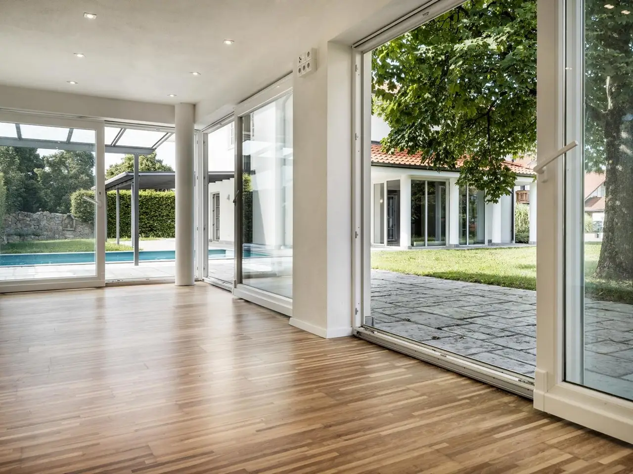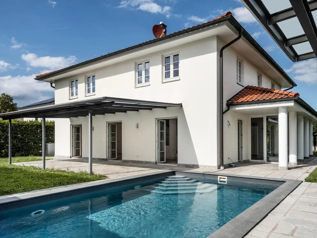 Welcome to a property that combines the lifestyle of Tuscany with the demands of modern living. This prestigious, detached villa with approx. 260 m² of living space offers you a stylish retreat - completely ready to move into and available immediately. Here you can expect not only well thought-out architecture, but also numerous amenities such as a heated outdoor pool, a light-flooded fitness pavilion, a spacious double garage, high-quality materials and a garden to relax and feel good. Even at first glance, the villa impresses with its harmonious, Tuscan-inspired design: Two full storeys under an elegant tent roof lend the house presence and timeless beauty. The classic façade design is complemented by natural stone terraces and a spacious driveway - here you can reside in style. The heart of the property is undoubtedly the open-plan living, cooking and dining area as the communicative center of the house. More than 80 m² of pure space, flooded with natural light thanks to numerous floor-to-ceiling windows. An ornate brick-built stove provides cozy warmth, which extends through the open gallery to the upper floor. The stylish bay window in the dining room opens up a picturesque view of the garden - a special treat at any time of year. From here you have direct access to the spacious south and west-facing terraces. The south-facing terrace in particular, with its modern glass and steel roofing, invites you to enjoy unforgettable summer evenings - outdoor living at the highest level. The kitchen is open-plan yet discreetly separated - perfect for anyone who enjoys entertaining guests or cooking together with the family. Every amateur chef's heart beats faster here: high-quality appliances, gas hob, Teppan Yaki and a well thought-out storage space concept plus pantry leave nothing to be desired. A practical utility room with direct access to the cellar, a guest WC and a stylish vestibule with checkroom round off the first floor in functional terms. The upper floor impresses with its full room height and offers a well thought-out room program: - Master bedroom with walk-in dressing room and direct access to the luxurious master bathroom - Free-standing bath, floor-level shower, two washbasins and separate WC - Two spacious, bright children's or guest rooms - Further bathroom with shower - Study with custom-made fitted wardrobes - perfect for a home office An absolute highlight is the fitness pavilion built in 2010, which can just as easily be used as an office, master bedroom or guest area: With two glazed sides and generous sliding doors, this creates a room that can be used all year round with fantastic views of the pool, garden and house. The adjoining L-shaped terrace is covered and, with water and electricity connections, provides the perfect setting for a hot tub or outdoor kitchen. The 8 x 4 m heated pool blends harmoniously into the garden design - a place for relaxation, sport and joie de vivre. The ensemble is framed by high-quality natural stone terraces that offer a variety of uses - whether sun loungers, lounging or dining in the open air. Perfectly thought out - inside and out: - Completely level plot with wide driveway - Double garage & additional outdoor parking spaces - Professionally landscaped garden with automatic irrigation & own well - Two covered terrace areas for comfort regardless of the weather Another advantage that you can use in the foreseeable future: Currently, traffic from the nearby but invisible B12 is occasionally perceptible in the garden area - a factor that will improve considerably in the near future, however: With the ongoing expansion of the A94 highway further away, which directly connects Munich, Passau and Austria, this route will take over the majority of through traffic in the future. For you, this means: a value-enhancing location development thanks to fast connections, especially to Munich, and significantly more peace and quiet in your own garden in just one to two years' time. Conclusion: A villa for people with a sense of aesthetics and quality of life. This exceptional property is perfect for anyone who wants to combine Mediterranean flair, functional design and exclusive furnishings. Whether as a stylish family home, a prestigious domicile for couples or as a retreat with vacation character - this villa is far more than just a house: it is a lifestyle.
