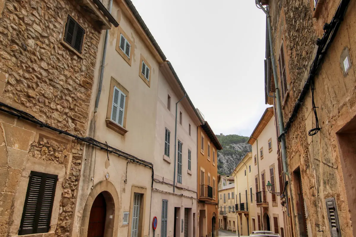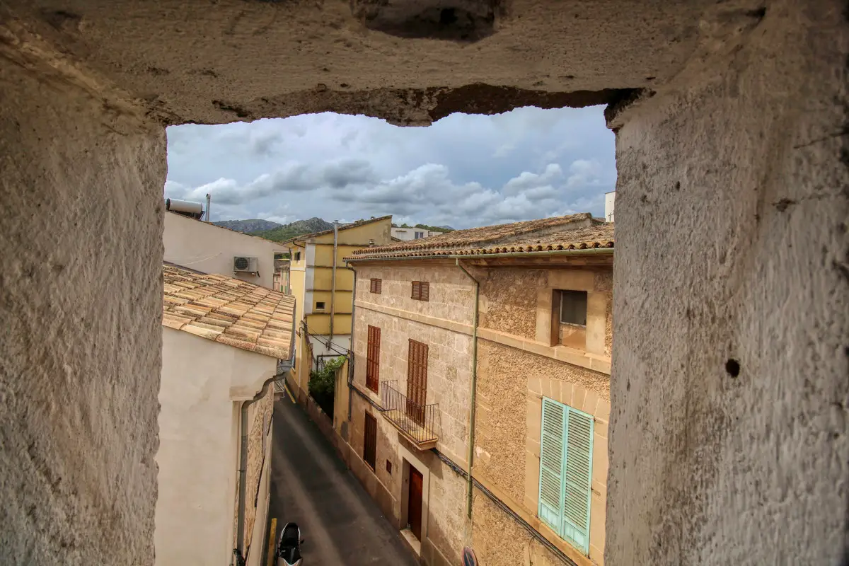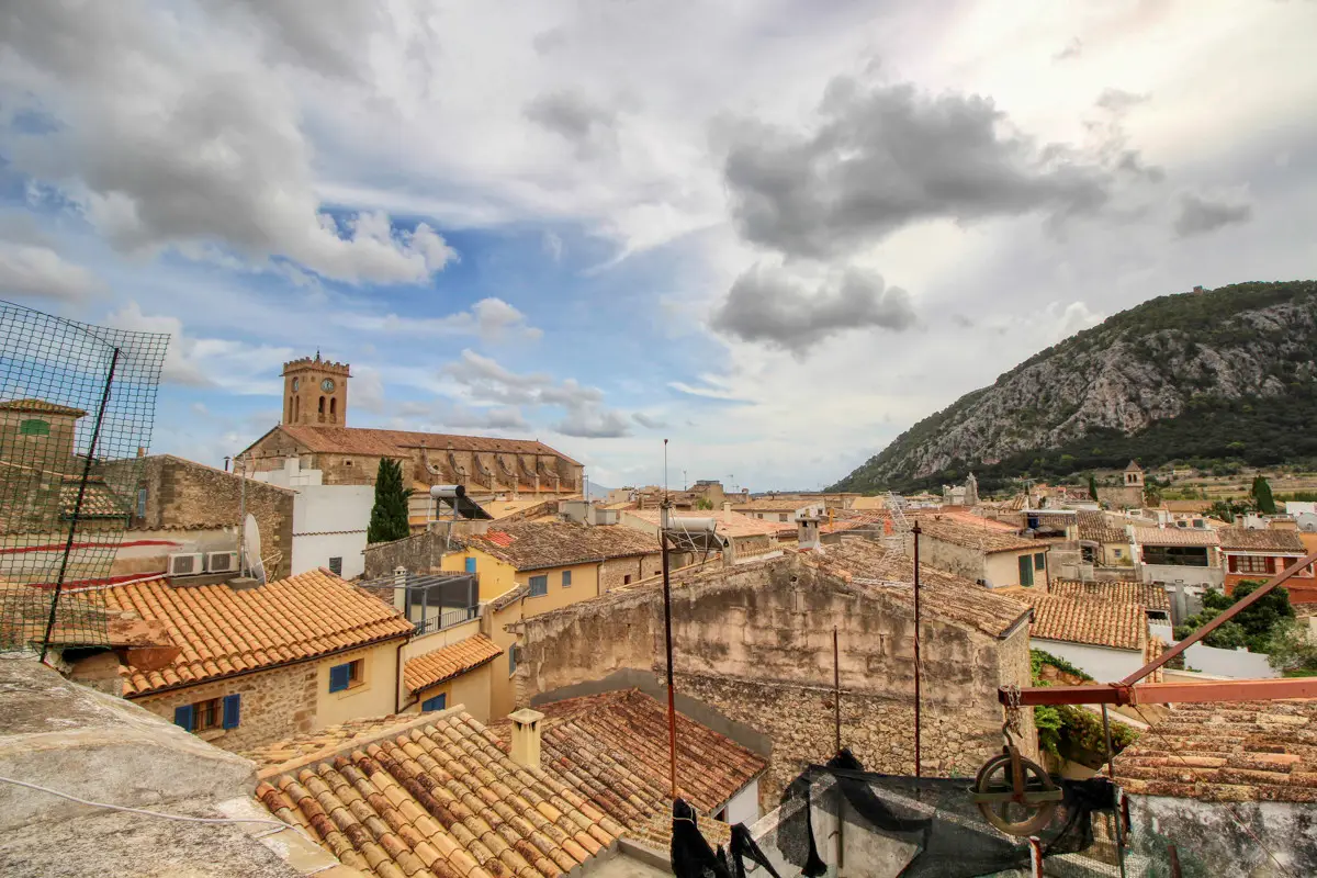 Large house for sale, with garage, small interior patio and terraces with views to the village of Pollensa and Puig de María. Situated on a corner in the old town of Pollensa, this interesting house with thick stone walls and distributed over three floors. A total of about 255 square metres, 96 on the ground floor, 87 on the first floor and on the second floor 72 square metres of warehouse space with sloping roofs on various levels. On the ground floor cosy inner courtyard of approximately 12 square meters, adjoining is a room of approximately 9 square meters extra, ideal to enlarge the courtyard. Spacious entrance hall of about 40 meters with high ceilings, connected to the garage with space for one vehicle and easy access, the staircase leads to an intermediate floor where the large kitchen of more than 30 meters is located, on the first floor the bathroom using the stairwell and four bedrooms, the loft on the third floor leads to several upper terraces. The property is a sturdy traditional house which still retains its style. It features a stone façade, all walls about 70 centimetres thick, high ceilings with wooden beams, large old north wooden doors and a beautiful semicircular staircase. With a beautiful reform this property has a lot of potential.